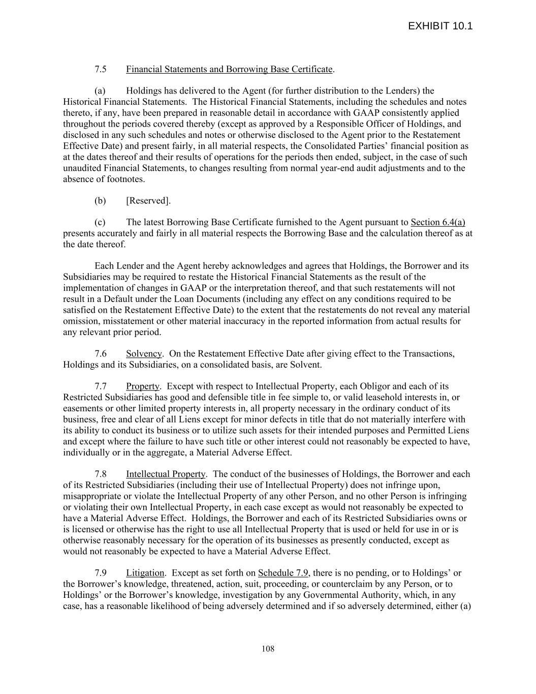 7.5 Financial Statements and Borrowing Base Certificate. (a) Holdings has delivered to the Agent (for further distribution to the Lenders) the Historical Financial Statements. The Historical Financial Statements, including the schedules and notes thereto, if any, have been prepared in reasonable detail in accordance with GAAP consistently applied throughout the periods covered thereby (except as approved by a Responsible Officer of Holdings, and disclosed in any such schedules and notes or otherwise disclosed to the Agent prior to the Restatement Effective Date) and present fairly, in all material respects, the Consolidated Parties’ financial position as at the dates thereof and their results of operations for the periods then ended, subject, in the case of such unaudited Financial Statements, to changes resulting from normal year-end audit adjustments and to the absence of footnotes. (b) [Reserved]. (c) The latest Borrowing Base Certificate furnished to the Agent pursuant to Section 6.4(a) presents accurately and fairly in all material respects the Borrowing Base and the calculation thereof as at the date thereof. Each Lender and the Agent hereby acknowledges and agrees that Holdings, the Borrower and its Subsidiaries may be required to restate the Historical Financial Statements as the result of the implementation of changes in GAAP or the interpretation thereof, and that such restatements will not result in a Default under the Loan Documents (including any effect on any conditions required to be satisfied on the Restatement Effective Date) to the extent that the restatements do not reveal any material omission, misstatement or other material inaccuracy in the reported information from actual results for any relevant prior period. 7.6 Solvency. On the Restatement Effective Date after giving effect to the Transactions, Holdings and its Subsidiaries, on a consolidated basis, are Solvent. 7.7 Property. Except with respect to Intellectual Property, each Obligor and each of its Restricted Subsidiaries has good and defensible title in fee simple to, or valid leasehold interests in, or easements or other limited property interests in, all property necessary in the ordinary conduct of its business, free and clear of all Liens except for minor defects in title that do not materially interfere with its ability to conduct its business or to utilize such assets for their intended purposes and Permitted Liens and except where the failure to have such title or other interest could not reasonably be expected to have, individually or in the aggregate, a Material Adverse Effect. 7.8 Intellectual Property. The conduct of the businesses of Holdings, the Borrower and each of its Restricted Subsidiaries (including their use of Intellectual Property) does not infringe upon, misappropriate or violate the Intellectual Property of any other Person, and no other Person is infringing or violating their own Intellectual Property, in each case except as would not reasonably be expected to have a Material Adverse Effect. Holdings, the Borrower and each of its Restricted Subsidiaries owns or is licensed or otherwise has the right to use all Intellectual Property that is used or held for use in or is otherwise reasonably necessary for the operation of its businesses as presently conducted, except as would not reasonably be expected to have a Material Adverse Effect. 7.9 Litigation. Except as set forth on Schedule 7.9, there is no pending, or to Holdings’ or the Borrower’s knowledge, threatened, action, suit, proceeding, or counterclaim by any Person, or to Holdings’ or the Borrower’s knowledge, investigation by any Governmental Authority, which, in any case, has a reasonable likelihood of being adversely determined and if so adversely determined, either (a) 108 EXHIBIT 10.1