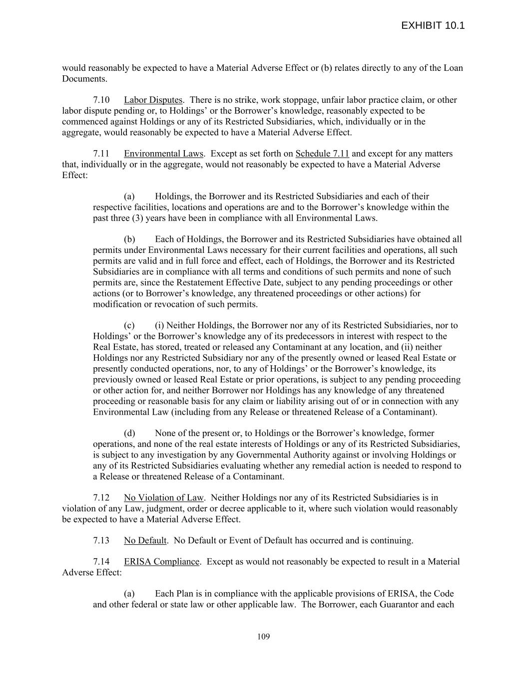 would reasonably be expected to have a Material Adverse Effect or (b) relates directly to any of the Loan Documents. 7.10 Labor Disputes. There is no strike, work stoppage, unfair labor practice claim, or other labor dispute pending or, to Holdings’ or the Borrower’s knowledge, reasonably expected to be commenced against Holdings or any of its Restricted Subsidiaries, which, individually or in the aggregate, would reasonably be expected to have a Material Adverse Effect. 7.11 Environmental Laws. Except as set forth on Schedule 7.11 and except for any matters that, individually or in the aggregate, would not reasonably be expected to have a Material Adverse Effect: (a) Holdings, the Borrower and its Restricted Subsidiaries and each of their respective facilities, locations and operations are and to the Borrower’s knowledge within the past three (3) years have been in compliance with all Environmental Laws. (b) Each of Holdings, the Borrower and its Restricted Subsidiaries have obtained all permits under Environmental Laws necessary for their current facilities and operations, all such permits are valid and in full force and effect, each of Holdings, the Borrower and its Restricted Subsidiaries are in compliance with all terms and conditions of such permits and none of such permits are, since the Restatement Effective Date, subject to any pending proceedings or other actions (or to Borrower’s knowledge, any threatened proceedings or other actions) for modification or revocation of such permits. (c) (i) Neither Holdings, the Borrower nor any of its Restricted Subsidiaries, nor to Holdings’ or the Borrower’s knowledge any of its predecessors in interest with respect to the Real Estate, has stored, treated or released any Contaminant at any location, and (ii) neither Holdings nor any Restricted Subsidiary nor any of the presently owned or leased Real Estate or presently conducted operations, nor, to any of Holdings’ or the Borrower’s knowledge, its previously owned or leased Real Estate or prior operations, is subject to any pending proceeding or other action for, and neither Borrower nor Holdings has any knowledge of any threatened proceeding or reasonable basis for any claim or liability arising out of or in connection with any Environmental Law (including from any Release or threatened Release of a Contaminant). (d) None of the present or, to Holdings or the Borrower’s knowledge, former operations, and none of the real estate interests of Holdings or any of its Restricted Subsidiaries, is subject to any investigation by any Governmental Authority against or involving Holdings or any of its Restricted Subsidiaries evaluating whether any remedial action is needed to respond to a Release or threatened Release of a Contaminant. 7.12 No Violation of Law. Neither Holdings nor any of its Restricted Subsidiaries is in violation of any Law, judgment, order or decree applicable to it, where such violation would reasonably be expected to have a Material Adverse Effect. 7.13 No Default. No Default or Event of Default has occurred and is continuing. 7.14 ERISA Compliance. Except as would not reasonably be expected to result in a Material Adverse Effect: (a) Each Plan is in compliance with the applicable provisions of ERISA, the Code and other federal or state law or other applicable law. The Borrower, each Guarantor and each 109 EXHIBIT 10.1