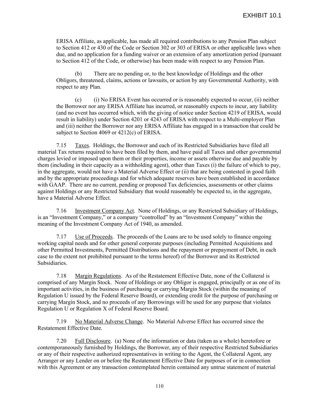 ERISA Affiliate, as applicable, has made all required contributions to any Pension Plan subject to Section 412 or 430 of the Code or Section 302 or 303 of ERISA or other applicable laws when due, and no application for a funding waiver or an extension of any amortization period (pursuant to Section 412 of the Code, or otherwise) has been made with respect to any Pension Plan. (b) There are no pending or, to the best knowledge of Holdings and the other Obligors, threatened, claims, actions or lawsuits, or action by any Governmental Authority, with respect to any Plan. (c) (i) No ERISA Event has occurred or is reasonably expected to occur, (ii) neither the Borrower nor any ERISA Affiliate has incurred, or reasonably expects to incur, any liability (and no event has occurred which, with the giving of notice under Section 4219 of ERISA, would result in liability) under Section 4201 or 4243 of ERISA with respect to a Multi-employer Plan and (iii) neither the Borrower nor any ERISA Affiliate has engaged in a transaction that could be subject to Section 4069 or 4212(c) of ERISA. 7.15 Taxes. Holdings, the Borrower and each of its Restricted Subsidiaries have filed all material Tax returns required to have been filed by them, and have paid all Taxes and other governmental charges levied or imposed upon them or their properties, income or assets otherwise due and payable by them (including in their capacity as a withholding agent), other than Taxes (i) the failure of which to pay, in the aggregate, would not have a Material Adverse Effect or (ii) that are being contested in good faith and by the appropriate proceedings and for which adequate reserves have been established in accordance with GAAP. There are no current, pending or proposed Tax deficiencies, assessments or other claims against Holdings or any Restricted Subsidiary that would reasonably be expected to, in the aggregate, have a Material Adverse Effect. 7.16 Investment Company Act. None of Holdings, or any Restricted Subsidiary of Holdings, is an “Investment Company,” or a company “controlled” by an “Investment Company” within the meaning of the Investment Company Act of 1940, as amended. 7.17 Use of Proceeds. The proceeds of the Loans are to be used solely to finance ongoing working capital needs and for other general corporate purposes (including Permitted Acquisitions and other Permitted Investments, Permitted Distributions and the repayment or prepayment of Debt, in each case to the extent not prohibited pursuant to the terms hereof) of the Borrower and its Restricted Subsidiaries. 7.18 Margin Regulations. As of the Restatement Effective Date, none of the Collateral is comprised of any Margin Stock. None of Holdings or any Obligor is engaged, principally or as one of its important activities, in the business of purchasing or carrying Margin Stock (within the meaning of Regulation U issued by the Federal Reserve Board), or extending credit for the purpose of purchasing or carrying Margin Stock, and no proceeds of any Borrowings will be used for any purpose that violates Regulation U or Regulation X of Federal Reserve Board. 7.19 No Material Adverse Change. No Material Adverse Effect has occurred since the Restatement Effective Date. 7.20 Full Disclosure. (a) None of the information or data (taken as a whole) heretofore or contemporaneously furnished by Holdings, the Borrower, any of their respective Restricted Subsidiaries or any of their respective authorized representatives in writing to the Agent, the Collateral Agent, any Arranger or any Lender on or before the Restatement Effective Date for purposes of or in connection with this Agreement or any transaction contemplated herein contained any untrue statement of material 110 EXHIBIT 10.1