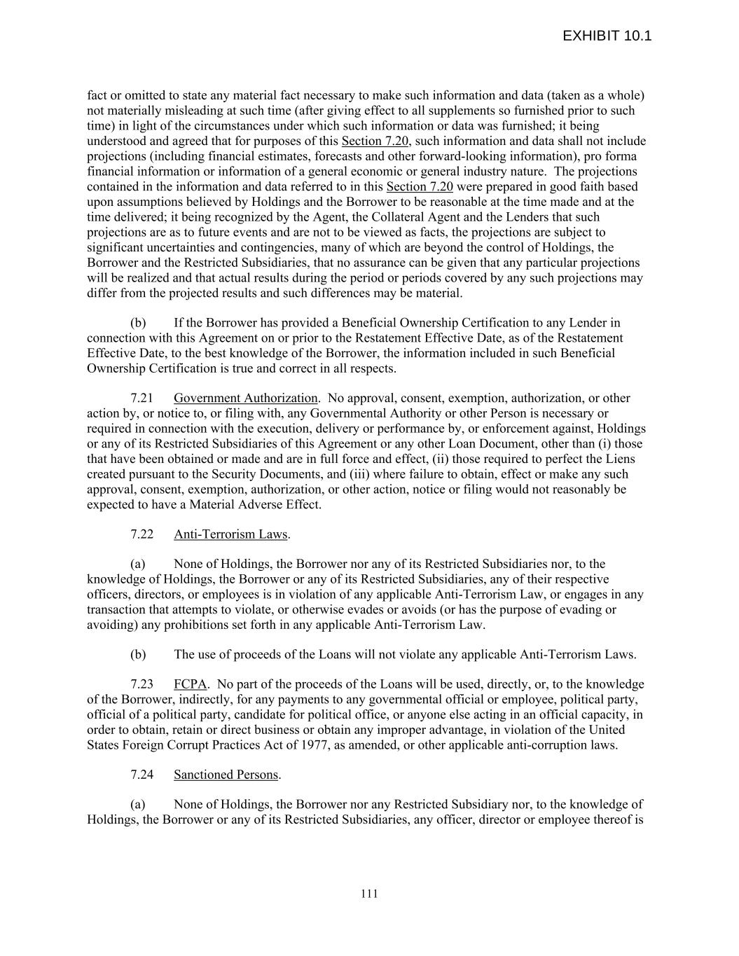 fact or omitted to state any material fact necessary to make such information and data (taken as a whole) not materially misleading at such time (after giving effect to all supplements so furnished prior to such time) in light of the circumstances under which such information or data was furnished; it being understood and agreed that for purposes of this Section 7.20, such information and data shall not include projections (including financial estimates, forecasts and other forward-looking information), pro forma financial information or information of a general economic or general industry nature. The projections contained in the information and data referred to in this Section 7.20 were prepared in good faith based upon assumptions believed by Holdings and the Borrower to be reasonable at the time made and at the time delivered; it being recognized by the Agent, the Collateral Agent and the Lenders that such projections are as to future events and are not to be viewed as facts, the projections are subject to significant uncertainties and contingencies, many of which are beyond the control of Holdings, the Borrower and the Restricted Subsidiaries, that no assurance can be given that any particular projections will be realized and that actual results during the period or periods covered by any such projections may differ from the projected results and such differences may be material. (b) If the Borrower has provided a Beneficial Ownership Certification to any Lender in connection with this Agreement on or prior to the Restatement Effective Date, as of the Restatement Effective Date, to the best knowledge of the Borrower, the information included in such Beneficial Ownership Certification is true and correct in all respects. 7.21 Government Authorization. No approval, consent, exemption, authorization, or other action by, or notice to, or filing with, any Governmental Authority or other Person is necessary or required in connection with the execution, delivery or performance by, or enforcement against, Holdings or any of its Restricted Subsidiaries of this Agreement or any other Loan Document, other than (i) those that have been obtained or made and are in full force and effect, (ii) those required to perfect the Liens created pursuant to the Security Documents, and (iii) where failure to obtain, effect or make any such approval, consent, exemption, authorization, or other action, notice or filing would not reasonably be expected to have a Material Adverse Effect. 7.22 Anti-Terrorism Laws. (a) None of Holdings, the Borrower nor any of its Restricted Subsidiaries nor, to the knowledge of Holdings, the Borrower or any of its Restricted Subsidiaries, any of their respective officers, directors, or employees is in violation of any applicable Anti-Terrorism Law, or engages in any transaction that attempts to violate, or otherwise evades or avoids (or has the purpose of evading or avoiding) any prohibitions set forth in any applicable Anti-Terrorism Law. (b) The use of proceeds of the Loans will not violate any applicable Anti-Terrorism Laws. 7.23 FCPA. No part of the proceeds of the Loans will be used, directly, or, to the knowledge of the Borrower, indirectly, for any payments to any governmental official or employee, political party, official of a political party, candidate for political office, or anyone else acting in an official capacity, in order to obtain, retain or direct business or obtain any improper advantage, in violation of the United States Foreign Corrupt Practices Act of 1977, as amended, or other applicable anti-corruption laws. 7.24 Sanctioned Persons. (a) None of Holdings, the Borrower nor any Restricted Subsidiary nor, to the knowledge of Holdings, the Borrower or any of its Restricted Subsidiaries, any officer, director or employee thereof is 111 EXHIBIT 10.1