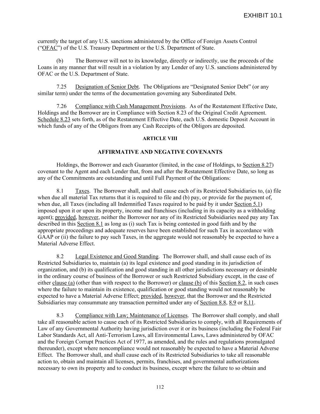 currently the target of any U.S. sanctions administered by the Office of Foreign Assets Control (“OFAC”) of the U.S. Treasury Department or the U.S. Department of State. (b) The Borrower will not to its knowledge, directly or indirectly, use the proceeds of the Loans in any manner that will result in a violation by any Lender of any U.S. sanctions administered by OFAC or the U.S. Department of State. 7.25 Designation of Senior Debt. The Obligations are “Designated Senior Debt” (or any similar term) under the terms of the documentation governing any Subordinated Debt. 7.26 Compliance with Cash Management Provisions. As of the Restatement Effective Date, Holdings and the Borrower are in Compliance with Section 8.23 of the Original Credit Agreement. Schedule 8.23 sets forth, as of the Restatement Effective Date, each U.S. domestic Deposit Account in which funds of any of the Obligors from any Cash Receipts of the Obligors are deposited. ARTICLE VIII AFFIRMATIVE AND NEGATIVE COVENANTS Holdings, the Borrower and each Guarantor (limited, in the case of Holdings, to Section 8.27) covenant to the Agent and each Lender that, from and after the Restatement Effective Date, so long as any of the Commitments are outstanding and until Full Payment of the Obligations: 8.1 Taxes. The Borrower shall, and shall cause each of its Restricted Subsidiaries to, (a) file when due all material Tax returns that it is required to file and (b) pay, or provide for the payment of, when due, all Taxes (including all Indemnified Taxes required to be paid by it under Section 5.1) imposed upon it or upon its property, income and franchises (including in its capacity as a withholding agent); provided, however, neither the Borrower nor any of its Restricted Subsidiaries need pay any Tax described in this Section 8.1 as long as (i) such Tax is being contested in good faith and by the appropriate proceedings and adequate reserves have been established for such Tax in accordance with GAAP or (ii) the failure to pay such Taxes, in the aggregate would not reasonably be expected to have a Material Adverse Effect. 8.2 Legal Existence and Good Standing. The Borrower shall, and shall cause each of its Restricted Subsidiaries to, maintain (a) its legal existence and good standing in its jurisdiction of organization, and (b) its qualification and good standing in all other jurisdictions necessary or desirable in the ordinary course of business of the Borrower or such Restricted Subsidiary except, in the case of either clause (a) (other than with respect to the Borrower) or clause (b) of this Section 8.2, in such cases where the failure to maintain its existence, qualification or good standing would not reasonably be expected to have a Material Adverse Effect; provided, however, that the Borrower and the Restricted Subsidiaries may consummate any transaction permitted under any of Section 8.8, 8.9 or 8.11. 8.3 Compliance with Law; Maintenance of Licenses. The Borrower shall comply, and shall take all reasonable action to cause each of its Restricted Subsidiaries to comply, with all Requirements of Law of any Governmental Authority having jurisdiction over it or its business (including the Federal Fair Labor Standards Act, all Anti-Terrorism Laws, all Environmental Laws, Laws administered by OFAC and the Foreign Corrupt Practices Act of 1977, as amended, and the rules and regulations promulgated thereunder), except where noncompliance would not reasonably be expected to have a Material Adverse Effect. The Borrower shall, and shall cause each of its Restricted Subsidiaries to take all reasonable action to, obtain and maintain all licenses, permits, franchises, and governmental authorizations necessary to own its property and to conduct its business, except where the failure to so obtain and 112 EXHIBIT 10.1