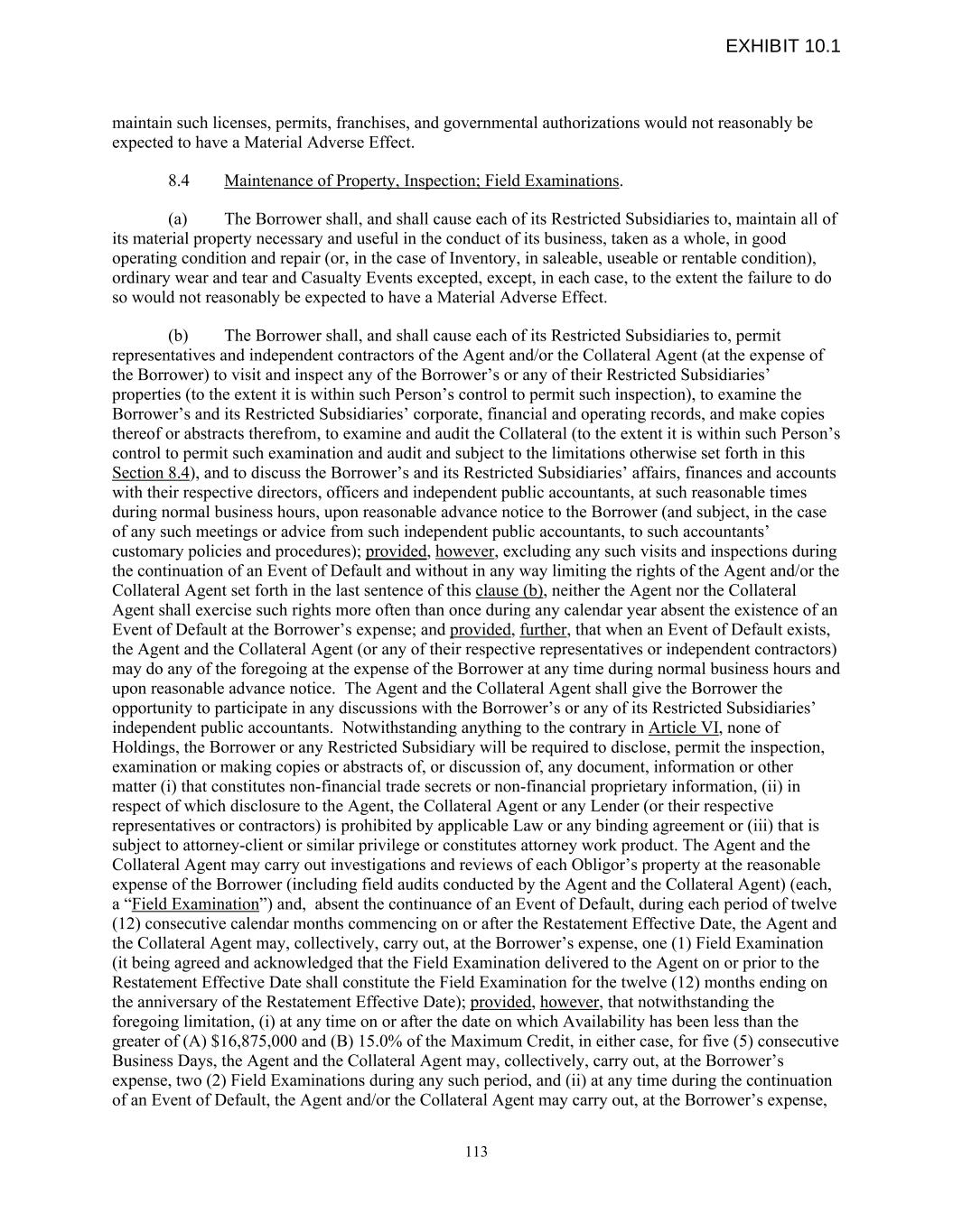 maintain such licenses, permits, franchises, and governmental authorizations would not reasonably be expected to have a Material Adverse Effect. 8.4 Maintenance of Property, Inspection; Field Examinations. (a) The Borrower shall, and shall cause each of its Restricted Subsidiaries to, maintain all of its material property necessary and useful in the conduct of its business, taken as a whole, in good operating condition and repair (or, in the case of Inventory, in saleable, useable or rentable condition), ordinary wear and tear and Casualty Events excepted, except, in each case, to the extent the failure to do so would not reasonably be expected to have a Material Adverse Effect. (b) The Borrower shall, and shall cause each of its Restricted Subsidiaries to, permit representatives and independent contractors of the Agent and/or the Collateral Agent (at the expense of the Borrower) to visit and inspect any of the Borrower’s or any of their Restricted Subsidiaries’ properties (to the extent it is within such Person’s control to permit such inspection), to examine the Borrower’s and its Restricted Subsidiaries’ corporate, financial and operating records, and make copies thereof or abstracts therefrom, to examine and audit the Collateral (to the extent it is within such Person’s control to permit such examination and audit and subject to the limitations otherwise set forth in this Section 8.4), and to discuss the Borrower’s and its Restricted Subsidiaries’ affairs, finances and accounts with their respective directors, officers and independent public accountants, at such reasonable times during normal business hours, upon reasonable advance notice to the Borrower (and subject, in the case of any such meetings or advice from such independent public accountants, to such accountants’ customary policies and procedures); provided, however, excluding any such visits and inspections during the continuation of an Event of Default and without in any way limiting the rights of the Agent and/or the Collateral Agent set forth in the last sentence of this clause (b), neither the Agent nor the Collateral Agent shall exercise such rights more often than once during any calendar year absent the existence of an Event of Default at the Borrower’s expense; and provided, further, that when an Event of Default exists, the Agent and the Collateral Agent (or any of their respective representatives or independent contractors) may do any of the foregoing at the expense of the Borrower at any time during normal business hours and upon reasonable advance notice. The Agent and the Collateral Agent shall give the Borrower the opportunity to participate in any discussions with the Borrower’s or any of its Restricted Subsidiaries’ independent public accountants. Notwithstanding anything to the contrary in Article VI, none of Holdings, the Borrower or any Restricted Subsidiary will be required to disclose, permit the inspection, examination or making copies or abstracts of, or discussion of, any document, information or other matter (i) that constitutes non-financial trade secrets or non-financial proprietary information, (ii) in respect of which disclosure to the Agent, the Collateral Agent or any Lender (or their respective representatives or contractors) is prohibited by applicable Law or any binding agreement or (iii) that is subject to attorney-client or similar privilege or constitutes attorney work product. The Agent and the Collateral Agent may carry out investigations and reviews of each Obligor’s property at the reasonable expense of the Borrower (including field audits conducted by the Agent and the Collateral Agent) (each, a “Field Examination”) and, absent the continuance of an Event of Default, during each period of twelve (12) consecutive calendar months commencing on or after the Restatement Effective Date, the Agent and the Collateral Agent may, collectively, carry out, at the Borrower’s expense, one (1) Field Examination (it being agreed and acknowledged that the Field Examination delivered to the Agent on or prior to the Restatement Effective Date shall constitute the Field Examination for the twelve (12) months ending on the anniversary of the Restatement Effective Date); provided, however, that notwithstanding the foregoing limitation, (i) at any time on or after the date on which Availability has been less than the greater of (A) $16,875,000 and (B) 15.0% of the Maximum Credit, in either case, for five (5) consecutive Business Days, the Agent and the Collateral Agent may, collectively, carry out, at the Borrower’s expense, two (2) Field Examinations during any such period, and (ii) at any time during the continuation of an Event of Default, the Agent and/or the Collateral Agent may carry out, at the Borrower’s expense, 113 EXHIBIT 10.1