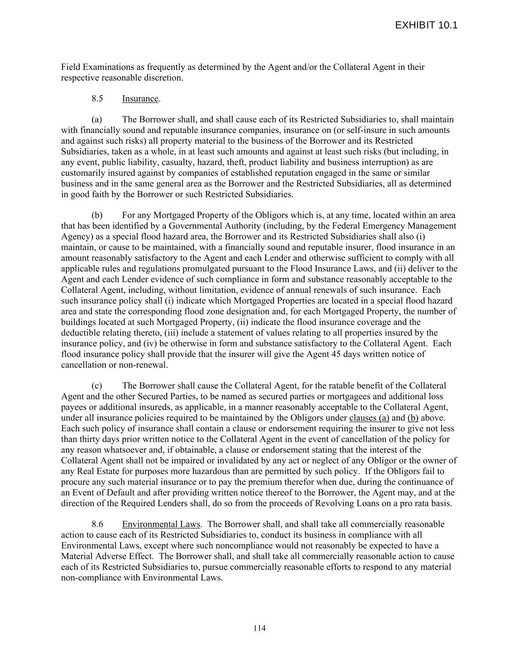 Field Examinations as frequently as determined by the Agent and/or the Collateral Agent in their respective reasonable discretion. 8.5 Insurance. (a) The Borrower shall, and shall cause each of its Restricted Subsidiaries to, shall maintain with financially sound and reputable insurance companies, insurance on (or self-insure in such amounts and against such risks) all property material to the business of the Borrower and its Restricted Subsidiaries, taken as a whole, in at least such amounts and against at least such risks (but including, in any event, public liability, casualty, hazard, theft, product liability and business interruption) as are customarily insured against by companies of established reputation engaged in the same or similar business and in the same general area as the Borrower and the Restricted Subsidiaries, all as determined in good faith by the Borrower or such Restricted Subsidiaries. (b) For any Mortgaged Property of the Obligors which is, at any time, located within an area that has been identified by a Governmental Authority (including, by the Federal Emergency Management Agency) as a special flood hazard area, the Borrower and its Restricted Subsidiaries shall also (i) maintain, or cause to be maintained, with a financially sound and reputable insurer, flood insurance in an amount reasonably satisfactory to the Agent and each Lender and otherwise sufficient to comply with all applicable rules and regulations promulgated pursuant to the Flood Insurance Laws, and (ii) deliver to the Agent and each Lender evidence of such compliance in form and substance reasonably acceptable to the Collateral Agent, including, without limitation, evidence of annual renewals of such insurance. Each such insurance policy shall (i) indicate which Mortgaged Properties are located in a special flood hazard area and state the corresponding flood zone designation and, for each Mortgaged Property, the number of buildings located at such Mortgaged Property, (ii) indicate the flood insurance coverage and the deductible relating thereto, (iii) include a statement of values relating to all properties insured by the insurance policy, and (iv) be otherwise in form and substance satisfactory to the Collateral Agent. Each flood insurance policy shall provide that the insurer will give the Agent 45 days written notice of cancellation or non-renewal. (c) The Borrower shall cause the Collateral Agent, for the ratable benefit of the Collateral Agent and the other Secured Parties, to be named as secured parties or mortgagees and additional loss payees or additional insureds, as applicable, in a manner reasonably acceptable to the Collateral Agent, under all insurance policies required to be maintained by the Obligors under clauses (a) and (b) above. Each such policy of insurance shall contain a clause or endorsement requiring the insurer to give not less than thirty days prior written notice to the Collateral Agent in the event of cancellation of the policy for any reason whatsoever and, if obtainable, a clause or endorsement stating that the interest of the Collateral Agent shall not be impaired or invalidated by any act or neglect of any Obligor or the owner of any Real Estate for purposes more hazardous than are permitted by such policy. If the Obligors fail to procure any such material insurance or to pay the premium therefor when due, during the continuance of an Event of Default and after providing written notice thereof to the Borrower, the Agent may, and at the direction of the Required Lenders shall, do so from the proceeds of Revolving Loans on a pro rata basis. 8.6 Environmental Laws. The Borrower shall, and shall take all commercially reasonable action to cause each of its Restricted Subsidiaries to, conduct its business in compliance with all Environmental Laws, except where such noncompliance would not reasonably be expected to have a Material Adverse Effect. The Borrower shall, and shall take all commercially reasonable action to cause each of its Restricted Subsidiaries to, pursue commercially reasonable efforts to respond to any material non-compliance with Environmental Laws. 114 EXHIBIT 10.1