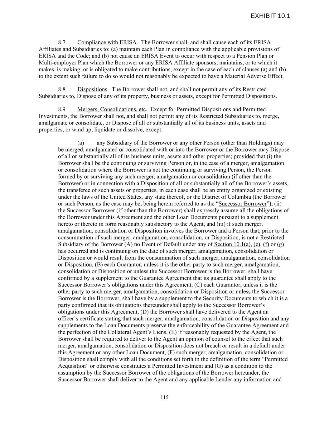 8.7 Compliance with ERISA. The Borrower shall, and shall cause each of its ERISA Affiliates and Subsidiaries to: (a) maintain each Plan in compliance with the applicable provisions of ERISA and the Code; and (b) not cause an ERISA Event to occur with respect to a Pension Plan or Multi-employer Plan which the Borrower or any ERISA Affiliate sponsors, maintains, or to which it makes, is making, or is obligated to make contributions, except in the case of each of clauses (a) and (b), to the extent such failure to do so would not reasonably be expected to have a Material Adverse Effect. 8.8 Dispositions. The Borrower shall not, and shall not permit any of its Restricted Subsidiaries to, Dispose of any of its property, business or assets, except for Permitted Dispositions. 8.9 Mergers, Consolidations, etc. Except for Permitted Dispositions and Permitted Investments, the Borrower shall not, and shall not permit any of its Restricted Subsidiaries to, merge, amalgamate or consolidate, or Dispose of all or substantially all of its business units, assets and properties, or wind up, liquidate or dissolve, except: (a) any Subsidiary of the Borrower or any other Person (other than Holdings) may be merged, amalgamated or consolidated with or into the Borrower or the Borrower may Dispose of all or substantially all of its business units, assets and other properties; provided that (i) the Borrower shall be the continuing or surviving Person or, in the case of a merger, amalgamation or consolidation where the Borrower is not the continuing or surviving Person, the Person formed by or surviving any such merger, amalgamation or consolidation (if other than the Borrower) or in connection with a Disposition of all or substantially all of the Borrower’s assets, the transferee of such assets or properties, in each case shall be an entity organized or existing under the laws of the United States, any state thereof, or the District of Columbia (the Borrower or such Person, as the case may be, being herein referred to as the “Successor Borrower”), (ii) the Successor Borrower (if other than the Borrower) shall expressly assume all the obligations of the Borrower under this Agreement and the other Loan Documents pursuant to a supplement hereto or thereto in form reasonably satisfactory to the Agent, and (iii) if such merger, amalgamation, consolidation or Disposition involves the Borrower and a Person that, prior to the consummation of such merger, amalgamation, consolidation, or Disposition, is not a Restricted Subsidiary of the Borrower (A) no Event of Default under any of Section 10.1(a), (e), (f) or (g) has occurred and is continuing on the date of such merger, amalgamation, consolidation or Disposition or would result from the consummation of such merger, amalgamation, consolidation or Disposition, (B) each Guarantor, unless it is the other party to such merger, amalgamation, consolidation or Disposition or unless the Successor Borrower is the Borrower, shall have confirmed by a supplement to the Guarantee Agreement that its guarantee shall apply to the Successor Borrower’s obligations under this Agreement, (C) each Guarantor, unless it is the other party to such merger, amalgamation, consolidation or Disposition or unless the Successor Borrower is the Borrower, shall have by a supplement to the Security Documents to which it is a party confirmed that its obligations thereunder shall apply to the Successor Borrower’s obligations under this Agreement, (D) the Borrower shall have delivered to the Agent an officer’s certificate stating that such merger, amalgamation, consolidation or Disposition and any supplements to the Loan Documents preserve the enforceability of the Guarantee Agreement and the perfection of the Collateral Agent’s Liens, (E) if reasonably requested by the Agent, the Borrower shall be required to deliver to the Agent an opinion of counsel to the effect that such merger, amalgamation, consolidation or Disposition does not breach or result in a default under this Agreement or any other Loan Document, (F) such merger, amalgamation, consolidation or Disposition shall comply with all the conditions set forth in the definition of the term “Permitted Acquisition” or otherwise constitutes a Permitted Investment and (G) as a condition to the assumption by the Successor Borrower of the obligations of the Borrower hereunder, the Successor Borrower shall deliver to the Agent and any applicable Lender any information and 115 EXHIBIT 10.1
