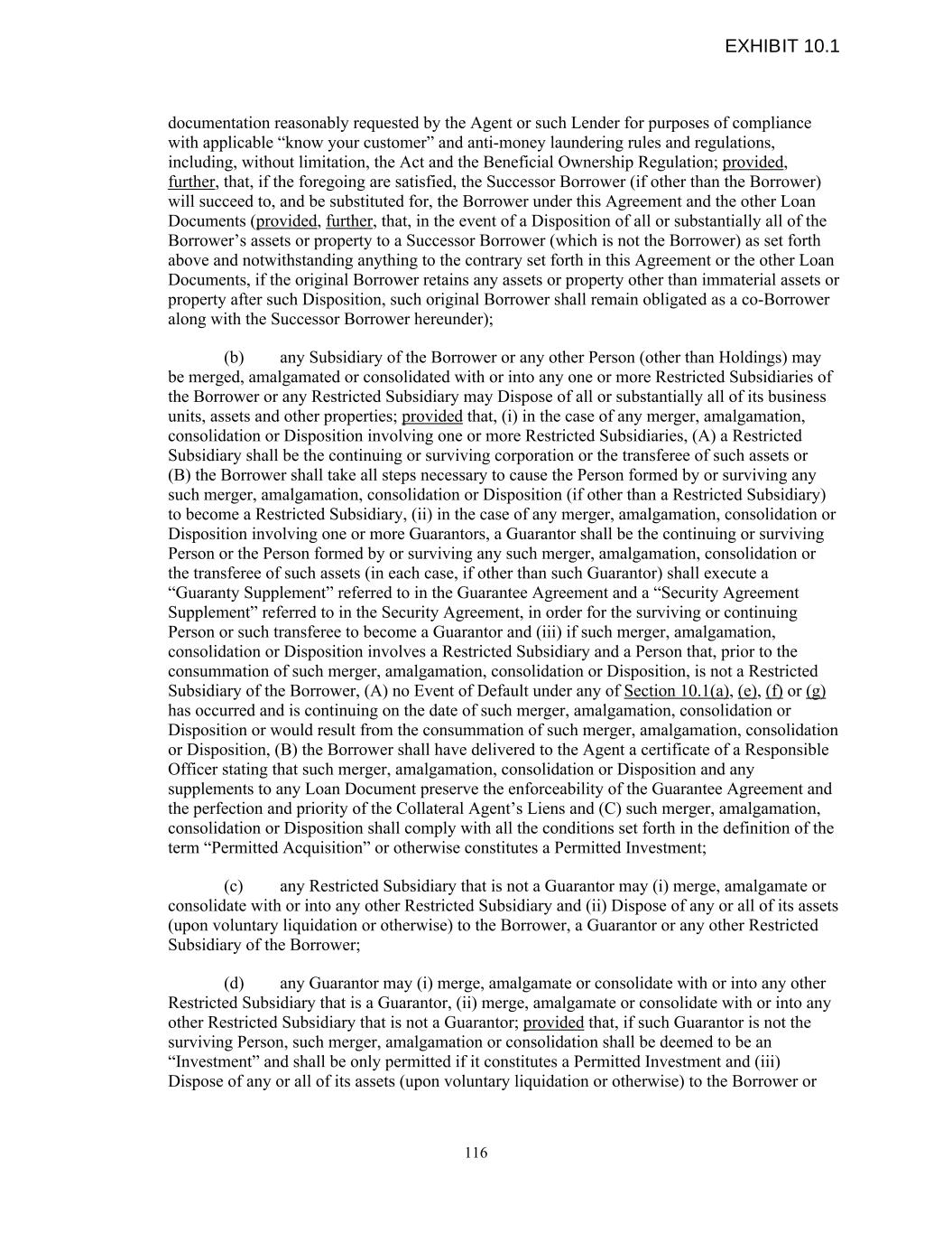 documentation reasonably requested by the Agent or such Lender for purposes of compliance with applicable “know your customer” and anti-money laundering rules and regulations, including, without limitation, the Act and the Beneficial Ownership Regulation; provided, further, that, if the foregoing are satisfied, the Successor Borrower (if other than the Borrower) will succeed to, and be substituted for, the Borrower under this Agreement and the other Loan Documents (provided, further, that, in the event of a Disposition of all or substantially all of the Borrower’s assets or property to a Successor Borrower (which is not the Borrower) as set forth above and notwithstanding anything to the contrary set forth in this Agreement or the other Loan Documents, if the original Borrower retains any assets or property other than immaterial assets or property after such Disposition, such original Borrower shall remain obligated as a co-Borrower along with the Successor Borrower hereunder); (b) any Subsidiary of the Borrower or any other Person (other than Holdings) may be merged, amalgamated or consolidated with or into any one or more Restricted Subsidiaries of the Borrower or any Restricted Subsidiary may Dispose of all or substantially all of its business units, assets and other properties; provided that, (i) in the case of any merger, amalgamation, consolidation or Disposition involving one or more Restricted Subsidiaries, (A) a Restricted Subsidiary shall be the continuing or surviving corporation or the transferee of such assets or (B) the Borrower shall take all steps necessary to cause the Person formed by or surviving any such merger, amalgamation, consolidation or Disposition (if other than a Restricted Subsidiary) to become a Restricted Subsidiary, (ii) in the case of any merger, amalgamation, consolidation or Disposition involving one or more Guarantors, a Guarantor shall be the continuing or surviving Person or the Person formed by or surviving any such merger, amalgamation, consolidation or the transferee of such assets (in each case, if other than such Guarantor) shall execute a “Guaranty Supplement” referred to in the Guarantee Agreement and a “Security Agreement Supplement” referred to in the Security Agreement, in order for the surviving or continuing Person or such transferee to become a Guarantor and (iii) if such merger, amalgamation, consolidation or Disposition involves a Restricted Subsidiary and a Person that, prior to the consummation of such merger, amalgamation, consolidation or Disposition, is not a Restricted Subsidiary of the Borrower, (A) no Event of Default under any of Section 10.1(a), (e), (f) or (g) has occurred and is continuing on the date of such merger, amalgamation, consolidation or Disposition or would result from the consummation of such merger, amalgamation, consolidation or Disposition, (B) the Borrower shall have delivered to the Agent a certificate of a Responsible Officer stating that such merger, amalgamation, consolidation or Disposition and any supplements to any Loan Document preserve the enforceability of the Guarantee Agreement and the perfection and priority of the Collateral Agent’s Liens and (C) such merger, amalgamation, consolidation or Disposition shall comply with all the conditions set forth in the definition of the term “Permitted Acquisition” or otherwise constitutes a Permitted Investment; (c) any Restricted Subsidiary that is not a Guarantor may (i) merge, amalgamate or consolidate with or into any other Restricted Subsidiary and (ii) Dispose of any or all of its assets (upon voluntary liquidation or otherwise) to the Borrower, a Guarantor or any other Restricted Subsidiary of the Borrower; (d) any Guarantor may (i) merge, amalgamate or consolidate with or into any other Restricted Subsidiary that is a Guarantor, (ii) merge, amalgamate or consolidate with or into any other Restricted Subsidiary that is not a Guarantor; provided that, if such Guarantor is not the surviving Person, such merger, amalgamation or consolidation shall be deemed to be an “Investment” and shall be only permitted if it constitutes a Permitted Investment and (iii) Dispose of any or all of its assets (upon voluntary liquidation or otherwise) to the Borrower or 116 EXHIBIT 10.1