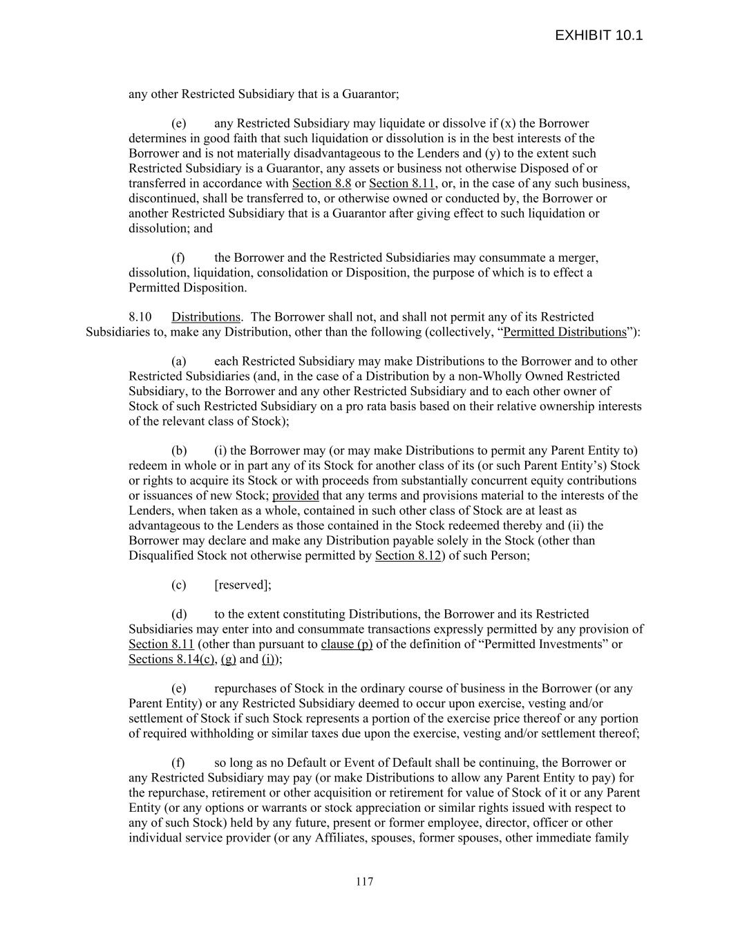 any other Restricted Subsidiary that is a Guarantor; (e) any Restricted Subsidiary may liquidate or dissolve if (x) the Borrower determines in good faith that such liquidation or dissolution is in the best interests of the Borrower and is not materially disadvantageous to the Lenders and (y) to the extent such Restricted Subsidiary is a Guarantor, any assets or business not otherwise Disposed of or transferred in accordance with Section 8.8 or Section 8.11, or, in the case of any such business, discontinued, shall be transferred to, or otherwise owned or conducted by, the Borrower or another Restricted Subsidiary that is a Guarantor after giving effect to such liquidation or dissolution; and (f) the Borrower and the Restricted Subsidiaries may consummate a merger, dissolution, liquidation, consolidation or Disposition, the purpose of which is to effect a Permitted Disposition. 8.10 Distributions. The Borrower shall not, and shall not permit any of its Restricted Subsidiaries to, make any Distribution, other than the following (collectively, “Permitted Distributions”): (a) each Restricted Subsidiary may make Distributions to the Borrower and to other Restricted Subsidiaries (and, in the case of a Distribution by a non-Wholly Owned Restricted Subsidiary, to the Borrower and any other Restricted Subsidiary and to each other owner of Stock of such Restricted Subsidiary on a pro rata basis based on their relative ownership interests of the relevant class of Stock); (b) (i) the Borrower may (or may make Distributions to permit any Parent Entity to) redeem in whole or in part any of its Stock for another class of its (or such Parent Entity’s) Stock or rights to acquire its Stock or with proceeds from substantially concurrent equity contributions or issuances of new Stock; provided that any terms and provisions material to the interests of the Lenders, when taken as a whole, contained in such other class of Stock are at least as advantageous to the Lenders as those contained in the Stock redeemed thereby and (ii) the Borrower may declare and make any Distribution payable solely in the Stock (other than Disqualified Stock not otherwise permitted by Section 8.12) of such Person; (c) [reserved]; (d) to the extent constituting Distributions, the Borrower and its Restricted Subsidiaries may enter into and consummate transactions expressly permitted by any provision of Section 8.11 (other than pursuant to clause (p) of the definition of “Permitted Investments” or Sections 8.14(c), (g) and (i)); (e) repurchases of Stock in the ordinary course of business in the Borrower (or any Parent Entity) or any Restricted Subsidiary deemed to occur upon exercise, vesting and/or settlement of Stock if such Stock represents a portion of the exercise price thereof or any portion of required withholding or similar taxes due upon the exercise, vesting and/or settlement thereof; (f) so long as no Default or Event of Default shall be continuing, the Borrower or any Restricted Subsidiary may pay (or make Distributions to allow any Parent Entity to pay) for the repurchase, retirement or other acquisition or retirement for value of Stock of it or any Parent Entity (or any options or warrants or stock appreciation or similar rights issued with respect to any of such Stock) held by any future, present or former employee, director, officer or other individual service provider (or any Affiliates, spouses, former spouses, other immediate family 117 EXHIBIT 10.1