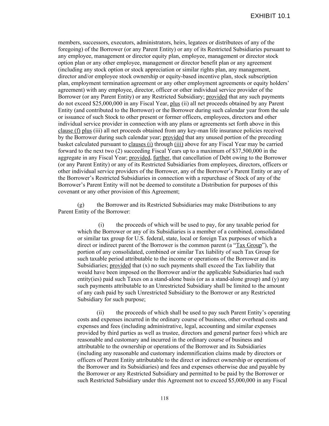 members, successors, executors, administrators, heirs, legatees or distributees of any of the foregoing) of the Borrower (or any Parent Entity) or any of its Restricted Subsidiaries pursuant to any employee, management or director equity plan, employee, management or director stock option plan or any other employee, management or director benefit plan or any agreement (including any stock option or stock appreciation or similar rights plan, any management, director and/or employee stock ownership or equity-based incentive plan, stock subscription plan, employment termination agreement or any other employment agreements or equity holders’ agreement) with any employee, director, officer or other individual service provider of the Borrower (or any Parent Entity) or any Restricted Subsidiary; provided that any such payments do not exceed $25,000,000 in any Fiscal Year, plus (ii) all net proceeds obtained by any Parent Entity (and contributed to the Borrower) or the Borrower during such calendar year from the sale or issuance of such Stock to other present or former officers, employees, directors and other individual service provider in connection with any plans or agreements set forth above in this clause (f) plus (iii) all net proceeds obtained from any key-man life insurance policies received by the Borrower during such calendar year; provided that any unused portion of the preceding basket calculated pursuant to clauses (i) through (iii) above for any Fiscal Year may be carried forward to the next two (2) succeeding Fiscal Years up to a maximum of $37,500,000 in the aggregate in any Fiscal Year; provided, further, that cancellation of Debt owing to the Borrower (or any Parent Entity) or any of its Restricted Subsidiaries from employees, directors, officers or other individual service providers of the Borrower, any of the Borrower’s Parent Entity or any of the Borrower’s Restricted Subsidiaries in connection with a repurchase of Stock of any of the Borrower’s Parent Entity will not be deemed to constitute a Distribution for purposes of this covenant or any other provision of this Agreement; (g) the Borrower and its Restricted Subsidiaries may make Distributions to any Parent Entity of the Borrower: (i) the proceeds of which will be used to pay, for any taxable period for which the Borrower or any of its Subsidiaries is a member of a combined, consolidated or similar tax group for U.S. federal, state, local or foreign Tax purposes of which a direct or indirect parent of the Borrower is the common parent (a “Tax Group”), the portion of any consolidated, combined or similar Tax liability of such Tax Group for such taxable period attributable to the income or operations of the Borrower and its Subsidiaries; provided that (x) no such payments shall exceed the Tax liability that would have been imposed on the Borrower and/or the applicable Subsidiaries had such entity(ies) paid such Taxes on a stand-alone basis (or as a stand-alone group) and (y) any such payments attributable to an Unrestricted Subsidiary shall be limited to the amount of any cash paid by such Unrestricted Subsidiary to the Borrower or any Restricted Subsidiary for such purpose; (ii) the proceeds of which shall be used to pay such Parent Entity’s operating costs and expenses incurred in the ordinary course of business, other overhead costs and expenses and fees (including administrative, legal, accounting and similar expenses provided by third parties as well as trustee, directors and general partner fees) which are reasonable and customary and incurred in the ordinary course of business and attributable to the ownership or operations of the Borrower and its Subsidiaries (including any reasonable and customary indemnification claims made by directors or officers of Parent Entity attributable to the direct or indirect ownership or operations of the Borrower and its Subsidiaries) and fees and expenses otherwise due and payable by the Borrower or any Restricted Subsidiary and permitted to be paid by the Borrower or such Restricted Subsidiary under this Agreement not to exceed $5,000,000 in any Fiscal 118 EXHIBIT 10.1