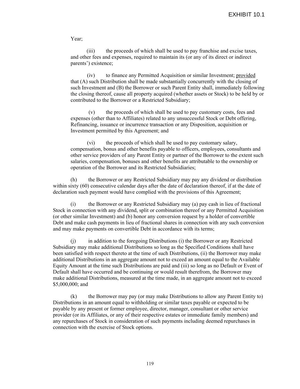Year; (iii) the proceeds of which shall be used to pay franchise and excise taxes, and other fees and expenses, required to maintain its (or any of its direct or indirect parents’) existence; (iv) to finance any Permitted Acquisition or similar Investment; provided that (A) such Distribution shall be made substantially concurrently with the closing of such Investment and (B) the Borrower or such Parent Entity shall, immediately following the closing thereof, cause all property acquired (whether assets or Stock) to be held by or contributed to the Borrower or a Restricted Subsidiary; (v) the proceeds of which shall be used to pay customary costs, fees and expenses (other than to Affiliates) related to any unsuccessful Stock or Debt offering, Refinancing, issuance or incurrence transaction or any Disposition, acquisition or Investment permitted by this Agreement; and (vi) the proceeds of which shall be used to pay customary salary, compensation, bonus and other benefits payable to officers, employees, consultants and other service providers of any Parent Entity or partner of the Borrower to the extent such salaries, compensation, bonuses and other benefits are attributable to the ownership or operation of the Borrower and its Restricted Subsidiaries; (h) the Borrower or any Restricted Subsidiary may pay any dividend or distribution within sixty (60) consecutive calendar days after the date of declaration thereof, if at the date of declaration such payment would have complied with the provisions of this Agreement; (i) the Borrower or any Restricted Subsidiary may (a) pay cash in lieu of fractional Stock in connection with any dividend, split or combination thereof or any Permitted Acquisition (or other similar Investment) and (b) honor any conversion request by a holder of convertible Debt and make cash payments in lieu of fractional shares in connection with any such conversion and may make payments on convertible Debt in accordance with its terms; (j) in addition to the foregoing Distributions (i) the Borrower or any Restricted Subsidiary may make additional Distributions so long as the Specified Conditions shall have been satisfied with respect thereto at the time of such Distributions, (ii) the Borrower may make additional Distributions in an aggregate amount not to exceed an amount equal to the Available Equity Amount at the time such Distributions are paid and (iii) so long as no Default or Event of Default shall have occurred and be continuing or would result therefrom, the Borrower may make additional Distributions, measured at the time made, in an aggregate amount not to exceed $5,000,000; and (k) the Borrower may pay (or may make Distributions to allow any Parent Entity to) Distributions in an amount equal to withholding or similar taxes payable or expected to be payable by any present or former employee, director, manager, consultant or other service provider (or its Affiliates, or any of their respective estates or immediate family members) and any repurchases of Stock in consideration of such payments including deemed repurchases in connection with the exercise of Stock options. 119 EXHIBIT 10.1