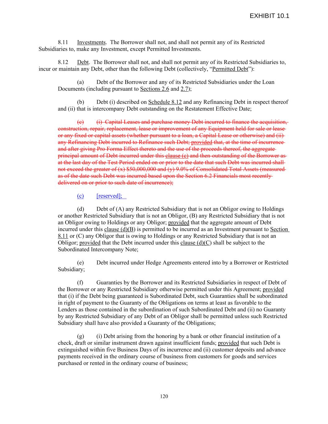 8.11 Investments. The Borrower shall not, and shall not permit any of its Restricted Subsidiaries to, make any Investment, except Permitted Investments. 8.12 Debt. The Borrower shall not, and shall not permit any of its Restricted Subsidiaries to, incur or maintain any Debt, other than the following Debt (collectively, “Permitted Debt”): (a) Debt of the Borrower and any of its Restricted Subsidiaries under the Loan Documents (including pursuant to Sections 2.6 and 2.7); (b) Debt (i) described on Schedule 8.12 and any Refinancing Debt in respect thereof and (ii) that is intercompany Debt outstanding on the Restatement Effective Date; (c) (i) Capital Leases and purchase money Debt incurred to finance the acquisition, construction, repair, replacement, lease or improvement of any Equipment held for sale or lease or any fixed or capital assets (whether pursuant to a loan, a Capital Lease or otherwise) and (ii) any Refinancing Debt incurred to Refinance such Debt; provided that, at the time of incurrence and after giving Pro Forma Effect thereto and the use of the proceeds thereof, the aggregate principal amount of Debt incurred under this clause (c) and then-outstanding of the Borrower as at the last day of the Test Period ended on or prior to the date that such Debt was incurred shall not exceed the greater of (x) $50,000,000 and (y) 9.0% of Consolidated Total Assets (measured as of the date such Debt was incurred based upon the Section 6.2 Financials most recently delivered on or prior to such date of incurrence); (c) [reserved]; (d) Debt of (A) any Restricted Subsidiary that is not an Obligor owing to Holdings or another Restricted Subsidiary that is not an Obligor, (B) any Restricted Subsidiary that is not an Obligor owing to Holdings or any Obligor; provided that the aggregate amount of Debt incurred under this clause (d)(B) is permitted to be incurred as an Investment pursuant to Section 8.11 or (C) any Obligor that is owing to Holdings or any Restricted Subsidiary that is not an Obligor; provided that the Debt incurred under this clause (d)(C) shall be subject to the Subordinated Intercompany Note; (e) Debt incurred under Hedge Agreements entered into by a Borrower or Restricted Subsidiary; (f) Guaranties by the Borrower and its Restricted Subsidiaries in respect of Debt of the Borrower or any Restricted Subsidiary otherwise permitted under this Agreement; provided that (i) if the Debt being guaranteed is Subordinated Debt, such Guaranties shall be subordinated in right of payment to the Guaranty of the Obligations on terms at least as favorable to the Lenders as those contained in the subordination of such Subordinated Debt and (ii) no Guaranty by any Restricted Subsidiary of any Debt of an Obligor shall be permitted unless such Restricted Subsidiary shall have also provided a Guaranty of the Obligations; (g) (i) Debt arising from the honoring by a bank or other financial institution of a check, draft or similar instrument drawn against insufficient funds; provided that such Debt is extinguished within five Business Days of its incurrence and (ii) customer deposits and advance payments received in the ordinary course of business from customers for goods and services purchased or rented in the ordinary course of business; 120 EXHIBIT 10.1