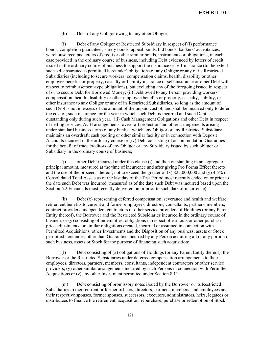 (h) Debt of any Obligor owing to any other Obligor; (i) Debt of any Obligor or Restricted Subsidiary in respect of (i) performance bonds, completion guarantees, surety bonds, appeal bonds, bid bonds, bankers’ acceptances, warehouse receipts, letters of credit or other similar bonds, instruments or obligations, in each case provided in the ordinary course of business, including Debt evidenced by letters of credit issued in the ordinary course of business to support the insurance or self-insurance (to the extent such self-insurance is permitted hereunder) obligations of any Obligor or any of its Restricted Subsidiaries (including to secure workers’ compensation claims, health, disability or other employee benefits or property, casualty or liability insurance or self-insurance or other Debt with respect to reimbursement-type obligations), but excluding any of the foregoing issued in respect of or to secure Debt for Borrowed Money; (ii) Debt owed to any Person providing workers’ compensation, health, disability or other employee benefits or property, casualty, liability, or other insurance to any Obligor or any of its Restricted Subsidiaries, so long as the amount of such Debt is not in excess of the amount of the unpaid cost of, and shall be incurred only to defer the cost of, such insurance for the year in which such Debt is incurred and such Debt is outstanding only during such year, (iii) Cash Management Obligations and other Debt in respect of netting services, ACH arrangements, overdraft protection and other arrangements arising under standard business terms of any bank at which any Obligor or any Restricted Subsidiary maintains an overdraft, cash pooling or other similar facility or in connection with Deposit Accounts incurred in the ordinary course or (iv) Debt consisting of accommodation Guaranties for the benefit of trade creditors of any Obligor or any Subsidiary issued by such obligor or Subsidiary in the ordinary course of business; (j) other Debt incurred under this clause (j) and then outstanding in an aggregate principal amount, measured at the time of incurrence and after giving Pro Forma Effect thereto and the use of the proceeds thereof, not to exceed the greater of (x) $25,000,000 and (y) 4.5% of Consolidated Total Assets as of the last day of the Test Period most recently ended on or prior to the date such Debt was incurred (measured as of the date such Debt was incurred based upon the Section 6.2 Financials most recently delivered on or prior to such date of incurrence); (k) Debt (x) representing deferred compensation, severance and health and welfare retirement benefits to current and former employees, directors, consultants, partners, members, contract providers, independent contractors or other service providers of Holdings (or any Parent Entity thereof), the Borrower and the Restricted Subsidiaries incurred in the ordinary course of business or (y) consisting of indemnities, obligations in respect of earnouts or other purchase price adjustments, or similar obligations created, incurred or assumed in connection with Permitted Acquisitions, other Investments and the Disposition of any business, assets or Stock permitted hereunder, other than Guaranties incurred by any Person acquiring all or any portion of such business, assets or Stock for the purpose of financing such acquisition; (l) Debt consisting of (x) obligations of Holdings (or any Parent Entity thereof), the Borrower or the Restricted Subsidiaries under deferred compensation arrangements to their employees, directors, partners, members, consultants, independent contractors or other service providers, (y) other similar arrangements incurred by such Persons in connection with Permitted Acquisitions or (z) any other Investment permitted under Section 8.11; (m) Debt consisting of promissory notes issued by the Borrower or its Restricted Subsidiaries to their current or former officers, directors, partners, members, and employees and their respective spouses, former spouses, successors, executors, administrators, heirs, legatees or distributees to finance the retirement, acquisition, repurchase, purchase or redemption of Stock 121 EXHIBIT 10.1