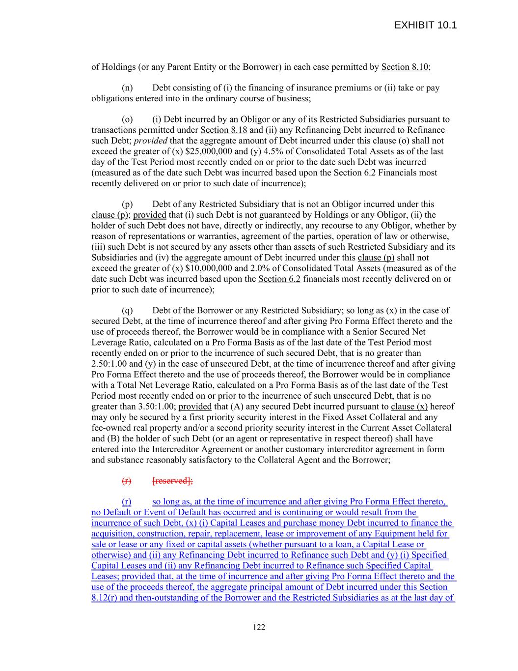 of Holdings (or any Parent Entity or the Borrower) in each case permitted by Section 8.10; (n) Debt consisting of (i) the financing of insurance premiums or (ii) take or pay obligations entered into in the ordinary course of business; (o) (i) Debt incurred by an Obligor or any of its Restricted Subsidiaries pursuant to transactions permitted under Section 8.18 and (ii) any Refinancing Debt incurred to Refinance such Debt; provided that the aggregate amount of Debt incurred under this clause (o) shall not exceed the greater of (x) $25,000,000 and (y) 4.5% of Consolidated Total Assets as of the last day of the Test Period most recently ended on or prior to the date such Debt was incurred (measured as of the date such Debt was incurred based upon the Section 6.2 Financials most recently delivered on or prior to such date of incurrence); (p) Debt of any Restricted Subsidiary that is not an Obligor incurred under this clause (p); provided that (i) such Debt is not guaranteed by Holdings or any Obligor, (ii) the holder of such Debt does not have, directly or indirectly, any recourse to any Obligor, whether by reason of representations or warranties, agreement of the parties, operation of law or otherwise, (iii) such Debt is not secured by any assets other than assets of such Restricted Subsidiary and its Subsidiaries and (iv) the aggregate amount of Debt incurred under this clause (p) shall not exceed the greater of (x) $10,000,000 and 2.0% of Consolidated Total Assets (measured as of the date such Debt was incurred based upon the Section 6.2 financials most recently delivered on or prior to such date of incurrence); (q) Debt of the Borrower or any Restricted Subsidiary; so long as (x) in the case of secured Debt, at the time of incurrence thereof and after giving Pro Forma Effect thereto and the use of proceeds thereof, the Borrower would be in compliance with a Senior Secured Net Leverage Ratio, calculated on a Pro Forma Basis as of the last date of the Test Period most recently ended on or prior to the incurrence of such secured Debt, that is no greater than 2.50:1.00 and (y) in the case of unsecured Debt, at the time of incurrence thereof and after giving Pro Forma Effect thereto and the use of proceeds thereof, the Borrower would be in compliance with a Total Net Leverage Ratio, calculated on a Pro Forma Basis as of the last date of the Test Period most recently ended on or prior to the incurrence of such unsecured Debt, that is no greater than 3.50:1.00; provided that (A) any secured Debt incurred pursuant to clause (x) hereof may only be secured by a first priority security interest in the Fixed Asset Collateral and any fee-owned real property and/or a second priority security interest in the Current Asset Collateral and (B) the holder of such Debt (or an agent or representative in respect thereof) shall have entered into the Intercreditor Agreement or another customary intercreditor agreement in form and substance reasonably satisfactory to the Collateral Agent and the Borrower; (r) [reserved]; (r) so long as, at the time of incurrence and after giving Pro Forma Effect thereto, no Default or Event of Default has occurred and is continuing or would result from the incurrence of such Debt, (x) (i) Capital Leases and purchase money Debt incurred to finance the acquisition, construction, repair, replacement, lease or improvement of any Equipment held for sale or lease or any fixed or capital assets (whether pursuant to a loan, a Capital Lease or otherwise) and (ii) any Refinancing Debt incurred to Refinance such Debt and (y) (i) Specified Capital Leases and (ii) any Refinancing Debt incurred to Refinance such Specified Capital Leases; provided that, at the time of incurrence and after giving Pro Forma Effect thereto and the use of the proceeds thereof, the aggregate principal amount of Debt incurred under this Section 8.12(r) and then-outstanding of the Borrower and the Restricted Subsidiaries as at the last day of 122 EXHIBIT 10.1
