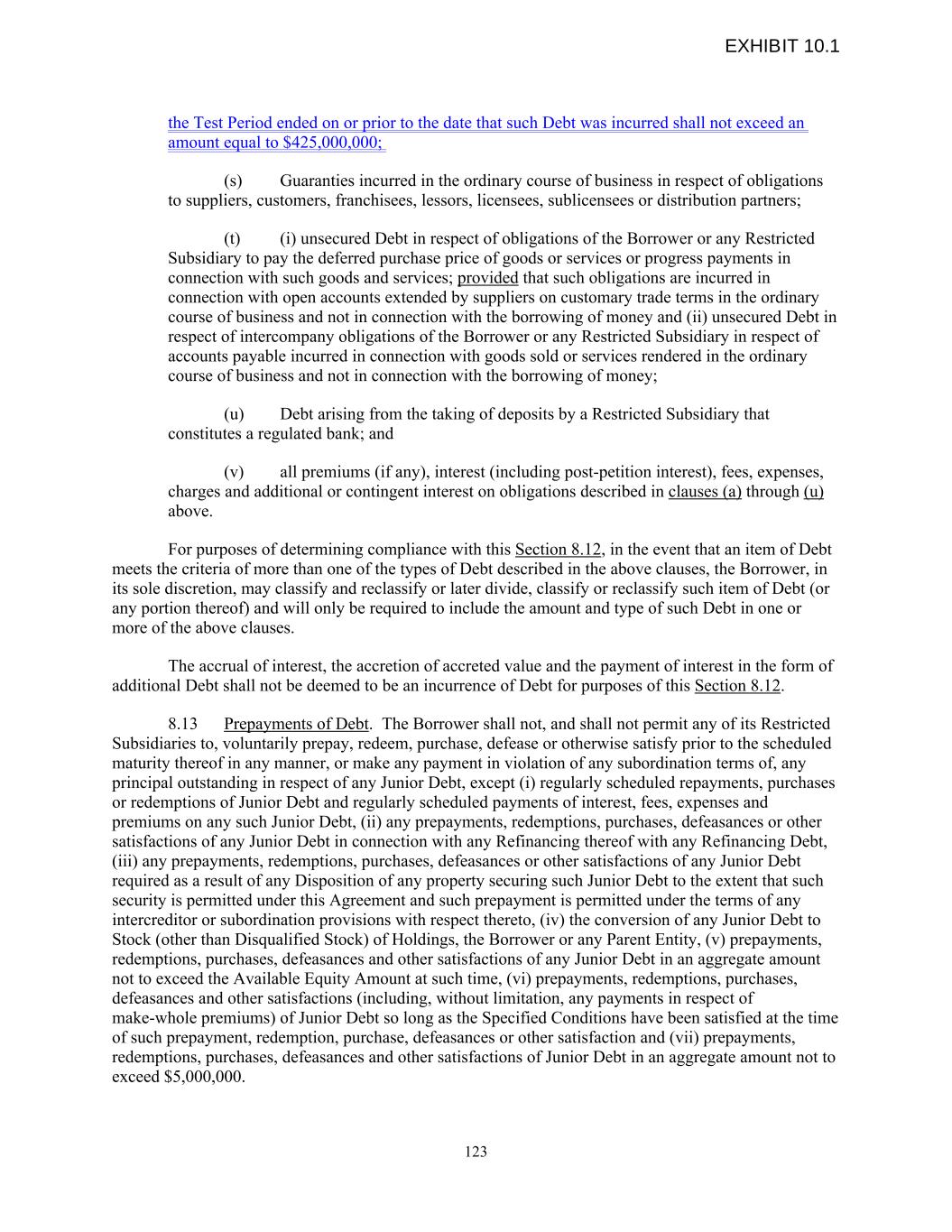 the Test Period ended on or prior to the date that such Debt was incurred shall not exceed an amount equal to $425,000,000; (s) Guaranties incurred in the ordinary course of business in respect of obligations to suppliers, customers, franchisees, lessors, licensees, sublicensees or distribution partners; (t) (i) unsecured Debt in respect of obligations of the Borrower or any Restricted Subsidiary to pay the deferred purchase price of goods or services or progress payments in connection with such goods and services; provided that such obligations are incurred in connection with open accounts extended by suppliers on customary trade terms in the ordinary course of business and not in connection with the borrowing of money and (ii) unsecured Debt in respect of intercompany obligations of the Borrower or any Restricted Subsidiary in respect of accounts payable incurred in connection with goods sold or services rendered in the ordinary course of business and not in connection with the borrowing of money; (u) Debt arising from the taking of deposits by a Restricted Subsidiary that constitutes a regulated bank; and (v) all premiums (if any), interest (including post-petition interest), fees, expenses, charges and additional or contingent interest on obligations described in clauses (a) through (u) above. For purposes of determining compliance with this Section 8.12, in the event that an item of Debt meets the criteria of more than one of the types of Debt described in the above clauses, the Borrower, in its sole discretion, may classify and reclassify or later divide, classify or reclassify such item of Debt (or any portion thereof) and will only be required to include the amount and type of such Debt in one or more of the above clauses. The accrual of interest, the accretion of accreted value and the payment of interest in the form of additional Debt shall not be deemed to be an incurrence of Debt for purposes of this Section 8.12. 8.13 Prepayments of Debt. The Borrower shall not, and shall not permit any of its Restricted Subsidiaries to, voluntarily prepay, redeem, purchase, defease or otherwise satisfy prior to the scheduled maturity thereof in any manner, or make any payment in violation of any subordination terms of, any principal outstanding in respect of any Junior Debt, except (i) regularly scheduled repayments, purchases or redemptions of Junior Debt and regularly scheduled payments of interest, fees, expenses and premiums on any such Junior Debt, (ii) any prepayments, redemptions, purchases, defeasances or other satisfactions of any Junior Debt in connection with any Refinancing thereof with any Refinancing Debt, (iii) any prepayments, redemptions, purchases, defeasances or other satisfactions of any Junior Debt required as a result of any Disposition of any property securing such Junior Debt to the extent that such security is permitted under this Agreement and such prepayment is permitted under the terms of any intercreditor or subordination provisions with respect thereto, (iv) the conversion of any Junior Debt to Stock (other than Disqualified Stock) of Holdings, the Borrower or any Parent Entity, (v) prepayments, redemptions, purchases, defeasances and other satisfactions of any Junior Debt in an aggregate amount not to exceed the Available Equity Amount at such time, (vi) prepayments, redemptions, purchases, defeasances and other satisfactions (including, without limitation, any payments in respect of make-whole premiums) of Junior Debt so long as the Specified Conditions have been satisfied at the time of such prepayment, redemption, purchase, defeasances or other satisfaction and (vii) prepayments, redemptions, purchases, defeasances and other satisfactions of Junior Debt in an aggregate amount not to exceed $5,000,000. 123 EXHIBIT 10.1