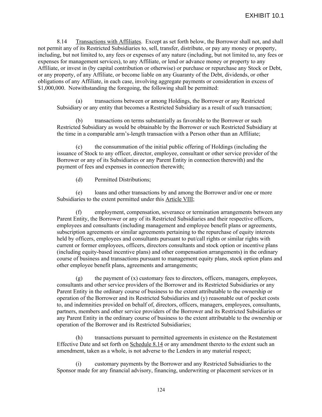 8.14 Transactions with Affiliates. Except as set forth below, the Borrower shall not, and shall not permit any of its Restricted Subsidiaries to, sell, transfer, distribute, or pay any money or property, including, but not limited to, any fees or expenses of any nature (including, but not limited to, any fees or expenses for management services), to any Affiliate, or lend or advance money or property to any Affiliate, or invest in (by capital contribution or otherwise) or purchase or repurchase any Stock or Debt, or any property, of any Affiliate, or become liable on any Guaranty of the Debt, dividends, or other obligations of any Affiliate, in each case, involving aggregate payments or consideration in excess of $1,000,000. Notwithstanding the foregoing, the following shall be permitted: (a) transactions between or among Holdings, the Borrower or any Restricted Subsidiary or any entity that becomes a Restricted Subsidiary as a result of such transaction; (b) transactions on terms substantially as favorable to the Borrower or such Restricted Subsidiary as would be obtainable by the Borrower or such Restricted Subsidiary at the time in a comparable arm’s-length transaction with a Person other than an Affiliate; (c) the consummation of the initial public offering of Holdings (including the issuance of Stock to any officer, director, employee, consultant or other service provider of the Borrower or any of its Subsidiaries or any Parent Entity in connection therewith) and the payment of fees and expenses in connection therewith; (d) Permitted Distributions; (e) loans and other transactions by and among the Borrower and/or one or more Subsidiaries to the extent permitted under this Article VIII; (f) employment, compensation, severance or termination arrangements between any Parent Entity, the Borrower or any of its Restricted Subsidiaries and their respective officers, employees and consultants (including management and employee benefit plans or agreements, subscription agreements or similar agreements pertaining to the repurchase of equity interests held by officers, employees and consultants pursuant to put/call rights or similar rights with current or former employees, officers, directors consultants and stock option or incentive plans (including equity-based incentive plans) and other compensation arrangements) in the ordinary course of business and transactions pursuant to management equity plans, stock option plans and other employee benefit plans, agreements and arrangements; (g) the payment of (x) customary fees to directors, officers, managers, employees, consultants and other service providers of the Borrower and its Restricted Subsidiaries or any Parent Entity in the ordinary course of business to the extent attributable to the ownership or operation of the Borrower and its Restricted Subsidiaries and (y) reasonable out of pocket costs to, and indemnities provided on behalf of, directors, officers, managers, employees, consultants, partners, members and other service providers of the Borrower and its Restricted Subsidiaries or any Parent Entity in the ordinary course of business to the extent attributable to the ownership or operation of the Borrower and its Restricted Subsidiaries; (h) transactions pursuant to permitted agreements in existence on the Restatement Effective Date and set forth on Schedule 8.14 or any amendment thereto to the extent such an amendment, taken as a whole, is not adverse to the Lenders in any material respect; (i) customary payments by the Borrower and any Restricted Subsidiaries to the Sponsor made for any financial advisory, financing, underwriting or placement services or in 124 EXHIBIT 10.1
