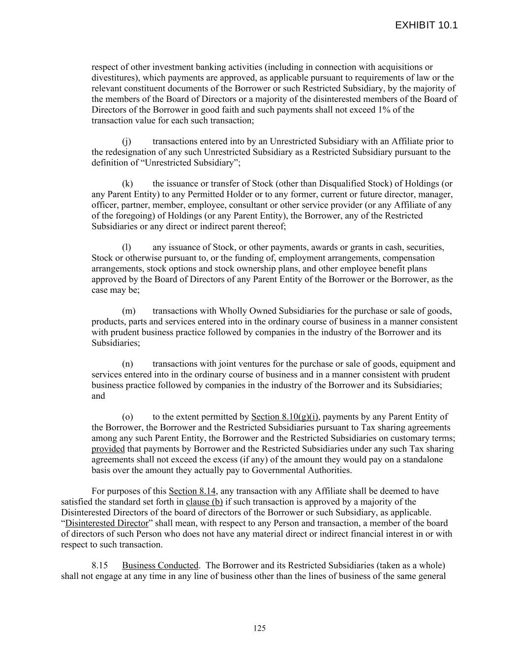 respect of other investment banking activities (including in connection with acquisitions or divestitures), which payments are approved, as applicable pursuant to requirements of law or the relevant constituent documents of the Borrower or such Restricted Subsidiary, by the majority of the members of the Board of Directors or a majority of the disinterested members of the Board of Directors of the Borrower in good faith and such payments shall not exceed 1% of the transaction value for each such transaction; (j) transactions entered into by an Unrestricted Subsidiary with an Affiliate prior to the redesignation of any such Unrestricted Subsidiary as a Restricted Subsidiary pursuant to the definition of “Unrestricted Subsidiary”; (k) the issuance or transfer of Stock (other than Disqualified Stock) of Holdings (or any Parent Entity) to any Permitted Holder or to any former, current or future director, manager, officer, partner, member, employee, consultant or other service provider (or any Affiliate of any of the foregoing) of Holdings (or any Parent Entity), the Borrower, any of the Restricted Subsidiaries or any direct or indirect parent thereof; (l) any issuance of Stock, or other payments, awards or grants in cash, securities, Stock or otherwise pursuant to, or the funding of, employment arrangements, compensation arrangements, stock options and stock ownership plans, and other employee benefit plans approved by the Board of Directors of any Parent Entity of the Borrower or the Borrower, as the case may be; (m) transactions with Wholly Owned Subsidiaries for the purchase or sale of goods, products, parts and services entered into in the ordinary course of business in a manner consistent with prudent business practice followed by companies in the industry of the Borrower and its Subsidiaries; (n) transactions with joint ventures for the purchase or sale of goods, equipment and services entered into in the ordinary course of business and in a manner consistent with prudent business practice followed by companies in the industry of the Borrower and its Subsidiaries; and (o) to the extent permitted by Section 8.10(g)(i), payments by any Parent Entity of the Borrower, the Borrower and the Restricted Subsidiaries pursuant to Tax sharing agreements among any such Parent Entity, the Borrower and the Restricted Subsidiaries on customary terms; provided that payments by Borrower and the Restricted Subsidiaries under any such Tax sharing agreements shall not exceed the excess (if any) of the amount they would pay on a standalone basis over the amount they actually pay to Governmental Authorities. For purposes of this Section 8.14, any transaction with any Affiliate shall be deemed to have satisfied the standard set forth in clause (b) if such transaction is approved by a majority of the Disinterested Directors of the board of directors of the Borrower or such Subsidiary, as applicable. “Disinterested Director” shall mean, with respect to any Person and transaction, a member of the board of directors of such Person who does not have any material direct or indirect financial interest in or with respect to such transaction. 8.15 Business Conducted. The Borrower and its Restricted Subsidiaries (taken as a whole) shall not engage at any time in any line of business other than the lines of business of the same general 125 EXHIBIT 10.1