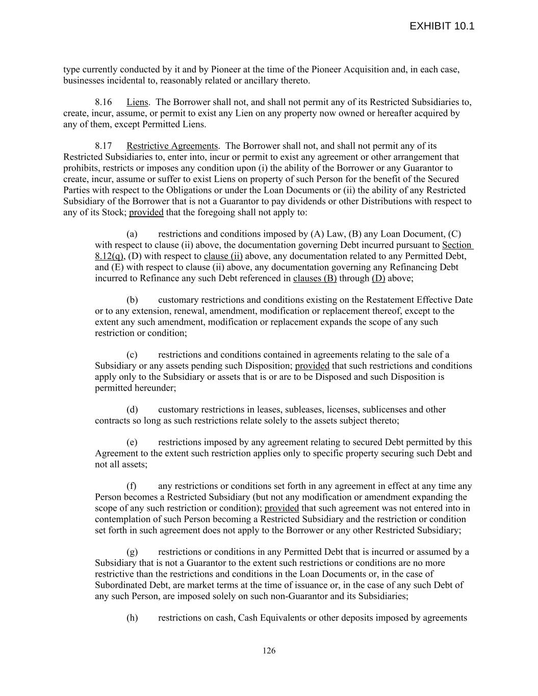 type currently conducted by it and by Pioneer at the time of the Pioneer Acquisition and, in each case, businesses incidental to, reasonably related or ancillary thereto. 8.16 Liens. The Borrower shall not, and shall not permit any of its Restricted Subsidiaries to, create, incur, assume, or permit to exist any Lien on any property now owned or hereafter acquired by any of them, except Permitted Liens. 8.17 Restrictive Agreements. The Borrower shall not, and shall not permit any of its Restricted Subsidiaries to, enter into, incur or permit to exist any agreement or other arrangement that prohibits, restricts or imposes any condition upon (i) the ability of the Borrower or any Guarantor to create, incur, assume or suffer to exist Liens on property of such Person for the benefit of the Secured Parties with respect to the Obligations or under the Loan Documents or (ii) the ability of any Restricted Subsidiary of the Borrower that is not a Guarantor to pay dividends or other Distributions with respect to any of its Stock; provided that the foregoing shall not apply to: (a) restrictions and conditions imposed by (A) Law, (B) any Loan Document, (C) with respect to clause (ii) above, the documentation governing Debt incurred pursuant to Section 8.12(q), (D) with respect to clause (ii) above, any documentation related to any Permitted Debt, and (E) with respect to clause (ii) above, any documentation governing any Refinancing Debt incurred to Refinance any such Debt referenced in clauses (B) through (D) above; (b) customary restrictions and conditions existing on the Restatement Effective Date or to any extension, renewal, amendment, modification or replacement thereof, except to the extent any such amendment, modification or replacement expands the scope of any such restriction or condition; (c) restrictions and conditions contained in agreements relating to the sale of a Subsidiary or any assets pending such Disposition; provided that such restrictions and conditions apply only to the Subsidiary or assets that is or are to be Disposed and such Disposition is permitted hereunder; (d) customary restrictions in leases, subleases, licenses, sublicenses and other contracts so long as such restrictions relate solely to the assets subject thereto; (e) restrictions imposed by any agreement relating to secured Debt permitted by this Agreement to the extent such restriction applies only to specific property securing such Debt and not all assets; (f) any restrictions or conditions set forth in any agreement in effect at any time any Person becomes a Restricted Subsidiary (but not any modification or amendment expanding the scope of any such restriction or condition); provided that such agreement was not entered into in contemplation of such Person becoming a Restricted Subsidiary and the restriction or condition set forth in such agreement does not apply to the Borrower or any other Restricted Subsidiary; (g) restrictions or conditions in any Permitted Debt that is incurred or assumed by a Subsidiary that is not a Guarantor to the extent such restrictions or conditions are no more restrictive than the restrictions and conditions in the Loan Documents or, in the case of Subordinated Debt, are market terms at the time of issuance or, in the case of any such Debt of any such Person, are imposed solely on such non-Guarantor and its Subsidiaries; (h) restrictions on cash, Cash Equivalents or other deposits imposed by agreements 126 EXHIBIT 10.1