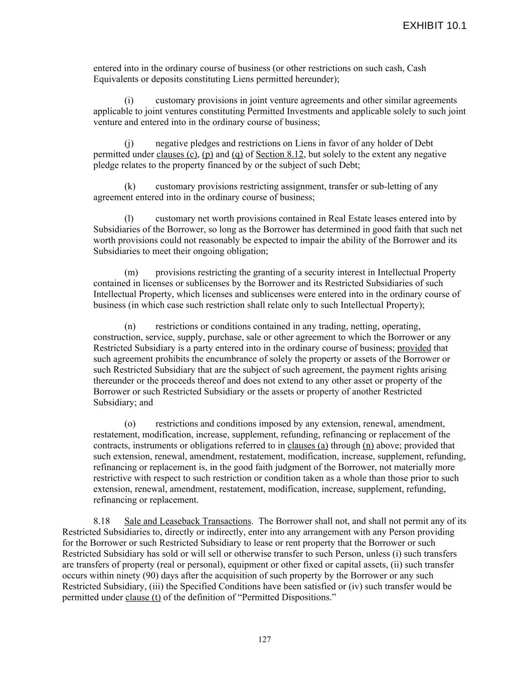 entered into in the ordinary course of business (or other restrictions on such cash, Cash Equivalents or deposits constituting Liens permitted hereunder); (i) customary provisions in joint venture agreements and other similar agreements applicable to joint ventures constituting Permitted Investments and applicable solely to such joint venture and entered into in the ordinary course of business; (j) negative pledges and restrictions on Liens in favor of any holder of Debt permitted under clauses (c), (p) and (q) of Section 8.12, but solely to the extent any negative pledge relates to the property financed by or the subject of such Debt; (k) customary provisions restricting assignment, transfer or sub-letting of any agreement entered into in the ordinary course of business; (l) customary net worth provisions contained in Real Estate leases entered into by Subsidiaries of the Borrower, so long as the Borrower has determined in good faith that such net worth provisions could not reasonably be expected to impair the ability of the Borrower and its Subsidiaries to meet their ongoing obligation; (m) provisions restricting the granting of a security interest in Intellectual Property contained in licenses or sublicenses by the Borrower and its Restricted Subsidiaries of such Intellectual Property, which licenses and sublicenses were entered into in the ordinary course of business (in which case such restriction shall relate only to such Intellectual Property); (n) restrictions or conditions contained in any trading, netting, operating, construction, service, supply, purchase, sale or other agreement to which the Borrower or any Restricted Subsidiary is a party entered into in the ordinary course of business; provided that such agreement prohibits the encumbrance of solely the property or assets of the Borrower or such Restricted Subsidiary that are the subject of such agreement, the payment rights arising thereunder or the proceeds thereof and does not extend to any other asset or property of the Borrower or such Restricted Subsidiary or the assets or property of another Restricted Subsidiary; and (o) restrictions and conditions imposed by any extension, renewal, amendment, restatement, modification, increase, supplement, refunding, refinancing or replacement of the contracts, instruments or obligations referred to in clauses (a) through (n) above; provided that such extension, renewal, amendment, restatement, modification, increase, supplement, refunding, refinancing or replacement is, in the good faith judgment of the Borrower, not materially more restrictive with respect to such restriction or condition taken as a whole than those prior to such extension, renewal, amendment, restatement, modification, increase, supplement, refunding, refinancing or replacement. 8.18 Sale and Leaseback Transactions. The Borrower shall not, and shall not permit any of its Restricted Subsidiaries to, directly or indirectly, enter into any arrangement with any Person providing for the Borrower or such Restricted Subsidiary to lease or rent property that the Borrower or such Restricted Subsidiary has sold or will sell or otherwise transfer to such Person, unless (i) such transfers are transfers of property (real or personal), equipment or other fixed or capital assets, (ii) such transfer occurs within ninety (90) days after the acquisition of such property by the Borrower or any such Restricted Subsidiary, (iii) the Specified Conditions have been satisfied or (iv) such transfer would be permitted under clause (t) of the definition of “Permitted Dispositions.” 127 EXHIBIT 10.1