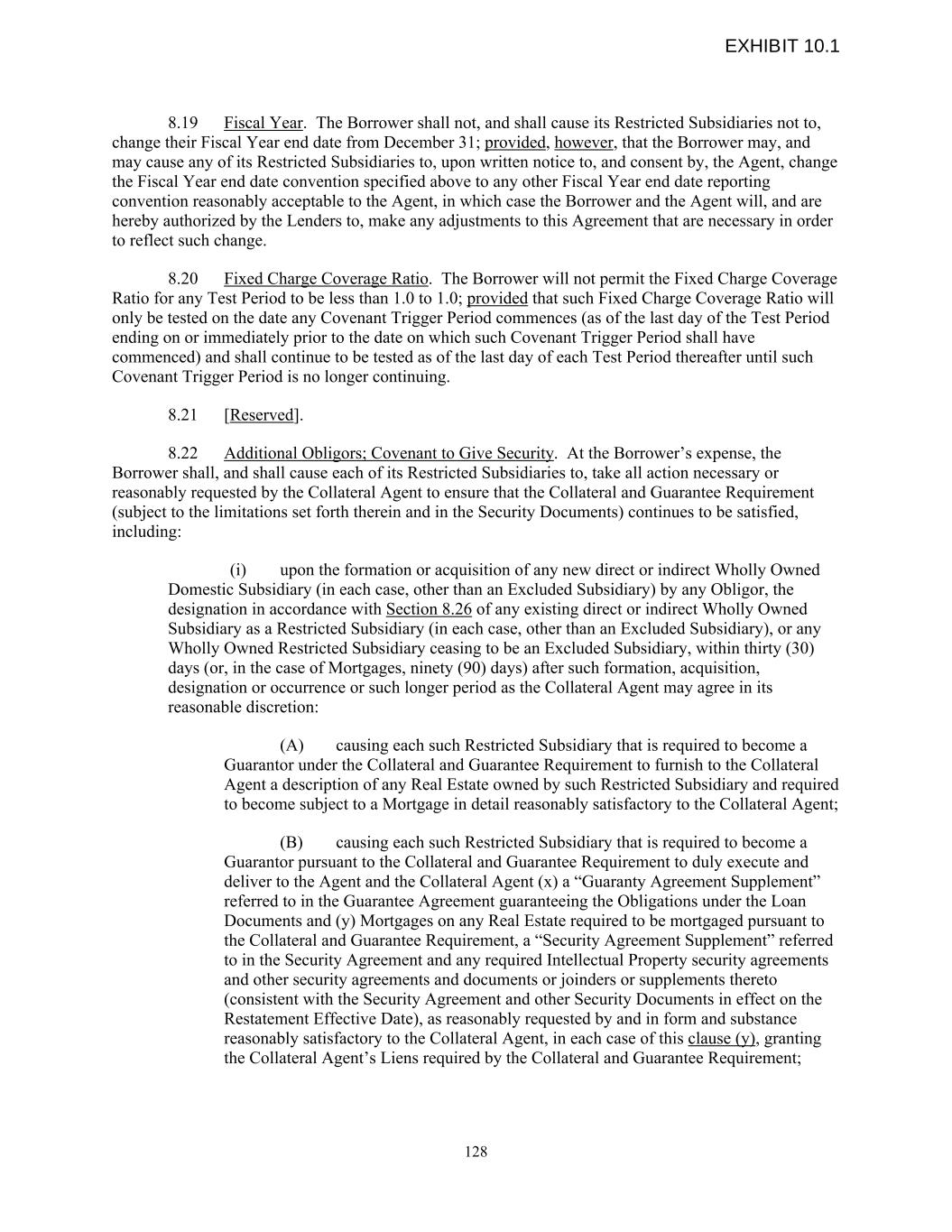 8.19 Fiscal Year. The Borrower shall not, and shall cause its Restricted Subsidiaries not to, change their Fiscal Year end date from December 31; provided, however, that the Borrower may, and may cause any of its Restricted Subsidiaries to, upon written notice to, and consent by, the Agent, change the Fiscal Year end date convention specified above to any other Fiscal Year end date reporting convention reasonably acceptable to the Agent, in which case the Borrower and the Agent will, and are hereby authorized by the Lenders to, make any adjustments to this Agreement that are necessary in order to reflect such change. 8.20 Fixed Charge Coverage Ratio. The Borrower will not permit the Fixed Charge Coverage Ratio for any Test Period to be less than 1.0 to 1.0; provided that such Fixed Charge Coverage Ratio will only be tested on the date any Covenant Trigger Period commences (as of the last day of the Test Period ending on or immediately prior to the date on which such Covenant Trigger Period shall have commenced) and shall continue to be tested as of the last day of each Test Period thereafter until such Covenant Trigger Period is no longer continuing. 8.21 [Reserved]. 8.22 Additional Obligors; Covenant to Give Security. At the Borrower’s expense, the Borrower shall, and shall cause each of its Restricted Subsidiaries to, take all action necessary or reasonably requested by the Collateral Agent to ensure that the Collateral and Guarantee Requirement (subject to the limitations set forth therein and in the Security Documents) continues to be satisfied, including: (i) upon the formation or acquisition of any new direct or indirect Wholly Owned Domestic Subsidiary (in each case, other than an Excluded Subsidiary) by any Obligor, the designation in accordance with Section 8.26 of any existing direct or indirect Wholly Owned Subsidiary as a Restricted Subsidiary (in each case, other than an Excluded Subsidiary), or any Wholly Owned Restricted Subsidiary ceasing to be an Excluded Subsidiary, within thirty (30) days (or, in the case of Mortgages, ninety (90) days) after such formation, acquisition, designation or occurrence or such longer period as the Collateral Agent may agree in its reasonable discretion: (A) causing each such Restricted Subsidiary that is required to become a Guarantor under the Collateral and Guarantee Requirement to furnish to the Collateral Agent a description of any Real Estate owned by such Restricted Subsidiary and required to become subject to a Mortgage in detail reasonably satisfactory to the Collateral Agent; (B) causing each such Restricted Subsidiary that is required to become a Guarantor pursuant to the Collateral and Guarantee Requirement to duly execute and deliver to the Agent and the Collateral Agent (x) a “Guaranty Agreement Supplement” referred to in the Guarantee Agreement guaranteeing the Obligations under the Loan Documents and (y) Mortgages on any Real Estate required to be mortgaged pursuant to the Collateral and Guarantee Requirement, a “Security Agreement Supplement” referred to in the Security Agreement and any required Intellectual Property security agreements and other security agreements and documents or joinders or supplements thereto (consistent with the Security Agreement and other Security Documents in effect on the Restatement Effective Date), as reasonably requested by and in form and substance reasonably satisfactory to the Collateral Agent, in each case of this clause (y), granting the Collateral Agent’s Liens required by the Collateral and Guarantee Requirement; 128 EXHIBIT 10.1
