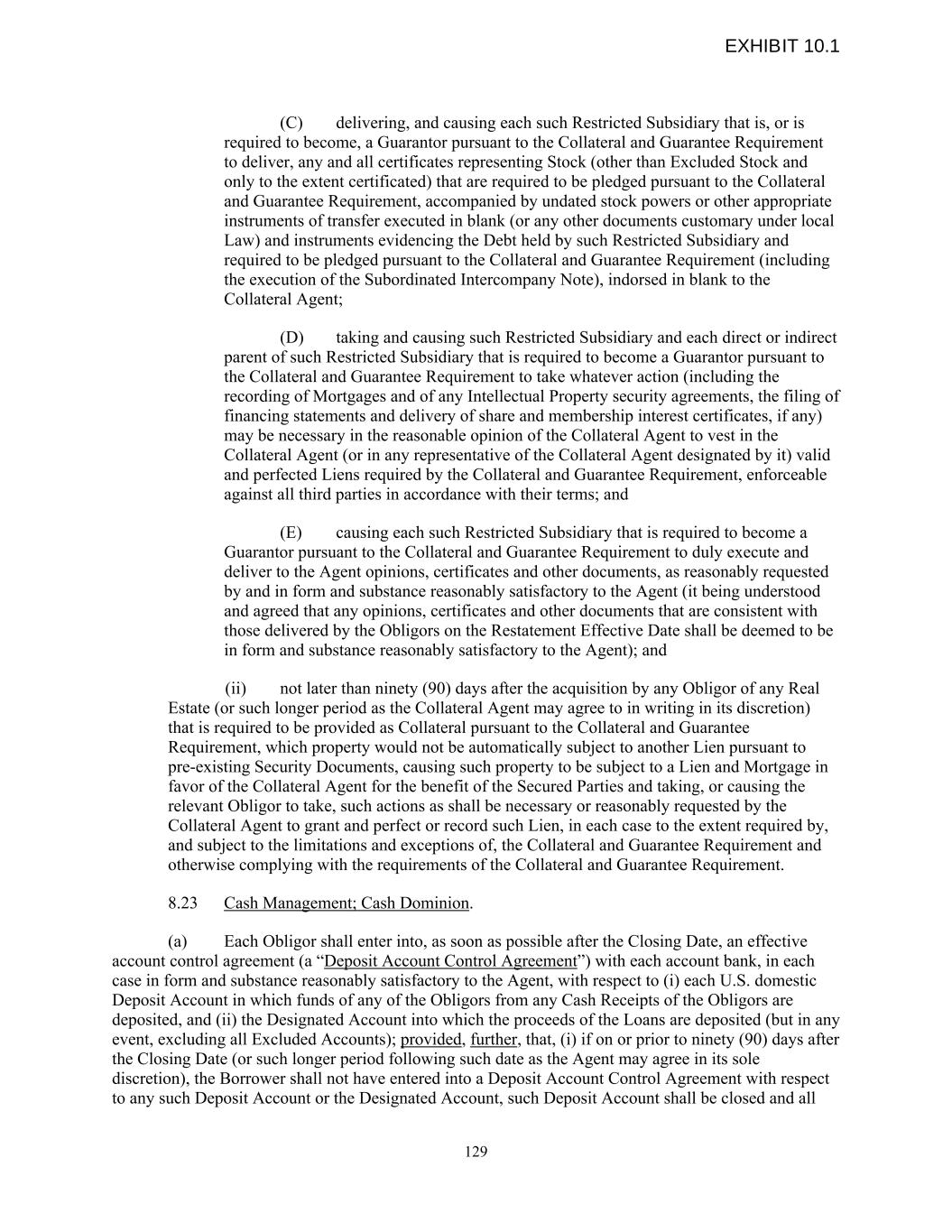 (C) delivering, and causing each such Restricted Subsidiary that is, or is required to become, a Guarantor pursuant to the Collateral and Guarantee Requirement to deliver, any and all certificates representing Stock (other than Excluded Stock and only to the extent certificated) that are required to be pledged pursuant to the Collateral and Guarantee Requirement, accompanied by undated stock powers or other appropriate instruments of transfer executed in blank (or any other documents customary under local Law) and instruments evidencing the Debt held by such Restricted Subsidiary and required to be pledged pursuant to the Collateral and Guarantee Requirement (including the execution of the Subordinated Intercompany Note), indorsed in blank to the Collateral Agent; (D) taking and causing such Restricted Subsidiary and each direct or indirect parent of such Restricted Subsidiary that is required to become a Guarantor pursuant to the Collateral and Guarantee Requirement to take whatever action (including the recording of Mortgages and of any Intellectual Property security agreements, the filing of financing statements and delivery of share and membership interest certificates, if any) may be necessary in the reasonable opinion of the Collateral Agent to vest in the Collateral Agent (or in any representative of the Collateral Agent designated by it) valid and perfected Liens required by the Collateral and Guarantee Requirement, enforceable against all third parties in accordance with their terms; and (E) causing each such Restricted Subsidiary that is required to become a Guarantor pursuant to the Collateral and Guarantee Requirement to duly execute and deliver to the Agent opinions, certificates and other documents, as reasonably requested by and in form and substance reasonably satisfactory to the Agent (it being understood and agreed that any opinions, certificates and other documents that are consistent with those delivered by the Obligors on the Restatement Effective Date shall be deemed to be in form and substance reasonably satisfactory to the Agent); and (ii) not later than ninety (90) days after the acquisition by any Obligor of any Real Estate (or such longer period as the Collateral Agent may agree to in writing in its discretion) that is required to be provided as Collateral pursuant to the Collateral and Guarantee Requirement, which property would not be automatically subject to another Lien pursuant to pre-existing Security Documents, causing such property to be subject to a Lien and Mortgage in favor of the Collateral Agent for the benefit of the Secured Parties and taking, or causing the relevant Obligor to take, such actions as shall be necessary or reasonably requested by the Collateral Agent to grant and perfect or record such Lien, in each case to the extent required by, and subject to the limitations and exceptions of, the Collateral and Guarantee Requirement and otherwise complying with the requirements of the Collateral and Guarantee Requirement. 8.23 Cash Management; Cash Dominion. (a) Each Obligor shall enter into, as soon as possible after the Closing Date, an effective account control agreement (a “Deposit Account Control Agreement”) with each account bank, in each case in form and substance reasonably satisfactory to the Agent, with respect to (i) each U.S. domestic Deposit Account in which funds of any of the Obligors from any Cash Receipts of the Obligors are deposited, and (ii) the Designated Account into which the proceeds of the Loans are deposited (but in any event, excluding all Excluded Accounts); provided, further, that, (i) if on or prior to ninety (90) days after the Closing Date (or such longer period following such date as the Agent may agree in its sole discretion), the Borrower shall not have entered into a Deposit Account Control Agreement with respect to any such Deposit Account or the Designated Account, such Deposit Account shall be closed and all 129 EXHIBIT 10.1