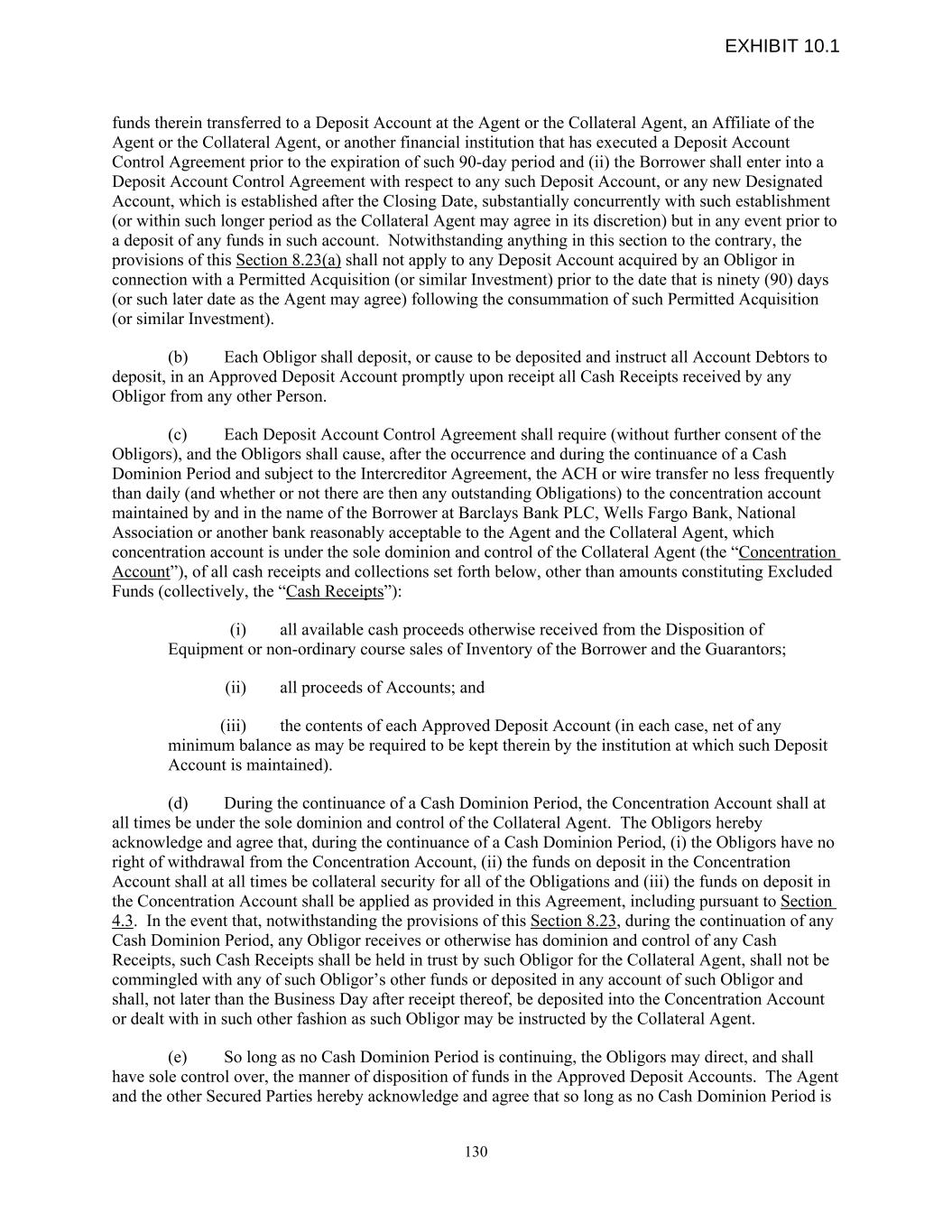 funds therein transferred to a Deposit Account at the Agent or the Collateral Agent, an Affiliate of the Agent or the Collateral Agent, or another financial institution that has executed a Deposit Account Control Agreement prior to the expiration of such 90-day period and (ii) the Borrower shall enter into a Deposit Account Control Agreement with respect to any such Deposit Account, or any new Designated Account, which is established after the Closing Date, substantially concurrently with such establishment (or within such longer period as the Collateral Agent may agree in its discretion) but in any event prior to a deposit of any funds in such account. Notwithstanding anything in this section to the contrary, the provisions of this Section 8.23(a) shall not apply to any Deposit Account acquired by an Obligor in connection with a Permitted Acquisition (or similar Investment) prior to the date that is ninety (90) days (or such later date as the Agent may agree) following the consummation of such Permitted Acquisition (or similar Investment). (b) Each Obligor shall deposit, or cause to be deposited and instruct all Account Debtors to deposit, in an Approved Deposit Account promptly upon receipt all Cash Receipts received by any Obligor from any other Person. (c) Each Deposit Account Control Agreement shall require (without further consent of the Obligors), and the Obligors shall cause, after the occurrence and during the continuance of a Cash Dominion Period and subject to the Intercreditor Agreement, the ACH or wire transfer no less frequently than daily (and whether or not there are then any outstanding Obligations) to the concentration account maintained by and in the name of the Borrower at Barclays Bank PLC, Wells Fargo Bank, National Association or another bank reasonably acceptable to the Agent and the Collateral Agent, which concentration account is under the sole dominion and control of the Collateral Agent (the “Concentration Account”), of all cash receipts and collections set forth below, other than amounts constituting Excluded Funds (collectively, the “Cash Receipts”): (i) all available cash proceeds otherwise received from the Disposition of Equipment or non-ordinary course sales of Inventory of the Borrower and the Guarantors; (ii) all proceeds of Accounts; and (iii) the contents of each Approved Deposit Account (in each case, net of any minimum balance as may be required to be kept therein by the institution at which such Deposit Account is maintained). (d) During the continuance of a Cash Dominion Period, the Concentration Account shall at all times be under the sole dominion and control of the Collateral Agent. The Obligors hereby acknowledge and agree that, during the continuance of a Cash Dominion Period, (i) the Obligors have no right of withdrawal from the Concentration Account, (ii) the funds on deposit in the Concentration Account shall at all times be collateral security for all of the Obligations and (iii) the funds on deposit in the Concentration Account shall be applied as provided in this Agreement, including pursuant to Section 4.3. In the event that, notwithstanding the provisions of this Section 8.23, during the continuation of any Cash Dominion Period, any Obligor receives or otherwise has dominion and control of any Cash Receipts, such Cash Receipts shall be held in trust by such Obligor for the Collateral Agent, shall not be commingled with any of such Obligor’s other funds or deposited in any account of such Obligor and shall, not later than the Business Day after receipt thereof, be deposited into the Concentration Account or dealt with in such other fashion as such Obligor may be instructed by the Collateral Agent. (e) So long as no Cash Dominion Period is continuing, the Obligors may direct, and shall have sole control over, the manner of disposition of funds in the Approved Deposit Accounts. The Agent and the other Secured Parties hereby acknowledge and agree that so long as no Cash Dominion Period is 130 EXHIBIT 10.1