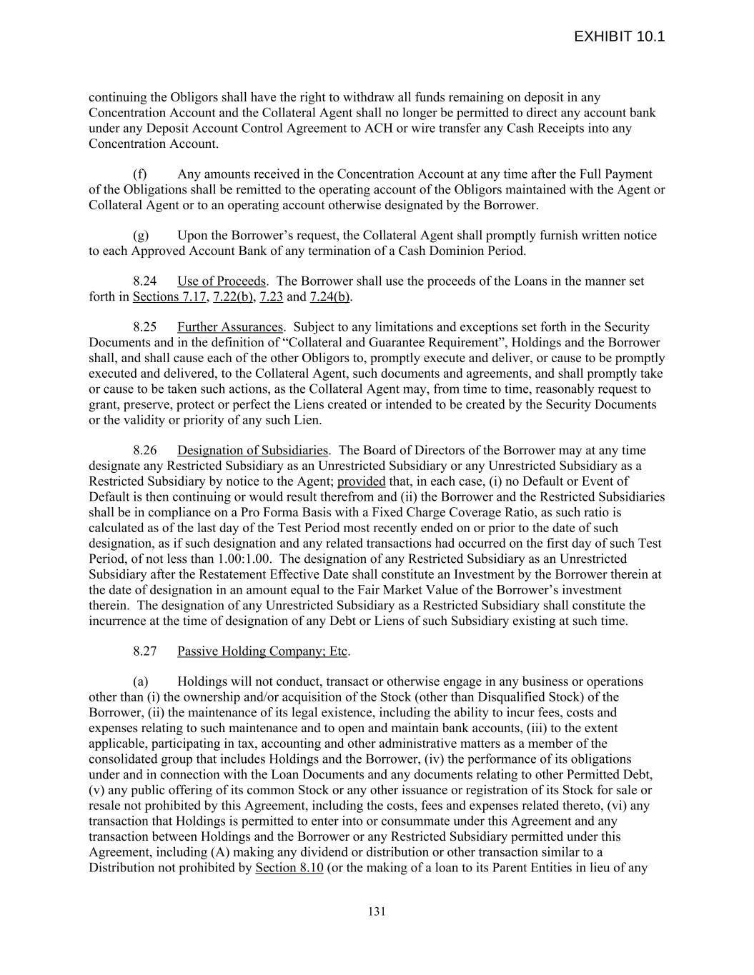 continuing the Obligors shall have the right to withdraw all funds remaining on deposit in any Concentration Account and the Collateral Agent shall no longer be permitted to direct any account bank under any Deposit Account Control Agreement to ACH or wire transfer any Cash Receipts into any Concentration Account. (f) Any amounts received in the Concentration Account at any time after the Full Payment of the Obligations shall be remitted to the operating account of the Obligors maintained with the Agent or Collateral Agent or to an operating account otherwise designated by the Borrower. (g) Upon the Borrower’s request, the Collateral Agent shall promptly furnish written notice to each Approved Account Bank of any termination of a Cash Dominion Period. 8.24 Use of Proceeds. The Borrower shall use the proceeds of the Loans in the manner set forth in Sections 7.17, 7.22(b), 7.23 and 7.24(b). 8.25 Further Assurances. Subject to any limitations and exceptions set forth in the Security Documents and in the definition of “Collateral and Guarantee Requirement”, Holdings and the Borrower shall, and shall cause each of the other Obligors to, promptly execute and deliver, or cause to be promptly executed and delivered, to the Collateral Agent, such documents and agreements, and shall promptly take or cause to be taken such actions, as the Collateral Agent may, from time to time, reasonably request to grant, preserve, protect or perfect the Liens created or intended to be created by the Security Documents or the validity or priority of any such Lien. 8.26 Designation of Subsidiaries. The Board of Directors of the Borrower may at any time designate any Restricted Subsidiary as an Unrestricted Subsidiary or any Unrestricted Subsidiary as a Restricted Subsidiary by notice to the Agent; provided that, in each case, (i) no Default or Event of Default is then continuing or would result therefrom and (ii) the Borrower and the Restricted Subsidiaries shall be in compliance on a Pro Forma Basis with a Fixed Charge Coverage Ratio, as such ratio is calculated as of the last day of the Test Period most recently ended on or prior to the date of such designation, as if such designation and any related transactions had occurred on the first day of such Test Period, of not less than 1.00:1.00. The designation of any Restricted Subsidiary as an Unrestricted Subsidiary after the Restatement Effective Date shall constitute an Investment by the Borrower therein at the date of designation in an amount equal to the Fair Market Value of the Borrower’s investment therein. The designation of any Unrestricted Subsidiary as a Restricted Subsidiary shall constitute the incurrence at the time of designation of any Debt or Liens of such Subsidiary existing at such time. 8.27 Passive Holding Company; Etc. (a) Holdings will not conduct, transact or otherwise engage in any business or operations other than (i) the ownership and/or acquisition of the Stock (other than Disqualified Stock) of the Borrower, (ii) the maintenance of its legal existence, including the ability to incur fees, costs and expenses relating to such maintenance and to open and maintain bank accounts, (iii) to the extent applicable, participating in tax, accounting and other administrative matters as a member of the consolidated group that includes Holdings and the Borrower, (iv) the performance of its obligations under and in connection with the Loan Documents and any documents relating to other Permitted Debt, (v) any public offering of its common Stock or any other issuance or registration of its Stock for sale or resale not prohibited by this Agreement, including the costs, fees and expenses related thereto, (vi) any transaction that Holdings is permitted to enter into or consummate under this Agreement and any transaction between Holdings and the Borrower or any Restricted Subsidiary permitted under this Agreement, including (A) making any dividend or distribution or other transaction similar to a Distribution not prohibited by Section 8.10 (or the making of a loan to its Parent Entities in lieu of any 131 EXHIBIT 10.1