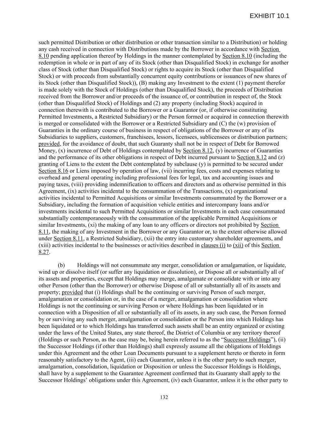 such permitted Distribution or other distribution or other transaction similar to a Distribution) or holding any cash received in connection with Distributions made by the Borrower in accordance with Section 8.10 pending application thereof by Holdings in the manner contemplated by Section 8.10 (including the redemption in whole or in part of any of its Stock (other than Disqualified Stock) in exchange for another class of Stock (other than Disqualified Stock) or rights to acquire its Stock (other than Disqualified Stock) or with proceeds from substantially concurrent equity contributions or issuances of new shares of its Stock (other than Disqualified Stock)), (B) making any Investment to the extent (1) payment therefor is made solely with the Stock of Holdings (other than Disqualified Stock), the proceeds of Distribution received from the Borrower and/or proceeds of the issuance of, or contribution in respect of, the Stock (other than Disqualified Stock) of Holdings and (2) any property (including Stock) acquired in connection therewith is contributed to the Borrower or a Guarantor (or, if otherwise constituting Permitted Investments, a Restricted Subsidiary) or the Person formed or acquired in connection therewith is merged or consolidated with the Borrower or a Restricted Subsidiary and (C) the (w) provision of Guaranties in the ordinary course of business in respect of obligations of the Borrower or any of its Subsidiaries to suppliers, customers, franchisees, lessors, licensees, sublicensees or distribution partners; provided, for the avoidance of doubt, that such Guaranty shall not be in respect of Debt for Borrowed Money, (x) incurrence of Debt of Holdings contemplated by Section 8.12, (y) incurrence of Guaranties and the performance of its other obligations in respect of Debt incurred pursuant to Section 8.12 and (z) granting of Liens to the extent the Debt contemplated by subclause (y) is permitted to be secured under Section 8.16 or Liens imposed by operation of law, (vii) incurring fees, costs and expenses relating to overhead and general operating including professional fees for legal, tax and accounting issues and paying taxes, (viii) providing indemnification to officers and directors and as otherwise permitted in this Agreement, (ix) activities incidental to the consummation of the Transactions, (x) organizational activities incidental to Permitted Acquisitions or similar Investments consummated by the Borrower or a Subsidiary, including the formation of acquisition vehicle entities and intercompany loans and/or investments incidental to such Permitted Acquisitions or similar Investments in each case consummated substantially contemporaneously with the consummation of the applicable Permitted Acquisitions or similar Investments, (xi) the making of any loan to any officers or directors not prohibited by Section 8.11, the making of any Investment in the Borrower or any Guarantor or, to the extent otherwise allowed under Section 8.11, a Restricted Subsidiary, (xii) the entry into customary shareholder agreements, and (xiii) activities incidental to the businesses or activities described in clauses (i) to (xii) of this Section 8.27. (b) Holdings will not consummate any merger, consolidation or amalgamation, or liquidate, wind up or dissolve itself (or suffer any liquidation or dissolution), or Dispose all or substantially all of its assets and properties, except that Holdings may merge, amalgamate or consolidate with or into any other Person (other than the Borrower) or otherwise Dispose of all or substantially all of its assets and property; provided that (i) Holdings shall be the continuing or surviving Person of such merger, amalgamation or consolidation or, in the case of a merger, amalgamation or consolidation where Holdings is not the continuing or surviving Person or where Holdings has been liquidated or in connection with a Disposition of all or substantially all of its assets, in any such case, the Person formed by or surviving any such merger, amalgamation or consolidation or the Person into which Holdings has been liquidated or to which Holdings has transferred such assets shall be an entity organized or existing under the laws of the United States, any state thereof, the District of Columbia or any territory thereof (Holdings or such Person, as the case may be, being herein referred to as the “Successor Holdings”), (ii) the Successor Holdings (if other than Holdings) shall expressly assume all the obligations of Holdings under this Agreement and the other Loan Documents pursuant to a supplement hereto or thereto in form reasonably satisfactory to the Agent, (iii) each Guarantor, unless it is the other party to such merger, amalgamation, consolidation, liquidation or Disposition or unless the Successor Holdings is Holdings, shall have by a supplement to the Guarantee Agreement confirmed that its Guaranty shall apply to the Successor Holdings’ obligations under this Agreement, (iv) each Guarantor, unless it is the other party to 132 EXHIBIT 10.1