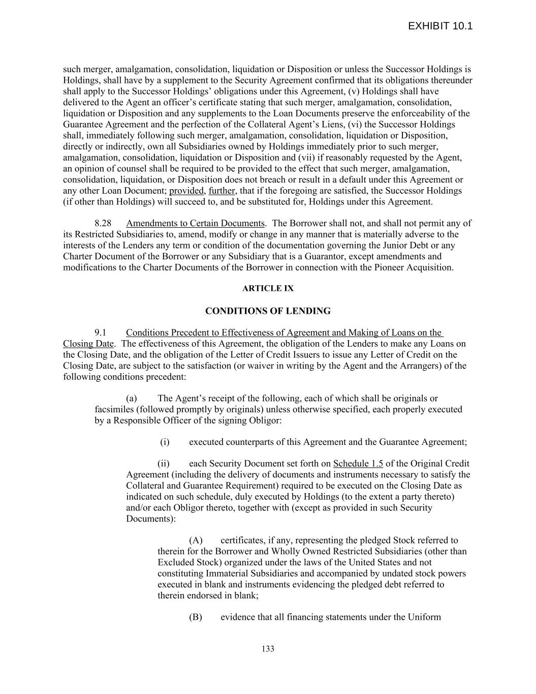 such merger, amalgamation, consolidation, liquidation or Disposition or unless the Successor Holdings is Holdings, shall have by a supplement to the Security Agreement confirmed that its obligations thereunder shall apply to the Successor Holdings’ obligations under this Agreement, (v) Holdings shall have delivered to the Agent an officer’s certificate stating that such merger, amalgamation, consolidation, liquidation or Disposition and any supplements to the Loan Documents preserve the enforceability of the Guarantee Agreement and the perfection of the Collateral Agent’s Liens, (vi) the Successor Holdings shall, immediately following such merger, amalgamation, consolidation, liquidation or Disposition, directly or indirectly, own all Subsidiaries owned by Holdings immediately prior to such merger, amalgamation, consolidation, liquidation or Disposition and (vii) if reasonably requested by the Agent, an opinion of counsel shall be required to be provided to the effect that such merger, amalgamation, consolidation, liquidation, or Disposition does not breach or result in a default under this Agreement or any other Loan Document; provided, further, that if the foregoing are satisfied, the Successor Holdings (if other than Holdings) will succeed to, and be substituted for, Holdings under this Agreement. 8.28 Amendments to Certain Documents. The Borrower shall not, and shall not permit any of its Restricted Subsidiaries to, amend, modify or change in any manner that is materially adverse to the interests of the Lenders any term or condition of the documentation governing the Junior Debt or any Charter Document of the Borrower or any Subsidiary that is a Guarantor, except amendments and modifications to the Charter Documents of the Borrower in connection with the Pioneer Acquisition. ARTICLE IX CONDITIONS OF LENDING 9.1 Conditions Precedent to Effectiveness of Agreement and Making of Loans on the Closing Date. The effectiveness of this Agreement, the obligation of the Lenders to make any Loans on the Closing Date, and the obligation of the Letter of Credit Issuers to issue any Letter of Credit on the Closing Date, are subject to the satisfaction (or waiver in writing by the Agent and the Arrangers) of the following conditions precedent: (a) The Agent’s receipt of the following, each of which shall be originals or facsimiles (followed promptly by originals) unless otherwise specified, each properly executed by a Responsible Officer of the signing Obligor: (i) executed counterparts of this Agreement and the Guarantee Agreement; (ii) each Security Document set forth on Schedule 1.5 of the Original Credit Agreement (including the delivery of documents and instruments necessary to satisfy the Collateral and Guarantee Requirement) required to be executed on the Closing Date as indicated on such schedule, duly executed by Holdings (to the extent a party thereto) and/or each Obligor thereto, together with (except as provided in such Security Documents): (A) certificates, if any, representing the pledged Stock referred to therein for the Borrower and Wholly Owned Restricted Subsidiaries (other than Excluded Stock) organized under the laws of the United States and not constituting Immaterial Subsidiaries and accompanied by undated stock powers executed in blank and instruments evidencing the pledged debt referred to therein endorsed in blank; (B) evidence that all financing statements under the Uniform 133 EXHIBIT 10.1