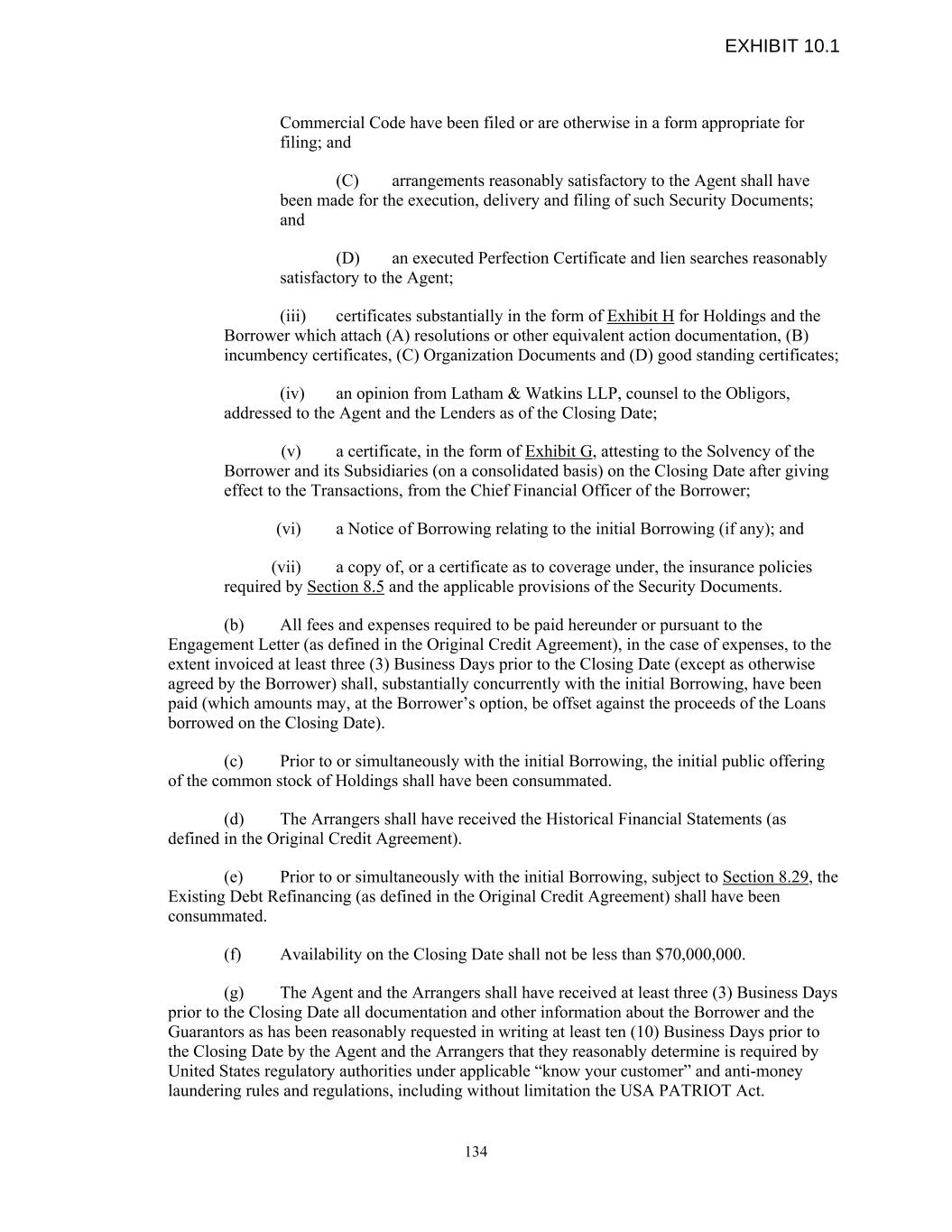 Commercial Code have been filed or are otherwise in a form appropriate for filing; and (C) arrangements reasonably satisfactory to the Agent shall have been made for the execution, delivery and filing of such Security Documents; and (D) an executed Perfection Certificate and lien searches reasonably satisfactory to the Agent; (iii) certificates substantially in the form of Exhibit H for Holdings and the Borrower which attach (A) resolutions or other equivalent action documentation, (B) incumbency certificates, (C) Organization Documents and (D) good standing certificates; (iv) an opinion from Latham & Watkins LLP, counsel to the Obligors, addressed to the Agent and the Lenders as of the Closing Date; (v) a certificate, in the form of Exhibit G, attesting to the Solvency of the Borrower and its Subsidiaries (on a consolidated basis) on the Closing Date after giving effect to the Transactions, from the Chief Financial Officer of the Borrower; (vi) a Notice of Borrowing relating to the initial Borrowing (if any); and (vii) a copy of, or a certificate as to coverage under, the insurance policies required by Section 8.5 and the applicable provisions of the Security Documents. (b) All fees and expenses required to be paid hereunder or pursuant to the Engagement Letter (as defined in the Original Credit Agreement), in the case of expenses, to the extent invoiced at least three (3) Business Days prior to the Closing Date (except as otherwise agreed by the Borrower) shall, substantially concurrently with the initial Borrowing, have been paid (which amounts may, at the Borrower’s option, be offset against the proceeds of the Loans borrowed on the Closing Date). (c) Prior to or simultaneously with the initial Borrowing, the initial public offering of the common stock of Holdings shall have been consummated. (d) The Arrangers shall have received the Historical Financial Statements (as defined in the Original Credit Agreement). (e) Prior to or simultaneously with the initial Borrowing, subject to Section 8.29, the Existing Debt Refinancing (as defined in the Original Credit Agreement) shall have been consummated. (f) Availability on the Closing Date shall not be less than $70,000,000. (g) The Agent and the Arrangers shall have received at least three (3) Business Days prior to the Closing Date all documentation and other information about the Borrower and the Guarantors as has been reasonably requested in writing at least ten (10) Business Days prior to the Closing Date by the Agent and the Arrangers that they reasonably determine is required by United States regulatory authorities under applicable “know your customer” and anti-money laundering rules and regulations, including without limitation the USA PATRIOT Act. 134 EXHIBIT 10.1