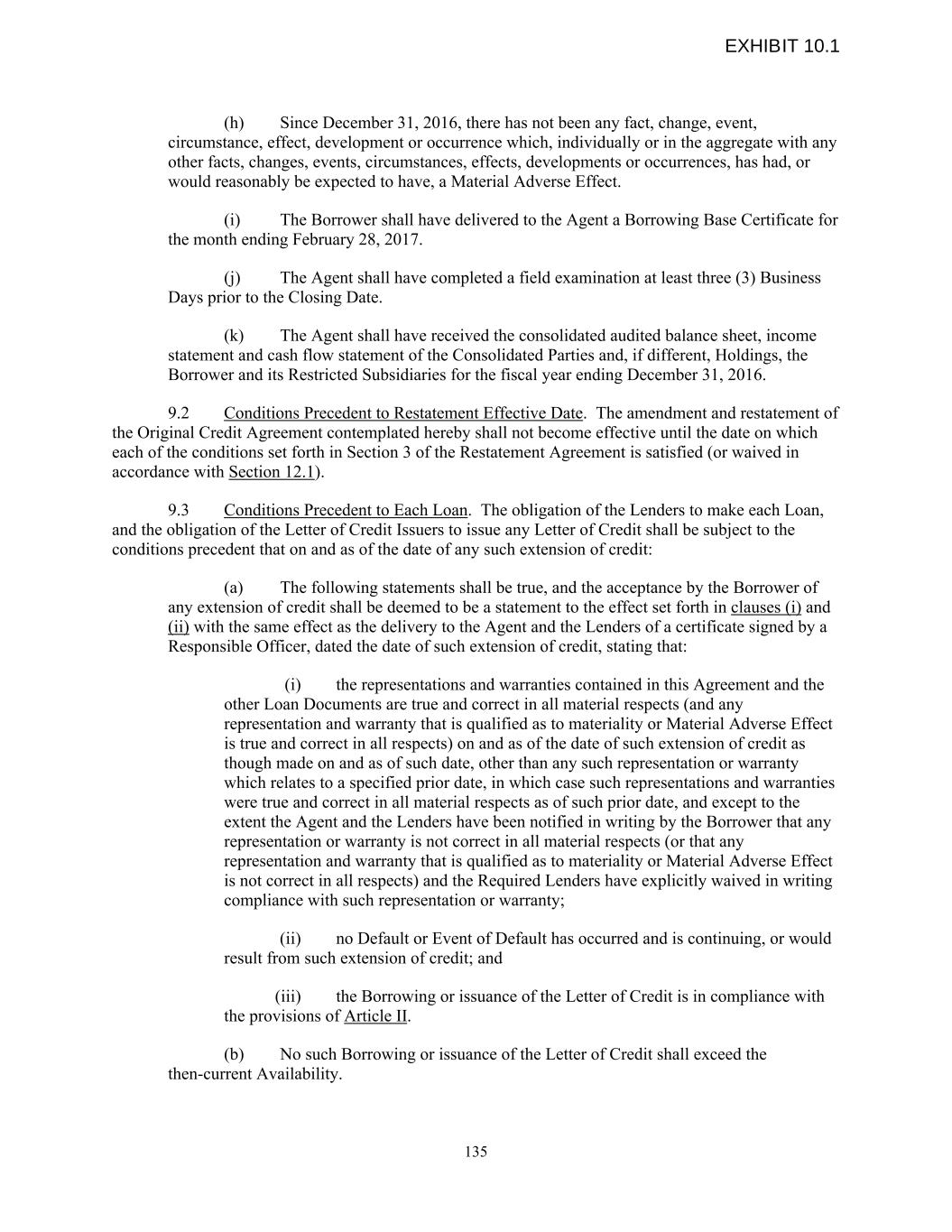 (h) Since December 31, 2016, there has not been any fact, change, event, circumstance, effect, development or occurrence which, individually or in the aggregate with any other facts, changes, events, circumstances, effects, developments or occurrences, has had, or would reasonably be expected to have, a Material Adverse Effect. (i) The Borrower shall have delivered to the Agent a Borrowing Base Certificate for the month ending February 28, 2017. (j) The Agent shall have completed a field examination at least three (3) Business Days prior to the Closing Date. (k) The Agent shall have received the consolidated audited balance sheet, income statement and cash flow statement of the Consolidated Parties and, if different, Holdings, the Borrower and its Restricted Subsidiaries for the fiscal year ending December 31, 2016. 9.2 Conditions Precedent to Restatement Effective Date. The amendment and restatement of the Original Credit Agreement contemplated hereby shall not become effective until the date on which each of the conditions set forth in Section 3 of the Restatement Agreement is satisfied (or waived in accordance with Section 12.1). 9.3 Conditions Precedent to Each Loan. The obligation of the Lenders to make each Loan, and the obligation of the Letter of Credit Issuers to issue any Letter of Credit shall be subject to the conditions precedent that on and as of the date of any such extension of credit: (a) The following statements shall be true, and the acceptance by the Borrower of any extension of credit shall be deemed to be a statement to the effect set forth in clauses (i) and (ii) with the same effect as the delivery to the Agent and the Lenders of a certificate signed by a Responsible Officer, dated the date of such extension of credit, stating that: (i) the representations and warranties contained in this Agreement and the other Loan Documents are true and correct in all material respects (and any representation and warranty that is qualified as to materiality or Material Adverse Effect is true and correct in all respects) on and as of the date of such extension of credit as though made on and as of such date, other than any such representation or warranty which relates to a specified prior date, in which case such representations and warranties were true and correct in all material respects as of such prior date, and except to the extent the Agent and the Lenders have been notified in writing by the Borrower that any representation or warranty is not correct in all material respects (or that any representation and warranty that is qualified as to materiality or Material Adverse Effect is not correct in all respects) and the Required Lenders have explicitly waived in writing compliance with such representation or warranty; (ii) no Default or Event of Default has occurred and is continuing, or would result from such extension of credit; and (iii) the Borrowing or issuance of the Letter of Credit is in compliance with the provisions of Article II. (b) No such Borrowing or issuance of the Letter of Credit shall exceed the then-current Availability. 135 EXHIBIT 10.1