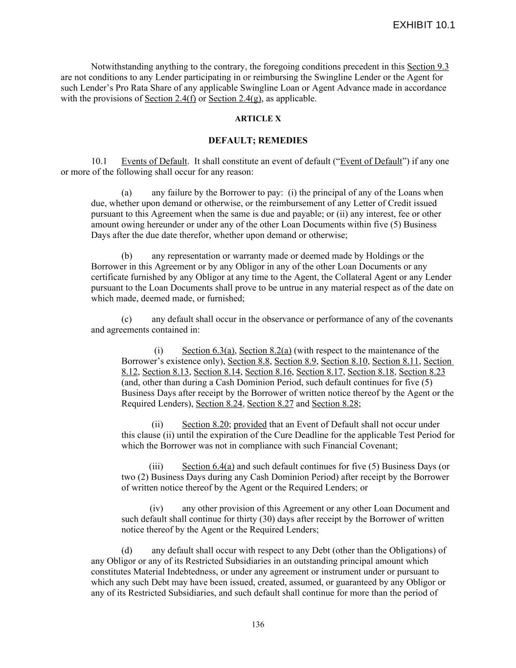 Notwithstanding anything to the contrary, the foregoing conditions precedent in this Section 9.3 are not conditions to any Lender participating in or reimbursing the Swingline Lender or the Agent for such Lender’s Pro Rata Share of any applicable Swingline Loan or Agent Advance made in accordance with the provisions of Section 2.4(f) or Section 2.4(g), as applicable. ARTICLE X DEFAULT; REMEDIES 10.1 Events of Default. It shall constitute an event of default (“Event of Default”) if any one or more of the following shall occur for any reason: (a) any failure by the Borrower to pay: (i) the principal of any of the Loans when due, whether upon demand or otherwise, or the reimbursement of any Letter of Credit issued pursuant to this Agreement when the same is due and payable; or (ii) any interest, fee or other amount owing hereunder or under any of the other Loan Documents within five (5) Business Days after the due date therefor, whether upon demand or otherwise; (b) any representation or warranty made or deemed made by Holdings or the Borrower in this Agreement or by any Obligor in any of the other Loan Documents or any certificate furnished by any Obligor at any time to the Agent, the Collateral Agent or any Lender pursuant to the Loan Documents shall prove to be untrue in any material respect as of the date on which made, deemed made, or furnished; (c) any default shall occur in the observance or performance of any of the covenants and agreements contained in: (i) Section 6.3(a), Section 8.2(a) (with respect to the maintenance of the Borrower’s existence only), Section 8.8, Section 8.9, Section 8.10, Section 8.11, Section 8.12, Section 8.13, Section 8.14, Section 8.16, Section 8.17, Section 8.18, Section 8.23 (and, other than during a Cash Dominion Period, such default continues for five (5) Business Days after receipt by the Borrower of written notice thereof by the Agent or the Required Lenders), Section 8.24, Section 8.27 and Section 8.28; (ii) Section 8.20; provided that an Event of Default shall not occur under this clause (ii) until the expiration of the Cure Deadline for the applicable Test Period for which the Borrower was not in compliance with such Financial Covenant; (iii) Section 6.4(a) and such default continues for five (5) Business Days (or two (2) Business Days during any Cash Dominion Period) after receipt by the Borrower of written notice thereof by the Agent or the Required Lenders; or (iv) any other provision of this Agreement or any other Loan Document and such default shall continue for thirty (30) days after receipt by the Borrower of written notice thereof by the Agent or the Required Lenders; (d) any default shall occur with respect to any Debt (other than the Obligations) of any Obligor or any of its Restricted Subsidiaries in an outstanding principal amount which constitutes Material Indebtedness, or under any agreement or instrument under or pursuant to which any such Debt may have been issued, created, assumed, or guaranteed by any Obligor or any of its Restricted Subsidiaries, and such default shall continue for more than the period of 136 EXHIBIT 10.1