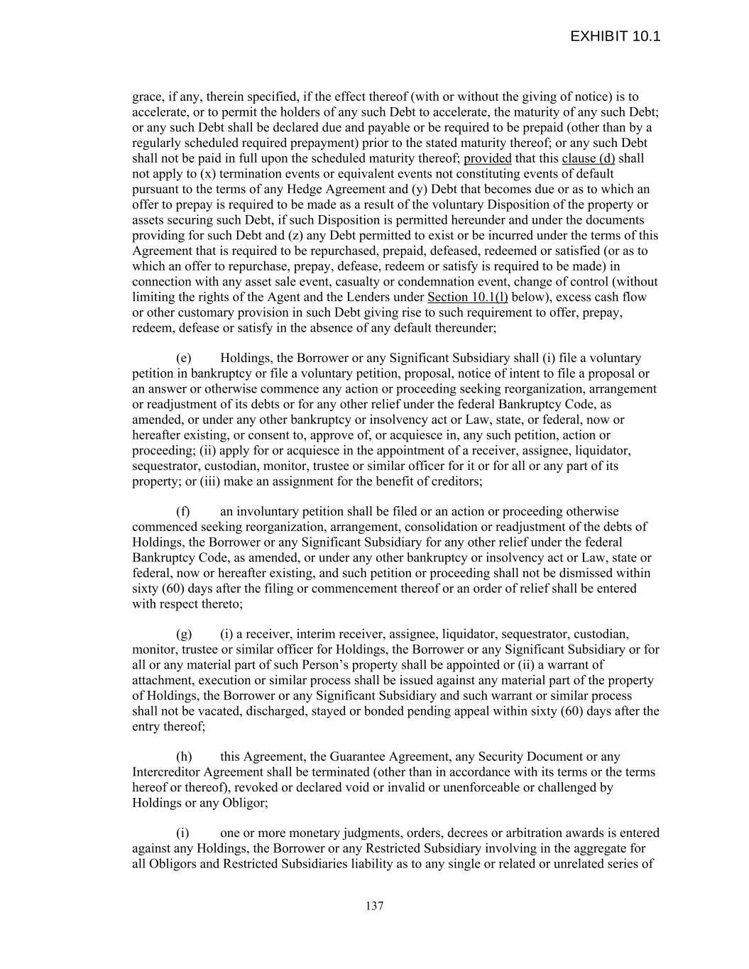 grace, if any, therein specified, if the effect thereof (with or without the giving of notice) is to accelerate, or to permit the holders of any such Debt to accelerate, the maturity of any such Debt; or any such Debt shall be declared due and payable or be required to be prepaid (other than by a regularly scheduled required prepayment) prior to the stated maturity thereof; or any such Debt shall not be paid in full upon the scheduled maturity thereof; provided that this clause (d) shall not apply to (x) termination events or equivalent events not constituting events of default pursuant to the terms of any Hedge Agreement and (y) Debt that becomes due or as to which an offer to prepay is required to be made as a result of the voluntary Disposition of the property or assets securing such Debt, if such Disposition is permitted hereunder and under the documents providing for such Debt and (z) any Debt permitted to exist or be incurred under the terms of this Agreement that is required to be repurchased, prepaid, defeased, redeemed or satisfied (or as to which an offer to repurchase, prepay, defease, redeem or satisfy is required to be made) in connection with any asset sale event, casualty or condemnation event, change of control (without limiting the rights of the Agent and the Lenders under Section 10.1(l) below), excess cash flow or other customary provision in such Debt giving rise to such requirement to offer, prepay, redeem, defease or satisfy in the absence of any default thereunder; (e) Holdings, the Borrower or any Significant Subsidiary shall (i) file a voluntary petition in bankruptcy or file a voluntary petition, proposal, notice of intent to file a proposal or an answer or otherwise commence any action or proceeding seeking reorganization, arrangement or readjustment of its debts or for any other relief under the federal Bankruptcy Code, as amended, or under any other bankruptcy or insolvency act or Law, state, or federal, now or hereafter existing, or consent to, approve of, or acquiesce in, any such petition, action or proceeding; (ii) apply for or acquiesce in the appointment of a receiver, assignee, liquidator, sequestrator, custodian, monitor, trustee or similar officer for it or for all or any part of its property; or (iii) make an assignment for the benefit of creditors; (f) an involuntary petition shall be filed or an action or proceeding otherwise commenced seeking reorganization, arrangement, consolidation or readjustment of the debts of Holdings, the Borrower or any Significant Subsidiary for any other relief under the federal Bankruptcy Code, as amended, or under any other bankruptcy or insolvency act or Law, state or federal, now or hereafter existing, and such petition or proceeding shall not be dismissed within sixty (60) days after the filing or commencement thereof or an order of relief shall be entered with respect thereto; (g) (i) a receiver, interim receiver, assignee, liquidator, sequestrator, custodian, monitor, trustee or similar officer for Holdings, the Borrower or any Significant Subsidiary or for all or any material part of such Person’s property shall be appointed or (ii) a warrant of attachment, execution or similar process shall be issued against any material part of the property of Holdings, the Borrower or any Significant Subsidiary and such warrant or similar process shall not be vacated, discharged, stayed or bonded pending appeal within sixty (60) days after the entry thereof; (h) this Agreement, the Guarantee Agreement, any Security Document or any Intercreditor Agreement shall be terminated (other than in accordance with its terms or the terms hereof or thereof), revoked or declared void or invalid or unenforceable or challenged by Holdings or any Obligor; (i) one or more monetary judgments, orders, decrees or arbitration awards is entered against any Holdings, the Borrower or any Restricted Subsidiary involving in the aggregate for all Obligors and Restricted Subsidiaries liability as to any single or related or unrelated series of 137 EXHIBIT 10.1