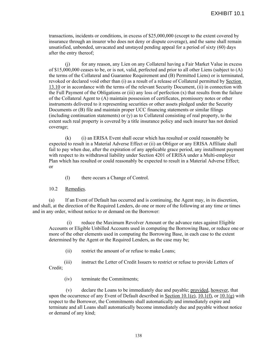 transactions, incidents or conditions, in excess of $25,000,000 (except to the extent covered by insurance through an insurer who does not deny or dispute coverage), and the same shall remain unsatisfied, unbonded, unvacated and unstayed pending appeal for a period of sixty (60) days after the entry thereof; (j) for any reason, any Lien on any Collateral having a Fair Market Value in excess of $15,000,000 ceases to be, or is not, valid, perfected and prior to all other Liens (subject to (A) the terms of the Collateral and Guarantee Requirement and (B) Permitted Liens) or is terminated, revoked or declared void other than (i) as a result of a release of Collateral permitted by Section 13.10 or in accordance with the terms of the relevant Security Document, (ii) in connection with the Full Payment of the Obligations or (iii) any loss of perfection (x) that results from the failure of the Collateral Agent to (A) maintain possession of certificates, promissory notes or other instruments delivered to it representing securities or other assets pledged under the Security Documents or (B) file and maintain proper UCC financing statements or similar filings (including continuation statements) or (y) as to Collateral consisting of real property, to the extent such real property is covered by a title insurance policy and such insurer has not denied coverage; (k) (i) an ERISA Event shall occur which has resulted or could reasonably be expected to result in a Material Adverse Effect or (ii) an Obligor or any ERISA Affiliate shall fail to pay when due, after the expiration of any applicable grace period, any installment payment with respect to its withdrawal liability under Section 4201 of ERISA under a Multi-employer Plan which has resulted or could reasonably be expected to result in a Material Adverse Effect; or (l) there occurs a Change of Control. 10.2 Remedies. (a) If an Event of Default has occurred and is continuing, the Agent may, in its discretion, and shall, at the direction of the Required Lenders, do one or more of the following at any time or times and in any order, without notice to or demand on the Borrower: (i) reduce the Maximum Revolver Amount or the advance rates against Eligible Accounts or Eligible Unbilled Accounts used in computing the Borrowing Base, or reduce one or more of the other elements used in computing the Borrowing Base, in each case to the extent determined by the Agent or the Required Lenders, as the case may be; (ii) restrict the amount of or refuse to make Loans; (iii) instruct the Letter of Credit Issuers to restrict or refuse to provide Letters of Credit; (iv) terminate the Commitments; (v) declare the Loans to be immediately due and payable; provided, however, that upon the occurrence of any Event of Default described in Section 10.1(e), 10.1(f), or 10.1(g) with respect to the Borrower, the Commitments shall automatically and immediately expire and terminate and all Loans shall automatically become immediately due and payable without notice or demand of any kind; 138 EXHIBIT 10.1