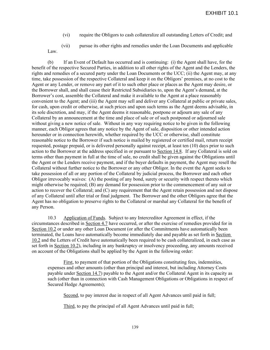 (vi) require the Obligors to cash collateralize all outstanding Letters of Credit; and (vii) pursue its other rights and remedies under the Loan Documents and applicable Law. (b) If an Event of Default has occurred and is continuing: (i) the Agent shall have, for the benefit of the respective Secured Parties, in addition to all other rights of the Agent and the Lenders, the rights and remedies of a secured party under the Loan Documents or the UCC; (ii) the Agent may, at any time, take possession of the respective Collateral and keep it on the Obligors’ premises, at no cost to the Agent or any Lender, or remove any part of it to such other place or places as the Agent may desire, or the Borrower shall, and shall cause their Restricted Subsidiaries to, upon the Agent’s demand, at the Borrower’s cost, assemble the Collateral and make it available to the Agent at a place reasonably convenient to the Agent; and (iii) the Agent may sell and deliver any Collateral at public or private sales, for cash, upon credit or otherwise, at such prices and upon such terms as the Agent deems advisable, in its sole discretion, and may, if the Agent deems it reasonable, postpone or adjourn any sale of any Collateral by an announcement at the time and place of sale or of such postponed or adjourned sale without giving a new notice of sale. Without in any way requiring notice to be given in the following manner, each Obligor agrees that any notice by the Agent of sale, disposition or other intended action hereunder or in connection herewith, whether required by the UCC or otherwise, shall constitute reasonable notice to the Borrower if such notice is mailed by registered or certified mail, return receipt requested, postage prepaid, or is delivered personally against receipt, at least ten (10) days prior to such action to the Borrower at the address specified in or pursuant to Section 14.8. If any Collateral is sold on terms other than payment in full at the time of sale, no credit shall be given against the Obligations until the Agent or the Lenders receive payment, and if the buyer defaults in payment, the Agent may resell the Collateral without further notice to the Borrower or any other Obligor. In the event the Agent seeks to take possession of all or any portion of the Collateral by judicial process, the Borrower and each other Obligor irrevocably waives: (A) the posting of any bond, surety or security with respect thereto which might otherwise be required; (B) any demand for possession prior to the commencement of any suit or action to recover the Collateral; and (C) any requirement that the Agent retain possession and not dispose of any Collateral until after trial or final judgment. The Borrower and the other Obligors agree that the Agent has no obligation to preserve rights to the Collateral or marshal any Collateral for the benefit of any Person. 10.3 Application of Funds. Subject to any Intercreditor Agreement in effect, if the circumstances described in Section 4.7 have occurred, or after the exercise of remedies provided for in Section 10.2 or under any other Loan Document (or after the Commitments have automatically been terminated, the Loans have automatically become immediately due and payable as set forth in Section 10.2 and the Letters of Credit have automatically been required to be cash collateralized, in each case as set forth in Section 10.2), including in any bankruptcy or insolvency proceeding, any amounts received on account of the Obligations shall be applied by the Agent in the following order: First, to payment of that portion of the Obligations constituting fees, indemnities, expenses and other amounts (other than principal and interest, but including Attorney Costs payable under Section 14.7) payable to the Agent and/or the Collateral Agent in its capacity as such (other than in connection with Cash Management Obligations or Obligations in respect of Secured Hedge Agreements); Second, to pay interest due in respect of all Agent Advances until paid in full; Third, to pay the principal of all Agent Advances until paid in full; 139 EXHIBIT 10.1