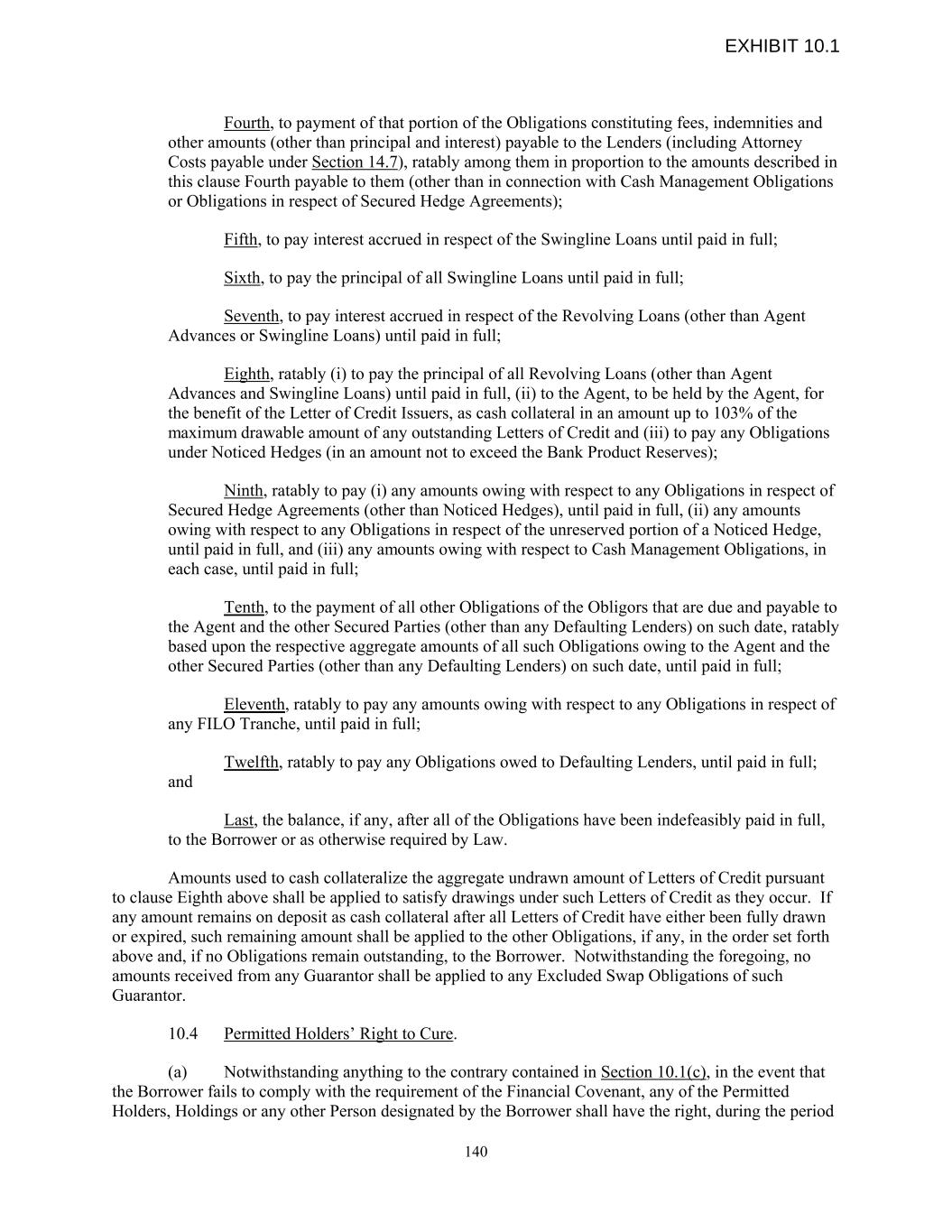 Fourth, to payment of that portion of the Obligations constituting fees, indemnities and other amounts (other than principal and interest) payable to the Lenders (including Attorney Costs payable under Section 14.7), ratably among them in proportion to the amounts described in this clause Fourth payable to them (other than in connection with Cash Management Obligations or Obligations in respect of Secured Hedge Agreements); Fifth, to pay interest accrued in respect of the Swingline Loans until paid in full; Sixth, to pay the principal of all Swingline Loans until paid in full; Seventh, to pay interest accrued in respect of the Revolving Loans (other than Agent Advances or Swingline Loans) until paid in full; Eighth, ratably (i) to pay the principal of all Revolving Loans (other than Agent Advances and Swingline Loans) until paid in full, (ii) to the Agent, to be held by the Agent, for the benefit of the Letter of Credit Issuers, as cash collateral in an amount up to 103% of the maximum drawable amount of any outstanding Letters of Credit and (iii) to pay any Obligations under Noticed Hedges (in an amount not to exceed the Bank Product Reserves); Ninth, ratably to pay (i) any amounts owing with respect to any Obligations in respect of Secured Hedge Agreements (other than Noticed Hedges), until paid in full, (ii) any amounts owing with respect to any Obligations in respect of the unreserved portion of a Noticed Hedge, until paid in full, and (iii) any amounts owing with respect to Cash Management Obligations, in each case, until paid in full; Tenth, to the payment of all other Obligations of the Obligors that are due and payable to the Agent and the other Secured Parties (other than any Defaulting Lenders) on such date, ratably based upon the respective aggregate amounts of all such Obligations owing to the Agent and the other Secured Parties (other than any Defaulting Lenders) on such date, until paid in full; Eleventh, ratably to pay any amounts owing with respect to any Obligations in respect of any FILO Tranche, until paid in full; Twelfth, ratably to pay any Obligations owed to Defaulting Lenders, until paid in full; and Last, the balance, if any, after all of the Obligations have been indefeasibly paid in full, to the Borrower or as otherwise required by Law. Amounts used to cash collateralize the aggregate undrawn amount of Letters of Credit pursuant to clause Eighth above shall be applied to satisfy drawings under such Letters of Credit as they occur. If any amount remains on deposit as cash collateral after all Letters of Credit have either been fully drawn or expired, such remaining amount shall be applied to the other Obligations, if any, in the order set forth above and, if no Obligations remain outstanding, to the Borrower. Notwithstanding the foregoing, no amounts received from any Guarantor shall be applied to any Excluded Swap Obligations of such Guarantor. 10.4 Permitted Holders’ Right to Cure. (a) Notwithstanding anything to the contrary contained in Section 10.1(c), in the event that the Borrower fails to comply with the requirement of the Financial Covenant, any of the Permitted Holders, Holdings or any other Person designated by the Borrower shall have the right, during the period 140 EXHIBIT 10.1