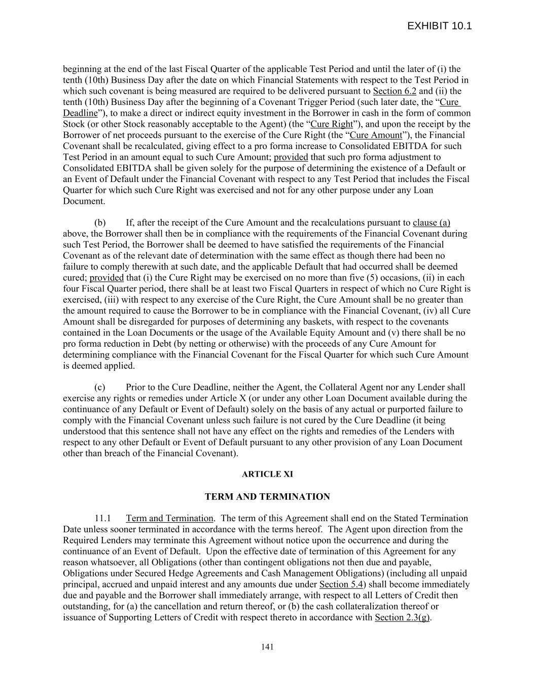 beginning at the end of the last Fiscal Quarter of the applicable Test Period and until the later of (i) the tenth (10th) Business Day after the date on which Financial Statements with respect to the Test Period in which such covenant is being measured are required to be delivered pursuant to Section 6.2 and (ii) the tenth (10th) Business Day after the beginning of a Covenant Trigger Period (such later date, the “Cure Deadline”), to make a direct or indirect equity investment in the Borrower in cash in the form of common Stock (or other Stock reasonably acceptable to the Agent) (the “Cure Right”), and upon the receipt by the Borrower of net proceeds pursuant to the exercise of the Cure Right (the “Cure Amount”), the Financial Covenant shall be recalculated, giving effect to a pro forma increase to Consolidated EBITDA for such Test Period in an amount equal to such Cure Amount; provided that such pro forma adjustment to Consolidated EBITDA shall be given solely for the purpose of determining the existence of a Default or an Event of Default under the Financial Covenant with respect to any Test Period that includes the Fiscal Quarter for which such Cure Right was exercised and not for any other purpose under any Loan Document. (b) If, after the receipt of the Cure Amount and the recalculations pursuant to clause (a) above, the Borrower shall then be in compliance with the requirements of the Financial Covenant during such Test Period, the Borrower shall be deemed to have satisfied the requirements of the Financial Covenant as of the relevant date of determination with the same effect as though there had been no failure to comply therewith at such date, and the applicable Default that had occurred shall be deemed cured; provided that (i) the Cure Right may be exercised on no more than five (5) occasions, (ii) in each four Fiscal Quarter period, there shall be at least two Fiscal Quarters in respect of which no Cure Right is exercised, (iii) with respect to any exercise of the Cure Right, the Cure Amount shall be no greater than the amount required to cause the Borrower to be in compliance with the Financial Covenant, (iv) all Cure Amount shall be disregarded for purposes of determining any baskets, with respect to the covenants contained in the Loan Documents or the usage of the Available Equity Amount and (v) there shall be no pro forma reduction in Debt (by netting or otherwise) with the proceeds of any Cure Amount for determining compliance with the Financial Covenant for the Fiscal Quarter for which such Cure Amount is deemed applied. (c) Prior to the Cure Deadline, neither the Agent, the Collateral Agent nor any Lender shall exercise any rights or remedies under Article X (or under any other Loan Document available during the continuance of any Default or Event of Default) solely on the basis of any actual or purported failure to comply with the Financial Covenant unless such failure is not cured by the Cure Deadline (it being understood that this sentence shall not have any effect on the rights and remedies of the Lenders with respect to any other Default or Event of Default pursuant to any other provision of any Loan Document other than breach of the Financial Covenant). ARTICLE XI TERM AND TERMINATION 11.1 Term and Termination. The term of this Agreement shall end on the Stated Termination Date unless sooner terminated in accordance with the terms hereof. The Agent upon direction from the Required Lenders may terminate this Agreement without notice upon the occurrence and during the continuance of an Event of Default. Upon the effective date of termination of this Agreement for any reason whatsoever, all Obligations (other than contingent obligations not then due and payable, Obligations under Secured Hedge Agreements and Cash Management Obligations) (including all unpaid principal, accrued and unpaid interest and any amounts due under Section 5.4) shall become immediately due and payable and the Borrower shall immediately arrange, with respect to all Letters of Credit then outstanding, for (a) the cancellation and return thereof, or (b) the cash collateralization thereof or issuance of Supporting Letters of Credit with respect thereto in accordance with Section 2.3(g). 141 EXHIBIT 10.1