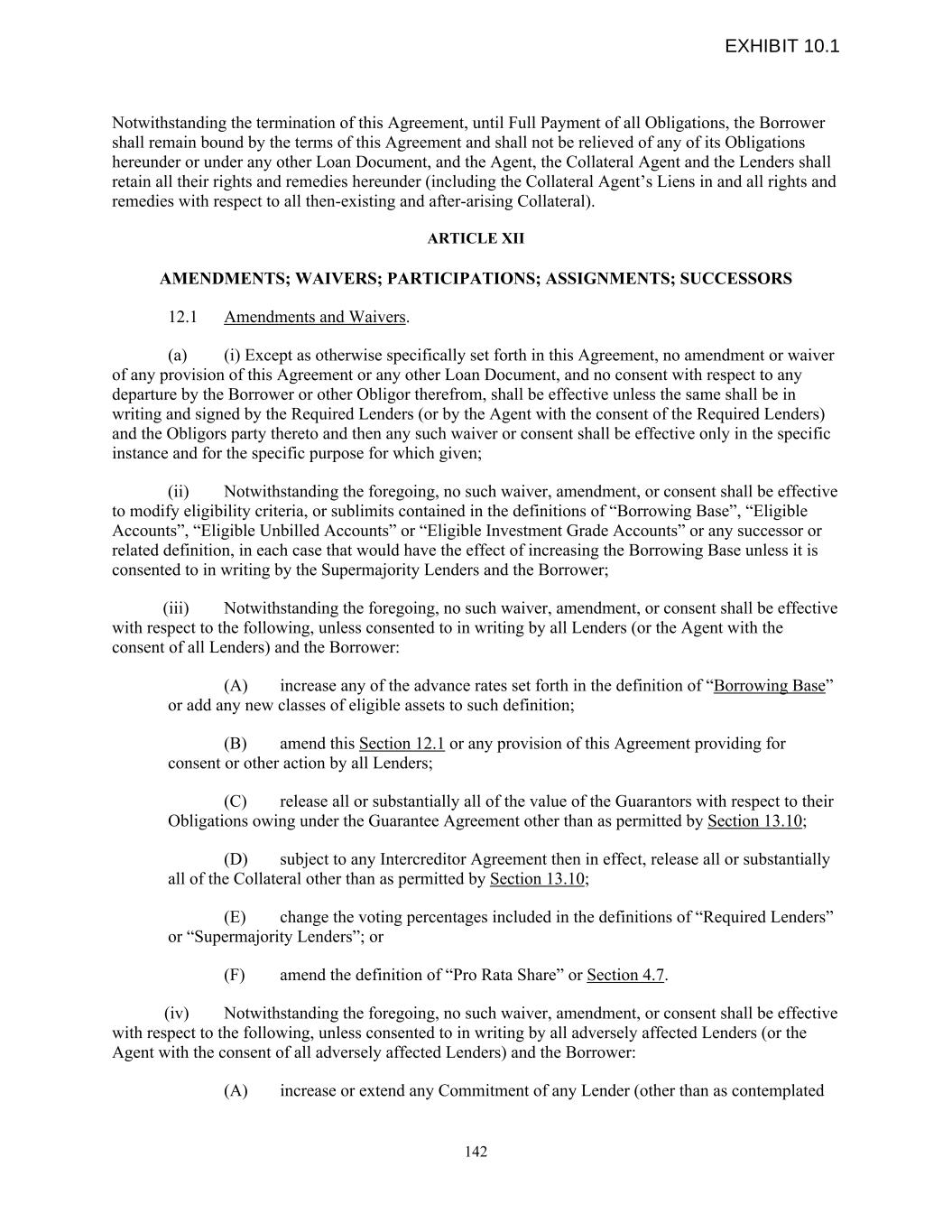 Notwithstanding the termination of this Agreement, until Full Payment of all Obligations, the Borrower shall remain bound by the terms of this Agreement and shall not be relieved of any of its Obligations hereunder or under any other Loan Document, and the Agent, the Collateral Agent and the Lenders shall retain all their rights and remedies hereunder (including the Collateral Agent’s Liens in and all rights and remedies with respect to all then-existing and after-arising Collateral). ARTICLE XII AMENDMENTS; WAIVERS; PARTICIPATIONS; ASSIGNMENTS; SUCCESSORS 12.1 Amendments and Waivers. (a) (i) Except as otherwise specifically set forth in this Agreement, no amendment or waiver of any provision of this Agreement or any other Loan Document, and no consent with respect to any departure by the Borrower or other Obligor therefrom, shall be effective unless the same shall be in writing and signed by the Required Lenders (or by the Agent with the consent of the Required Lenders) and the Obligors party thereto and then any such waiver or consent shall be effective only in the specific instance and for the specific purpose for which given; (ii) Notwithstanding the foregoing, no such waiver, amendment, or consent shall be effective to modify eligibility criteria, or sublimits contained in the definitions of “Borrowing Base”, “Eligible Accounts”, “Eligible Unbilled Accounts” or “Eligible Investment Grade Accounts” or any successor or related definition, in each case that would have the effect of increasing the Borrowing Base unless it is consented to in writing by the Supermajority Lenders and the Borrower; (iii) Notwithstanding the foregoing, no such waiver, amendment, or consent shall be effective with respect to the following, unless consented to in writing by all Lenders (or the Agent with the consent of all Lenders) and the Borrower: (A) increase any of the advance rates set forth in the definition of “Borrowing Base” or add any new classes of eligible assets to such definition; (B) amend this Section 12.1 or any provision of this Agreement providing for consent or other action by all Lenders; (C) release all or substantially all of the value of the Guarantors with respect to their Obligations owing under the Guarantee Agreement other than as permitted by Section 13.10; (D) subject to any Intercreditor Agreement then in effect, release all or substantially all of the Collateral other than as permitted by Section 13.10; (E) change the voting percentages included in the definitions of “Required Lenders” or “Supermajority Lenders”; or (F) amend the definition of “Pro Rata Share” or Section 4.7. (iv) Notwithstanding the foregoing, no such waiver, amendment, or consent shall be effective with respect to the following, unless consented to in writing by all adversely affected Lenders (or the Agent with the consent of all adversely affected Lenders) and the Borrower: (A) increase or extend any Commitment of any Lender (other than as contemplated 142 EXHIBIT 10.1