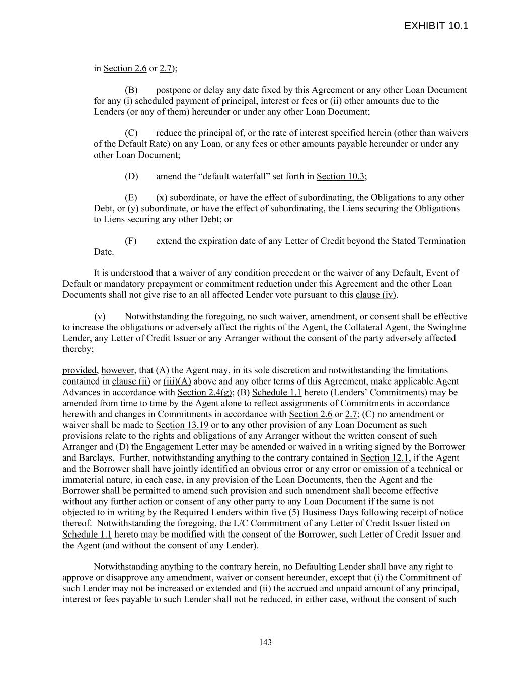 in Section 2.6 or 2.7); (B) postpone or delay any date fixed by this Agreement or any other Loan Document for any (i) scheduled payment of principal, interest or fees or (ii) other amounts due to the Lenders (or any of them) hereunder or under any other Loan Document; (C) reduce the principal of, or the rate of interest specified herein (other than waivers of the Default Rate) on any Loan, or any fees or other amounts payable hereunder or under any other Loan Document; (D) amend the “default waterfall” set forth in Section 10.3; (E) (x) subordinate, or have the effect of subordinating, the Obligations to any other Debt, or (y) subordinate, or have the effect of subordinating, the Liens securing the Obligations to Liens securing any other Debt; or (F) extend the expiration date of any Letter of Credit beyond the Stated Termination Date. It is understood that a waiver of any condition precedent or the waiver of any Default, Event of Default or mandatory prepayment or commitment reduction under this Agreement and the other Loan Documents shall not give rise to an all affected Lender vote pursuant to this clause (iv). (v) Notwithstanding the foregoing, no such waiver, amendment, or consent shall be effective to increase the obligations or adversely affect the rights of the Agent, the Collateral Agent, the Swingline Lender, any Letter of Credit Issuer or any Arranger without the consent of the party adversely affected thereby; provided, however, that (A) the Agent may, in its sole discretion and notwithstanding the limitations contained in clause (ii) or (iii)(A) above and any other terms of this Agreement, make applicable Agent Advances in accordance with Section 2.4(g); (B) Schedule 1.1 hereto (Lenders’ Commitments) may be amended from time to time by the Agent alone to reflect assignments of Commitments in accordance herewith and changes in Commitments in accordance with Section 2.6 or 2.7; (C) no amendment or waiver shall be made to Section 13.19 or to any other provision of any Loan Document as such provisions relate to the rights and obligations of any Arranger without the written consent of such Arranger and (D) the Engagement Letter may be amended or waived in a writing signed by the Borrower and Barclays. Further, notwithstanding anything to the contrary contained in Section 12.1, if the Agent and the Borrower shall have jointly identified an obvious error or any error or omission of a technical or immaterial nature, in each case, in any provision of the Loan Documents, then the Agent and the Borrower shall be permitted to amend such provision and such amendment shall become effective without any further action or consent of any other party to any Loan Document if the same is not objected to in writing by the Required Lenders within five (5) Business Days following receipt of notice thereof. Notwithstanding the foregoing, the L/C Commitment of any Letter of Credit Issuer listed on Schedule 1.1 hereto may be modified with the consent of the Borrower, such Letter of Credit Issuer and the Agent (and without the consent of any Lender). Notwithstanding anything to the contrary herein, no Defaulting Lender shall have any right to approve or disapprove any amendment, waiver or consent hereunder, except that (i) the Commitment of such Lender may not be increased or extended and (ii) the accrued and unpaid amount of any principal, interest or fees payable to such Lender shall not be reduced, in either case, without the consent of such 143 EXHIBIT 10.1