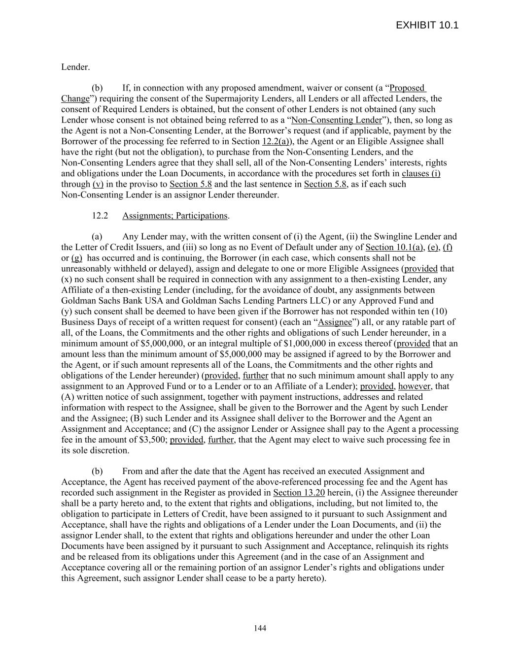 Lender. (b) If, in connection with any proposed amendment, waiver or consent (a “Proposed Change”) requiring the consent of the Supermajority Lenders, all Lenders or all affected Lenders, the consent of Required Lenders is obtained, but the consent of other Lenders is not obtained (any such Lender whose consent is not obtained being referred to as a “Non-Consenting Lender”), then, so long as the Agent is not a Non-Consenting Lender, at the Borrower’s request (and if applicable, payment by the Borrower of the processing fee referred to in Section 12.2(a)), the Agent or an Eligible Assignee shall have the right (but not the obligation), to purchase from the Non-Consenting Lenders, and the Non-Consenting Lenders agree that they shall sell, all of the Non-Consenting Lenders’ interests, rights and obligations under the Loan Documents, in accordance with the procedures set forth in clauses (i) through (v) in the proviso to Section 5.8 and the last sentence in Section 5.8, as if each such Non-Consenting Lender is an assignor Lender thereunder. 12.2 Assignments; Participations. (a) Any Lender may, with the written consent of (i) the Agent, (ii) the Swingline Lender and the Letter of Credit Issuers, and (iii) so long as no Event of Default under any of Section 10.1(a), (e), (f) or (g) has occurred and is continuing, the Borrower (in each case, which consents shall not be unreasonably withheld or delayed), assign and delegate to one or more Eligible Assignees (provided that (x) no such consent shall be required in connection with any assignment to a then-existing Lender, any Affiliate of a then-existing Lender (including, for the avoidance of doubt, any assignments between Goldman Sachs Bank USA and Goldman Sachs Lending Partners LLC) or any Approved Fund and (y) such consent shall be deemed to have been given if the Borrower has not responded within ten (10) Business Days of receipt of a written request for consent) (each an “Assignee”) all, or any ratable part of all, of the Loans, the Commitments and the other rights and obligations of such Lender hereunder, in a minimum amount of $5,000,000, or an integral multiple of $1,000,000 in excess thereof (provided that an amount less than the minimum amount of $5,000,000 may be assigned if agreed to by the Borrower and the Agent, or if such amount represents all of the Loans, the Commitments and the other rights and obligations of the Lender hereunder) (provided, further that no such minimum amount shall apply to any assignment to an Approved Fund or to a Lender or to an Affiliate of a Lender); provided, however, that (A) written notice of such assignment, together with payment instructions, addresses and related information with respect to the Assignee, shall be given to the Borrower and the Agent by such Lender and the Assignee; (B) such Lender and its Assignee shall deliver to the Borrower and the Agent an Assignment and Acceptance; and (C) the assignor Lender or Assignee shall pay to the Agent a processing fee in the amount of $3,500; provided, further, that the Agent may elect to waive such processing fee in its sole discretion. (b) From and after the date that the Agent has received an executed Assignment and Acceptance, the Agent has received payment of the above-referenced processing fee and the Agent has recorded such assignment in the Register as provided in Section 13.20 herein, (i) the Assignee thereunder shall be a party hereto and, to the extent that rights and obligations, including, but not limited to, the obligation to participate in Letters of Credit, have been assigned to it pursuant to such Assignment and Acceptance, shall have the rights and obligations of a Lender under the Loan Documents, and (ii) the assignor Lender shall, to the extent that rights and obligations hereunder and under the other Loan Documents have been assigned by it pursuant to such Assignment and Acceptance, relinquish its rights and be released from its obligations under this Agreement (and in the case of an Assignment and Acceptance covering all or the remaining portion of an assignor Lender’s rights and obligations under this Agreement, such assignor Lender shall cease to be a party hereto). 144 EXHIBIT 10.1