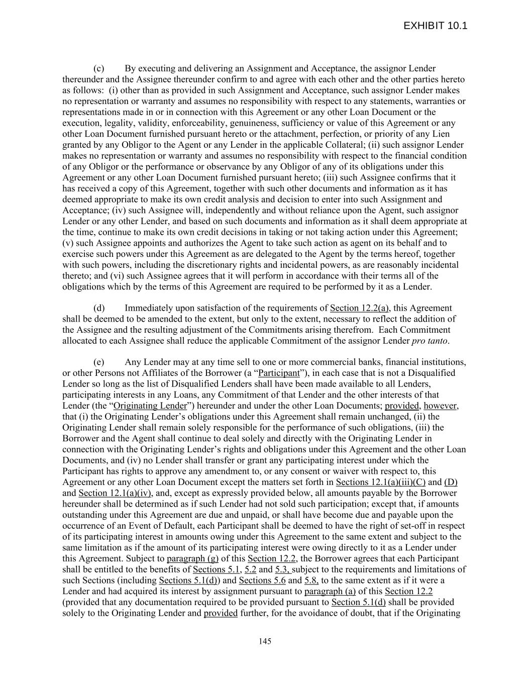 (c) By executing and delivering an Assignment and Acceptance, the assignor Lender thereunder and the Assignee thereunder confirm to and agree with each other and the other parties hereto as follows: (i) other than as provided in such Assignment and Acceptance, such assignor Lender makes no representation or warranty and assumes no responsibility with respect to any statements, warranties or representations made in or in connection with this Agreement or any other Loan Document or the execution, legality, validity, enforceability, genuineness, sufficiency or value of this Agreement or any other Loan Document furnished pursuant hereto or the attachment, perfection, or priority of any Lien granted by any Obligor to the Agent or any Lender in the applicable Collateral; (ii) such assignor Lender makes no representation or warranty and assumes no responsibility with respect to the financial condition of any Obligor or the performance or observance by any Obligor of any of its obligations under this Agreement or any other Loan Document furnished pursuant hereto; (iii) such Assignee confirms that it has received a copy of this Agreement, together with such other documents and information as it has deemed appropriate to make its own credit analysis and decision to enter into such Assignment and Acceptance; (iv) such Assignee will, independently and without reliance upon the Agent, such assignor Lender or any other Lender, and based on such documents and information as it shall deem appropriate at the time, continue to make its own credit decisions in taking or not taking action under this Agreement; (v) such Assignee appoints and authorizes the Agent to take such action as agent on its behalf and to exercise such powers under this Agreement as are delegated to the Agent by the terms hereof, together with such powers, including the discretionary rights and incidental powers, as are reasonably incidental thereto; and (vi) such Assignee agrees that it will perform in accordance with their terms all of the obligations which by the terms of this Agreement are required to be performed by it as a Lender. (d) Immediately upon satisfaction of the requirements of Section 12.2(a), this Agreement shall be deemed to be amended to the extent, but only to the extent, necessary to reflect the addition of the Assignee and the resulting adjustment of the Commitments arising therefrom. Each Commitment allocated to each Assignee shall reduce the applicable Commitment of the assignor Lender pro tanto. (e) Any Lender may at any time sell to one or more commercial banks, financial institutions, or other Persons not Affiliates of the Borrower (a “Participant”), in each case that is not a Disqualified Lender so long as the list of Disqualified Lenders shall have been made available to all Lenders, participating interests in any Loans, any Commitment of that Lender and the other interests of that Lender (the “Originating Lender”) hereunder and under the other Loan Documents; provided, however, that (i) the Originating Lender’s obligations under this Agreement shall remain unchanged, (ii) the Originating Lender shall remain solely responsible for the performance of such obligations, (iii) the Borrower and the Agent shall continue to deal solely and directly with the Originating Lender in connection with the Originating Lender’s rights and obligations under this Agreement and the other Loan Documents, and (iv) no Lender shall transfer or grant any participating interest under which the Participant has rights to approve any amendment to, or any consent or waiver with respect to, this Agreement or any other Loan Document except the matters set forth in Sections 12.1(a)(iii)(C) and (D) and Section 12.1(a)(iv), and, except as expressly provided below, all amounts payable by the Borrower hereunder shall be determined as if such Lender had not sold such participation; except that, if amounts outstanding under this Agreement are due and unpaid, or shall have become due and payable upon the occurrence of an Event of Default, each Participant shall be deemed to have the right of set-off in respect of its participating interest in amounts owing under this Agreement to the same extent and subject to the same limitation as if the amount of its participating interest were owing directly to it as a Lender under this Agreement. Subject to paragraph (g) of this Section 12.2, the Borrower agrees that each Participant shall be entitled to the benefits of Sections 5.1, 5.2 and 5.3, subject to the requirements and limitations of such Sections (including Sections 5.1(d)) and Sections 5.6 and 5.8, to the same extent as if it were a Lender and had acquired its interest by assignment pursuant to paragraph (a) of this Section 12.2 (provided that any documentation required to be provided pursuant to Section 5.1(d) shall be provided solely to the Originating Lender and provided further, for the avoidance of doubt, that if the Originating 145 EXHIBIT 10.1