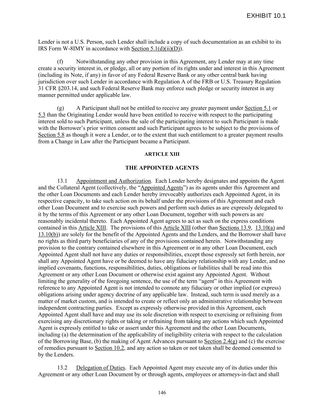 Lender is not a U.S. Person, such Lender shall include a copy of such documentation as an exhibit to its IRS Form W-8IMY in accordance with Section 5.1(d)(ii)(D)). (f) Notwithstanding any other provision in this Agreement, any Lender may at any time create a security interest in, or pledge, all or any portion of its rights under and interest in this Agreement (including its Note, if any) in favor of any Federal Reserve Bank or any other central bank having jurisdiction over such Lender in accordance with Regulation A of the FRB or U.S. Treasury Regulation 31 CFR §203.14, and such Federal Reserve Bank may enforce such pledge or security interest in any manner permitted under applicable law. (g) A Participant shall not be entitled to receive any greater payment under Section 5.1 or 5.3 than the Originating Lender would have been entitled to receive with respect to the participating interest sold to such Participant, unless the sale of the participating interest to such Participant is made with the Borrower’s prior written consent and such Participant agrees to be subject to the provisions of Section 5.8 as though it were a Lender, or to the extent that such entitlement to a greater payment results from a Change in Law after the Participant became a Participant. ARTICLE XIII THE APPOINTED AGENTS 13.1 Appointment and Authorization. Each Lender hereby designates and appoints the Agent and the Collateral Agent (collectively, the “Appointed Agents”) as its agents under this Agreement and the other Loan Documents and each Lender hereby irrevocably authorizes each Appointed Agent, in its respective capacity, to take such action on its behalf under the provisions of this Agreement and each other Loan Document and to exercise such powers and perform such duties as are expressly delegated to it by the terms of this Agreement or any other Loan Document, together with such powers as are reasonably incidental thereto. Each Appointed Agent agrees to act as such on the express conditions contained in this Article XIII. The provisions of this Article XIII (other than Sections 13.9, 13.10(a) and 13.10(b)) are solely for the benefit of the Appointed Agents and the Lenders, and the Borrower shall have no rights as third party beneficiaries of any of the provisions contained herein. Notwithstanding any provision to the contrary contained elsewhere in this Agreement or in any other Loan Document, each Appointed Agent shall not have any duties or responsibilities, except those expressly set forth herein, nor shall any Appointed Agent have or be deemed to have any fiduciary relationship with any Lender, and no implied covenants, functions, responsibilities, duties, obligations or liabilities shall be read into this Agreement or any other Loan Document or otherwise exist against any Appointed Agent. Without limiting the generality of the foregoing sentence, the use of the term “agent” in this Agreement with reference to any Appointed Agent is not intended to connote any fiduciary or other implied (or express) obligations arising under agency doctrine of any applicable law. Instead, such term is used merely as a matter of market custom, and is intended to create or reflect only an administrative relationship between independent contracting parties. Except as expressly otherwise provided in this Agreement, each Appointed Agent shall have and may use its sole discretion with respect to exercising or refraining from exercising any discretionary rights or taking or refraining from taking any actions which such Appointed Agent is expressly entitled to take or assert under this Agreement and the other Loan Documents, including (a) the determination of the applicability of ineligibility criteria with respect to the calculation of the Borrowing Base, (b) the making of Agent Advances pursuant to Section 2.4(g) and (c) the exercise of remedies pursuant to Section 10.2, and any action so taken or not taken shall be deemed consented to by the Lenders. 13.2 Delegation of Duties. Each Appointed Agent may execute any of its duties under this Agreement or any other Loan Document by or through agents, employees or attorneys-in-fact and shall 146 EXHIBIT 10.1