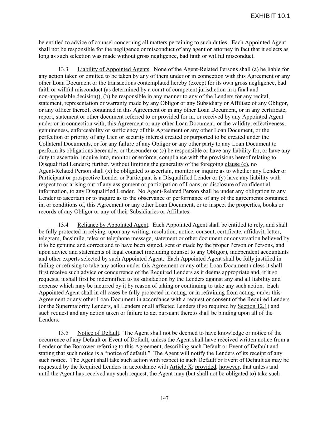 be entitled to advice of counsel concerning all matters pertaining to such duties. Each Appointed Agent shall not be responsible for the negligence or misconduct of any agent or attorney in fact that it selects as long as such selection was made without gross negligence, bad faith or willful misconduct. 13.3 Liability of Appointed Agents. None of the Agent-Related Persons shall (a) be liable for any action taken or omitted to be taken by any of them under or in connection with this Agreement or any other Loan Document or the transactions contemplated hereby (except for its own gross negligence, bad faith or willful misconduct (as determined by a court of competent jurisdiction in a final and non-appealable decision)), (b) be responsible in any manner to any of the Lenders for any recital, statement, representation or warranty made by any Obligor or any Subsidiary or Affiliate of any Obligor, or any officer thereof, contained in this Agreement or in any other Loan Document, or in any certificate, report, statement or other document referred to or provided for in, or received by any Appointed Agent under or in connection with, this Agreement or any other Loan Document, or the validity, effectiveness, genuineness, enforceability or sufficiency of this Agreement or any other Loan Document, or the perfection or priority of any Lien or security interest created or purported to be created under the Collateral Documents, or for any failure of any Obligor or any other party to any Loan Document to perform its obligations hereunder or thereunder or (c) be responsible or have any liability for, or have any duty to ascertain, inquire into, monitor or enforce, compliance with the provisions hereof relating to Disqualified Lenders; further, without limiting the generality of the foregoing clause (c), no Agent-Related Person shall (x) be obligated to ascertain, monitor or inquire as to whether any Lender or Participant or prospective Lender or Participant is a Disqualified Lender or (y) have any liability with respect to or arising out of any assignment or participation of Loans, or disclosure of confidential information, to any Disqualified Lender. No Agent-Related Person shall be under any obligation to any Lender to ascertain or to inquire as to the observance or performance of any of the agreements contained in, or conditions of, this Agreement or any other Loan Document, or to inspect the properties, books or records of any Obligor or any of their Subsidiaries or Affiliates. 13.4 Reliance by Appointed Agent. Each Appointed Agent shall be entitled to rely, and shall be fully protected in relying, upon any writing, resolution, notice, consent, certificate, affidavit, letter, telegram, facsimile, telex or telephone message, statement or other document or conversation believed by it to be genuine and correct and to have been signed, sent or made by the proper Person or Persons, and upon advice and statements of legal counsel (including counsel to any Obligor), independent accountants and other experts selected by such Appointed Agent. Each Appointed Agent shall be fully justified in failing or refusing to take any action under this Agreement or any other Loan Document unless it shall first receive such advice or concurrence of the Required Lenders as it deems appropriate and, if it so requests, it shall first be indemnified to its satisfaction by the Lenders against any and all liability and expense which may be incurred by it by reason of taking or continuing to take any such action. Each Appointed Agent shall in all cases be fully protected in acting, or in refraining from acting, under this Agreement or any other Loan Document in accordance with a request or consent of the Required Lenders (or the Supermajority Lenders, all Lenders or all affected Lenders if so required by Section 12.1) and such request and any action taken or failure to act pursuant thereto shall be binding upon all of the Lenders. 13.5 Notice of Default. The Agent shall not be deemed to have knowledge or notice of the occurrence of any Default or Event of Default, unless the Agent shall have received written notice from a Lender or the Borrower referring to this Agreement, describing such Default or Event of Default and stating that such notice is a “notice of default.” The Agent will notify the Lenders of its receipt of any such notice. The Agent shall take such action with respect to such Default or Event of Default as may be requested by the Required Lenders in accordance with Article X; provided, however, that unless and until the Agent has received any such request, the Agent may (but shall not be obligated to) take such 147 EXHIBIT 10.1