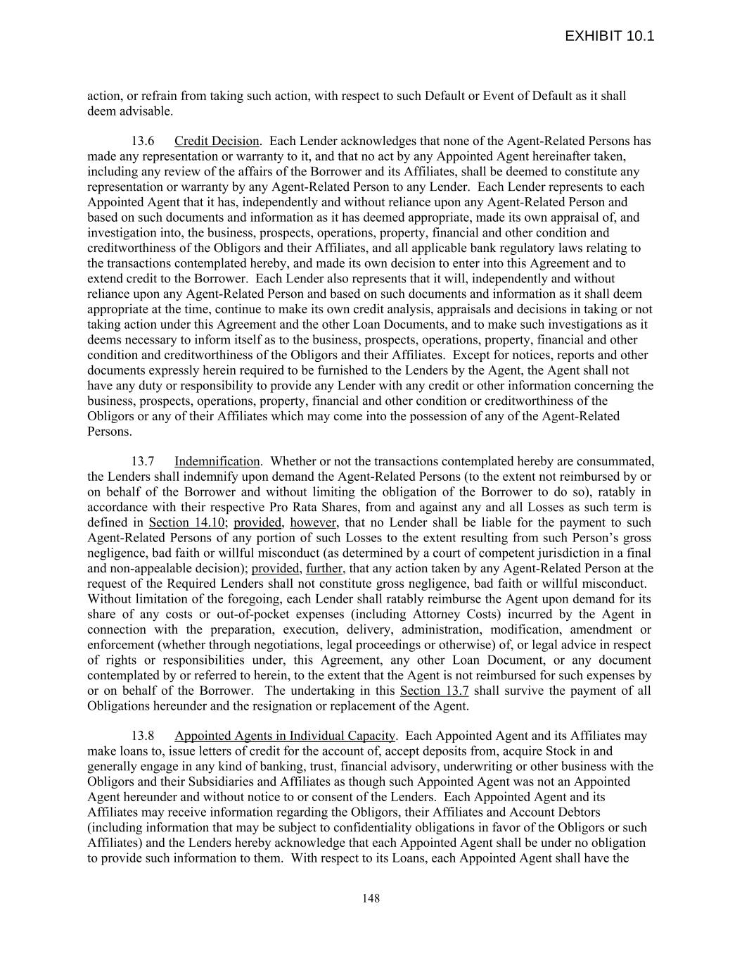 action, or refrain from taking such action, with respect to such Default or Event of Default as it shall deem advisable. 13.6 Credit Decision. Each Lender acknowledges that none of the Agent-Related Persons has made any representation or warranty to it, and that no act by any Appointed Agent hereinafter taken, including any review of the affairs of the Borrower and its Affiliates, shall be deemed to constitute any representation or warranty by any Agent-Related Person to any Lender. Each Lender represents to each Appointed Agent that it has, independently and without reliance upon any Agent-Related Person and based on such documents and information as it has deemed appropriate, made its own appraisal of, and investigation into, the business, prospects, operations, property, financial and other condition and creditworthiness of the Obligors and their Affiliates, and all applicable bank regulatory laws relating to the transactions contemplated hereby, and made its own decision to enter into this Agreement and to extend credit to the Borrower. Each Lender also represents that it will, independently and without reliance upon any Agent-Related Person and based on such documents and information as it shall deem appropriate at the time, continue to make its own credit analysis, appraisals and decisions in taking or not taking action under this Agreement and the other Loan Documents, and to make such investigations as it deems necessary to inform itself as to the business, prospects, operations, property, financial and other condition and creditworthiness of the Obligors and their Affiliates. Except for notices, reports and other documents expressly herein required to be furnished to the Lenders by the Agent, the Agent shall not have any duty or responsibility to provide any Lender with any credit or other information concerning the business, prospects, operations, property, financial and other condition or creditworthiness of the Obligors or any of their Affiliates which may come into the possession of any of the Agent-Related Persons. 13.7 Indemnification. Whether or not the transactions contemplated hereby are consummated, the Lenders shall indemnify upon demand the Agent-Related Persons (to the extent not reimbursed by or on behalf of the Borrower and without limiting the obligation of the Borrower to do so), ratably in accordance with their respective Pro Rata Shares, from and against any and all Losses as such term is defined in Section 14.10; provided, however, that no Lender shall be liable for the payment to such Agent-Related Persons of any portion of such Losses to the extent resulting from such Person’s gross negligence, bad faith or willful misconduct (as determined by a court of competent jurisdiction in a final and non-appealable decision); provided, further, that any action taken by any Agent-Related Person at the request of the Required Lenders shall not constitute gross negligence, bad faith or willful misconduct. Without limitation of the foregoing, each Lender shall ratably reimburse the Agent upon demand for its share of any costs or out-of-pocket expenses (including Attorney Costs) incurred by the Agent in connection with the preparation, execution, delivery, administration, modification, amendment or enforcement (whether through negotiations, legal proceedings or otherwise) of, or legal advice in respect of rights or responsibilities under, this Agreement, any other Loan Document, or any document contemplated by or referred to herein, to the extent that the Agent is not reimbursed for such expenses by or on behalf of the Borrower. The undertaking in this Section 13.7 shall survive the payment of all Obligations hereunder and the resignation or replacement of the Agent. 13.8 Appointed Agents in Individual Capacity. Each Appointed Agent and its Affiliates may make loans to, issue letters of credit for the account of, accept deposits from, acquire Stock in and generally engage in any kind of banking, trust, financial advisory, underwriting or other business with the Obligors and their Subsidiaries and Affiliates as though such Appointed Agent was not an Appointed Agent hereunder and without notice to or consent of the Lenders. Each Appointed Agent and its Affiliates may receive information regarding the Obligors, their Affiliates and Account Debtors (including information that may be subject to confidentiality obligations in favor of the Obligors or such Affiliates) and the Lenders hereby acknowledge that each Appointed Agent shall be under no obligation to provide such information to them. With respect to its Loans, each Appointed Agent shall have the 148 EXHIBIT 10.1
