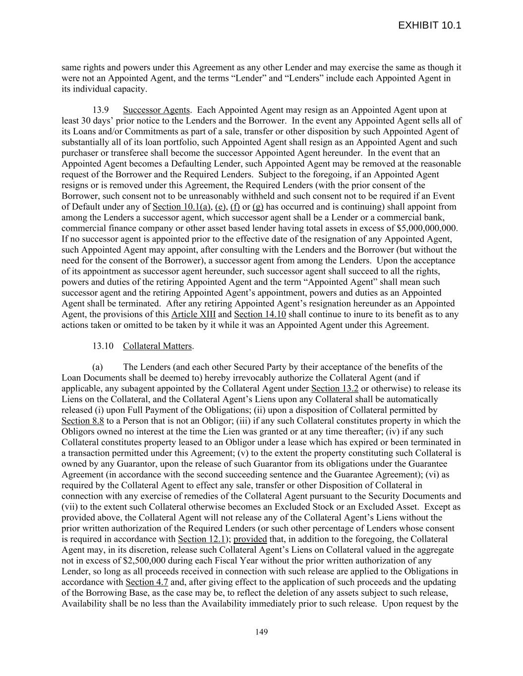 same rights and powers under this Agreement as any other Lender and may exercise the same as though it were not an Appointed Agent, and the terms “Lender” and “Lenders” include each Appointed Agent in its individual capacity. 13.9 Successor Agents. Each Appointed Agent may resign as an Appointed Agent upon at least 30 days’ prior notice to the Lenders and the Borrower. In the event any Appointed Agent sells all of its Loans and/or Commitments as part of a sale, transfer or other disposition by such Appointed Agent of substantially all of its loan portfolio, such Appointed Agent shall resign as an Appointed Agent and such purchaser or transferee shall become the successor Appointed Agent hereunder. In the event that an Appointed Agent becomes a Defaulting Lender, such Appointed Agent may be removed at the reasonable request of the Borrower and the Required Lenders. Subject to the foregoing, if an Appointed Agent resigns or is removed under this Agreement, the Required Lenders (with the prior consent of the Borrower, such consent not to be unreasonably withheld and such consent not to be required if an Event of Default under any of Section 10.1(a), (e), (f) or (g) has occurred and is continuing) shall appoint from among the Lenders a successor agent, which successor agent shall be a Lender or a commercial bank, commercial finance company or other asset based lender having total assets in excess of $5,000,000,000. If no successor agent is appointed prior to the effective date of the resignation of any Appointed Agent, such Appointed Agent may appoint, after consulting with the Lenders and the Borrower (but without the need for the consent of the Borrower), a successor agent from among the Lenders. Upon the acceptance of its appointment as successor agent hereunder, such successor agent shall succeed to all the rights, powers and duties of the retiring Appointed Agent and the term “Appointed Agent” shall mean such successor agent and the retiring Appointed Agent’s appointment, powers and duties as an Appointed Agent shall be terminated. After any retiring Appointed Agent’s resignation hereunder as an Appointed Agent, the provisions of this Article XIII and Section 14.10 shall continue to inure to its benefit as to any actions taken or omitted to be taken by it while it was an Appointed Agent under this Agreement. 13.10 Collateral Matters. (a) The Lenders (and each other Secured Party by their acceptance of the benefits of the Loan Documents shall be deemed to) hereby irrevocably authorize the Collateral Agent (and if applicable, any subagent appointed by the Collateral Agent under Section 13.2 or otherwise) to release its Liens on the Collateral, and the Collateral Agent’s Liens upon any Collateral shall be automatically released (i) upon Full Payment of the Obligations; (ii) upon a disposition of Collateral permitted by Section 8.8 to a Person that is not an Obligor; (iii) if any such Collateral constitutes property in which the Obligors owned no interest at the time the Lien was granted or at any time thereafter; (iv) if any such Collateral constitutes property leased to an Obligor under a lease which has expired or been terminated in a transaction permitted under this Agreement; (v) to the extent the property constituting such Collateral is owned by any Guarantor, upon the release of such Guarantor from its obligations under the Guarantee Agreement (in accordance with the second succeeding sentence and the Guarantee Agreement); (vi) as required by the Collateral Agent to effect any sale, transfer or other Disposition of Collateral in connection with any exercise of remedies of the Collateral Agent pursuant to the Security Documents and (vii) to the extent such Collateral otherwise becomes an Excluded Stock or an Excluded Asset. Except as provided above, the Collateral Agent will not release any of the Collateral Agent’s Liens without the prior written authorization of the Required Lenders (or such other percentage of Lenders whose consent is required in accordance with Section 12.1); provided that, in addition to the foregoing, the Collateral Agent may, in its discretion, release such Collateral Agent’s Liens on Collateral valued in the aggregate not in excess of $2,500,000 during each Fiscal Year without the prior written authorization of any Lender, so long as all proceeds received in connection with such release are applied to the Obligations in accordance with Section 4.7 and, after giving effect to the application of such proceeds and the updating of the Borrowing Base, as the case may be, to reflect the deletion of any assets subject to such release, Availability shall be no less than the Availability immediately prior to such release. Upon request by the 149 EXHIBIT 10.1