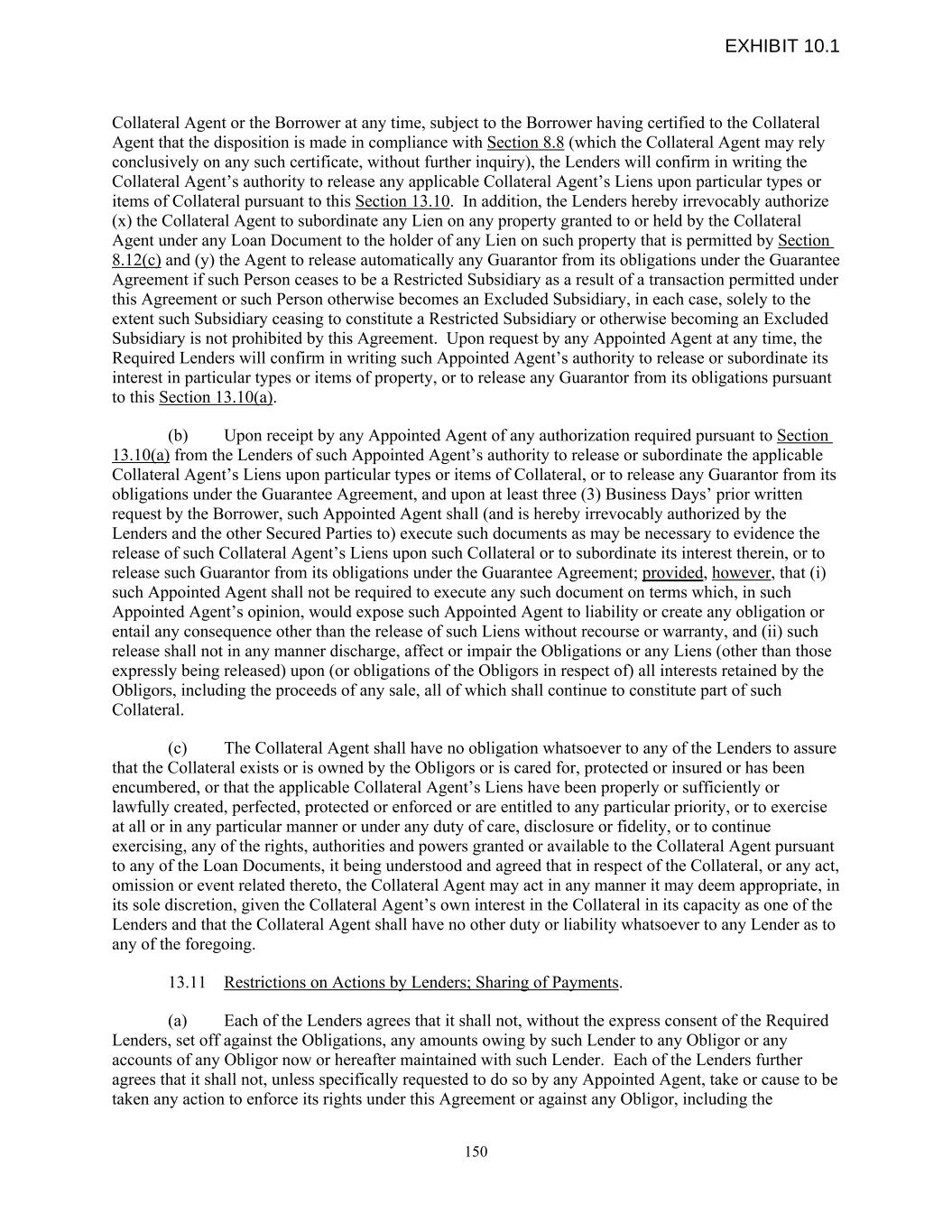 Collateral Agent or the Borrower at any time, subject to the Borrower having certified to the Collateral Agent that the disposition is made in compliance with Section 8.8 (which the Collateral Agent may rely conclusively on any such certificate, without further inquiry), the Lenders will confirm in writing the Collateral Agent’s authority to release any applicable Collateral Agent’s Liens upon particular types or items of Collateral pursuant to this Section 13.10. In addition, the Lenders hereby irrevocably authorize (x) the Collateral Agent to subordinate any Lien on any property granted to or held by the Collateral Agent under any Loan Document to the holder of any Lien on such property that is permitted by Section 8.12(c) and (y) the Agent to release automatically any Guarantor from its obligations under the Guarantee Agreement if such Person ceases to be a Restricted Subsidiary as a result of a transaction permitted under this Agreement or such Person otherwise becomes an Excluded Subsidiary, in each case, solely to the extent such Subsidiary ceasing to constitute a Restricted Subsidiary or otherwise becoming an Excluded Subsidiary is not prohibited by this Agreement. Upon request by any Appointed Agent at any time, the Required Lenders will confirm in writing such Appointed Agent’s authority to release or subordinate its interest in particular types or items of property, or to release any Guarantor from its obligations pursuant to this Section 13.10(a). (b) Upon receipt by any Appointed Agent of any authorization required pursuant to Section 13.10(a) from the Lenders of such Appointed Agent’s authority to release or subordinate the applicable Collateral Agent’s Liens upon particular types or items of Collateral, or to release any Guarantor from its obligations under the Guarantee Agreement, and upon at least three (3) Business Days’ prior written request by the Borrower, such Appointed Agent shall (and is hereby irrevocably authorized by the Lenders and the other Secured Parties to) execute such documents as may be necessary to evidence the release of such Collateral Agent’s Liens upon such Collateral or to subordinate its interest therein, or to release such Guarantor from its obligations under the Guarantee Agreement; provided, however, that (i) such Appointed Agent shall not be required to execute any such document on terms which, in such Appointed Agent’s opinion, would expose such Appointed Agent to liability or create any obligation or entail any consequence other than the release of such Liens without recourse or warranty, and (ii) such release shall not in any manner discharge, affect or impair the Obligations or any Liens (other than those expressly being released) upon (or obligations of the Obligors in respect of) all interests retained by the Obligors, including the proceeds of any sale, all of which shall continue to constitute part of such Collateral. (c) The Collateral Agent shall have no obligation whatsoever to any of the Lenders to assure that the Collateral exists or is owned by the Obligors or is cared for, protected or insured or has been encumbered, or that the applicable Collateral Agent’s Liens have been properly or sufficiently or lawfully created, perfected, protected or enforced or are entitled to any particular priority, or to exercise at all or in any particular manner or under any duty of care, disclosure or fidelity, or to continue exercising, any of the rights, authorities and powers granted or available to the Collateral Agent pursuant to any of the Loan Documents, it being understood and agreed that in respect of the Collateral, or any act, omission or event related thereto, the Collateral Agent may act in any manner it may deem appropriate, in its sole discretion, given the Collateral Agent’s own interest in the Collateral in its capacity as one of the Lenders and that the Collateral Agent shall have no other duty or liability whatsoever to any Lender as to any of the foregoing. 13.11 Restrictions on Actions by Lenders; Sharing of Payments. (a) Each of the Lenders agrees that it shall not, without the express consent of the Required Lenders, set off against the Obligations, any amounts owing by such Lender to any Obligor or any accounts of any Obligor now or hereafter maintained with such Lender. Each of the Lenders further agrees that it shall not, unless specifically requested to do so by any Appointed Agent, take or cause to be taken any action to enforce its rights under this Agreement or against any Obligor, including the 150 EXHIBIT 10.1