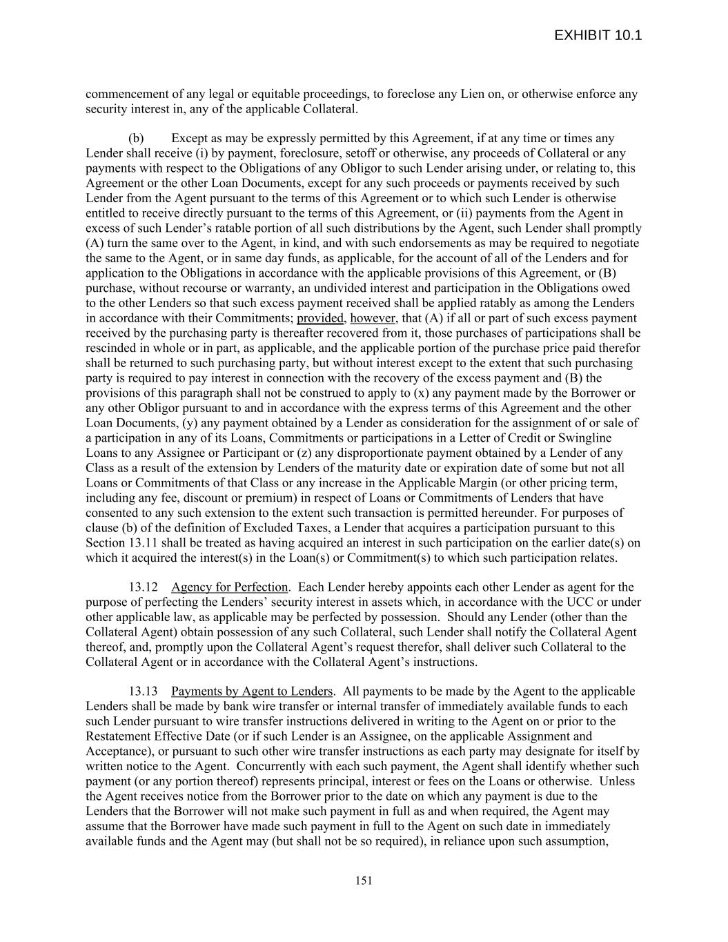 commencement of any legal or equitable proceedings, to foreclose any Lien on, or otherwise enforce any security interest in, any of the applicable Collateral. (b) Except as may be expressly permitted by this Agreement, if at any time or times any Lender shall receive (i) by payment, foreclosure, setoff or otherwise, any proceeds of Collateral or any payments with respect to the Obligations of any Obligor to such Lender arising under, or relating to, this Agreement or the other Loan Documents, except for any such proceeds or payments received by such Lender from the Agent pursuant to the terms of this Agreement or to which such Lender is otherwise entitled to receive directly pursuant to the terms of this Agreement, or (ii) payments from the Agent in excess of such Lender’s ratable portion of all such distributions by the Agent, such Lender shall promptly (A) turn the same over to the Agent, in kind, and with such endorsements as may be required to negotiate the same to the Agent, or in same day funds, as applicable, for the account of all of the Lenders and for application to the Obligations in accordance with the applicable provisions of this Agreement, or (B) purchase, without recourse or warranty, an undivided interest and participation in the Obligations owed to the other Lenders so that such excess payment received shall be applied ratably as among the Lenders in accordance with their Commitments; provided, however, that (A) if all or part of such excess payment received by the purchasing party is thereafter recovered from it, those purchases of participations shall be rescinded in whole or in part, as applicable, and the applicable portion of the purchase price paid therefor shall be returned to such purchasing party, but without interest except to the extent that such purchasing party is required to pay interest in connection with the recovery of the excess payment and (B) the provisions of this paragraph shall not be construed to apply to (x) any payment made by the Borrower or any other Obligor pursuant to and in accordance with the express terms of this Agreement and the other Loan Documents, (y) any payment obtained by a Lender as consideration for the assignment of or sale of a participation in any of its Loans, Commitments or participations in a Letter of Credit or Swingline Loans to any Assignee or Participant or (z) any disproportionate payment obtained by a Lender of any Class as a result of the extension by Lenders of the maturity date or expiration date of some but not all Loans or Commitments of that Class or any increase in the Applicable Margin (or other pricing term, including any fee, discount or premium) in respect of Loans or Commitments of Lenders that have consented to any such extension to the extent such transaction is permitted hereunder. For purposes of clause (b) of the definition of Excluded Taxes, a Lender that acquires a participation pursuant to this Section 13.11 shall be treated as having acquired an interest in such participation on the earlier date(s) on which it acquired the interest(s) in the Loan(s) or Commitment(s) to which such participation relates. 13.12 Agency for Perfection. Each Lender hereby appoints each other Lender as agent for the purpose of perfecting the Lenders’ security interest in assets which, in accordance with the UCC or under other applicable law, as applicable may be perfected by possession. Should any Lender (other than the Collateral Agent) obtain possession of any such Collateral, such Lender shall notify the Collateral Agent thereof, and, promptly upon the Collateral Agent’s request therefor, shall deliver such Collateral to the Collateral Agent or in accordance with the Collateral Agent’s instructions. 13.13 Payments by Agent to Lenders. All payments to be made by the Agent to the applicable Lenders shall be made by bank wire transfer or internal transfer of immediately available funds to each such Lender pursuant to wire transfer instructions delivered in writing to the Agent on or prior to the Restatement Effective Date (or if such Lender is an Assignee, on the applicable Assignment and Acceptance), or pursuant to such other wire transfer instructions as each party may designate for itself by written notice to the Agent. Concurrently with each such payment, the Agent shall identify whether such payment (or any portion thereof) represents principal, interest or fees on the Loans or otherwise. Unless the Agent receives notice from the Borrower prior to the date on which any payment is due to the Lenders that the Borrower will not make such payment in full as and when required, the Agent may assume that the Borrower have made such payment in full to the Agent on such date in immediately available funds and the Agent may (but shall not be so required), in reliance upon such assumption, 151 EXHIBIT 10.1