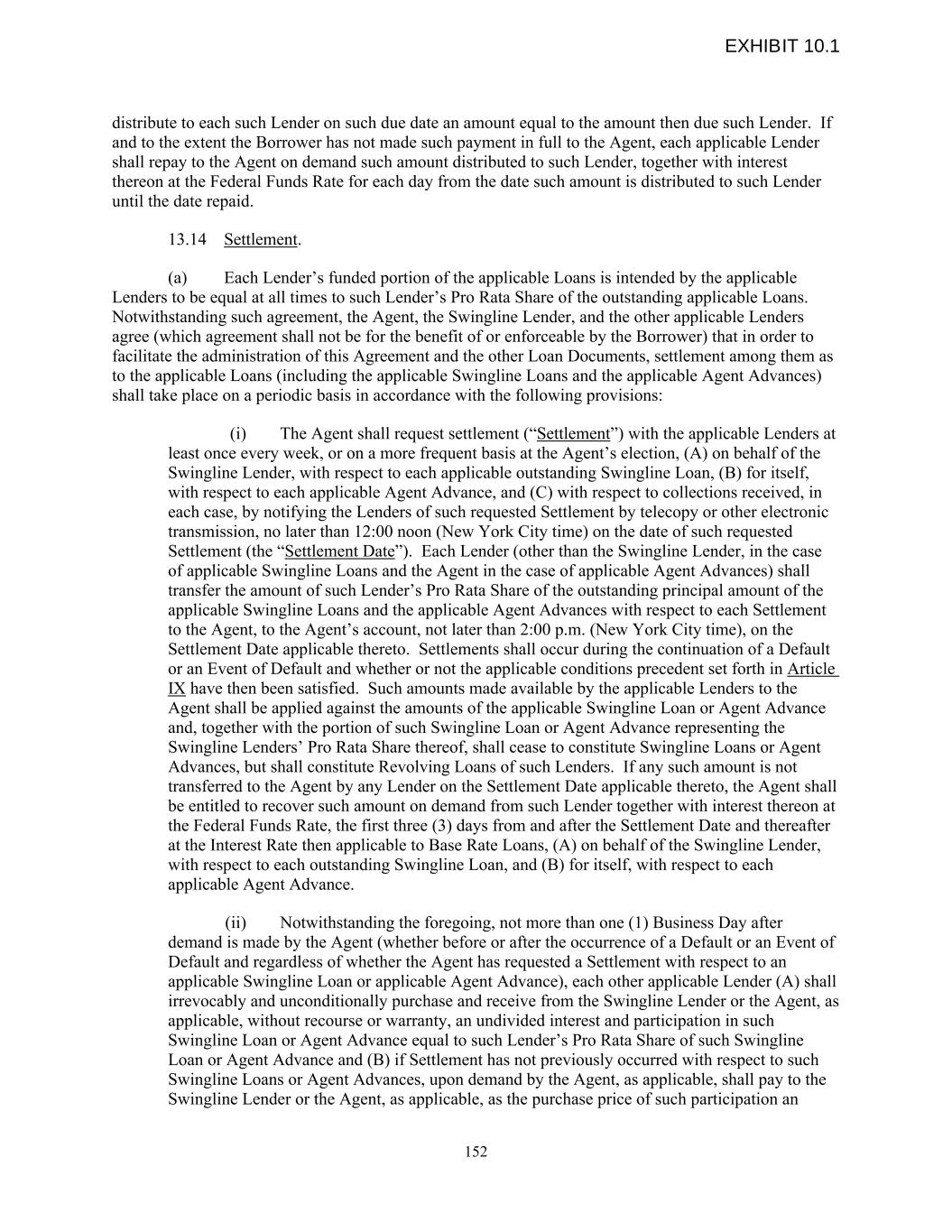 distribute to each such Lender on such due date an amount equal to the amount then due such Lender. If and to the extent the Borrower has not made such payment in full to the Agent, each applicable Lender shall repay to the Agent on demand such amount distributed to such Lender, together with interest thereon at the Federal Funds Rate for each day from the date such amount is distributed to such Lender until the date repaid. 13.14 Settlement. (a) Each Lender’s funded portion of the applicable Loans is intended by the applicable Lenders to be equal at all times to such Lender’s Pro Rata Share of the outstanding applicable Loans. Notwithstanding such agreement, the Agent, the Swingline Lender, and the other applicable Lenders agree (which agreement shall not be for the benefit of or enforceable by the Borrower) that in order to facilitate the administration of this Agreement and the other Loan Documents, settlement among them as to the applicable Loans (including the applicable Swingline Loans and the applicable Agent Advances) shall take place on a periodic basis in accordance with the following provisions: (i) The Agent shall request settlement (“Settlement”) with the applicable Lenders at least once every week, or on a more frequent basis at the Agent’s election, (A) on behalf of the Swingline Lender, with respect to each applicable outstanding Swingline Loan, (B) for itself, with respect to each applicable Agent Advance, and (C) with respect to collections received, in each case, by notifying the Lenders of such requested Settlement by telecopy or other electronic transmission, no later than 12:00 noon (New York City time) on the date of such requested Settlement (the “Settlement Date”). Each Lender (other than the Swingline Lender, in the case of applicable Swingline Loans and the Agent in the case of applicable Agent Advances) shall transfer the amount of such Lender’s Pro Rata Share of the outstanding principal amount of the applicable Swingline Loans and the applicable Agent Advances with respect to each Settlement to the Agent, to the Agent’s account, not later than 2:00 p.m. (New York City time), on the Settlement Date applicable thereto. Settlements shall occur during the continuation of a Default or an Event of Default and whether or not the applicable conditions precedent set forth in Article IX have then been satisfied. Such amounts made available by the applicable Lenders to the Agent shall be applied against the amounts of the applicable Swingline Loan or Agent Advance and, together with the portion of such Swingline Loan or Agent Advance representing the Swingline Lenders’ Pro Rata Share thereof, shall cease to constitute Swingline Loans or Agent Advances, but shall constitute Revolving Loans of such Lenders. If any such amount is not transferred to the Agent by any Lender on the Settlement Date applicable thereto, the Agent shall be entitled to recover such amount on demand from such Lender together with interest thereon at the Federal Funds Rate, the first three (3) days from and after the Settlement Date and thereafter at the Interest Rate then applicable to Base Rate Loans, (A) on behalf of the Swingline Lender, with respect to each outstanding Swingline Loan, and (B) for itself, with respect to each applicable Agent Advance. (ii) Notwithstanding the foregoing, not more than one (1) Business Day after demand is made by the Agent (whether before or after the occurrence of a Default or an Event of Default and regardless of whether the Agent has requested a Settlement with respect to an applicable Swingline Loan or applicable Agent Advance), each other applicable Lender (A) shall irrevocably and unconditionally purchase and receive from the Swingline Lender or the Agent, as applicable, without recourse or warranty, an undivided interest and participation in such Swingline Loan or Agent Advance equal to such Lender’s Pro Rata Share of such Swingline Loan or Agent Advance and (B) if Settlement has not previously occurred with respect to such Swingline Loans or Agent Advances, upon demand by the Agent, as applicable, shall pay to the Swingline Lender or the Agent, as applicable, as the purchase price of such participation an 152 EXHIBIT 10.1
