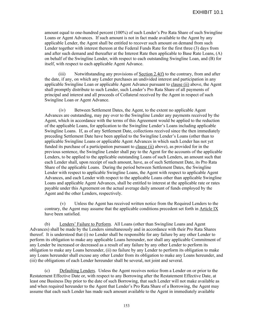 amount equal to one-hundred percent (100%) of such Lender’s Pro Rata Share of such Swingline Loans or Agent Advances. If such amount is not in fact made available to the Agent by any applicable Lender, the Agent shall be entitled to recover such amount on demand from such Lender together with interest thereon at the Federal Funds Rate for the first three (3) days from and after such demand and thereafter at the Interest Rate then applicable to Base Rate Loans, (A) on behalf of the Swingline Lender, with respect to each outstanding Swingline Loan, and (B) for itself, with respect to each applicable Agent Advance. (iii) Notwithstanding any provisions of Section 2.4(f) to the contrary, from and after the date, if any, on which any Lender purchases an undivided interest and participation in any applicable Swingline Loan or applicable Agent Advance pursuant to clause (ii) above, the Agent shall promptly distribute to such Lender, such Lender’s Pro Rata Share of all payments of principal and interest and all proceeds of Collateral received by the Agent in respect of such Swingline Loan or Agent Advance. (iv) Between Settlement Dates, the Agent, to the extent no applicable Agent Advances are outstanding, may pay over to the Swingline Lender any payments received by the Agent, which in accordance with the terms of this Agreement would be applied to the reduction of the applicable Loans, for application to the Swingline Lender’s Loans including applicable Swingline Loans. If, as of any Settlement Date, collections received since the then immediately preceding Settlement Date have been applied to the Swingline Lender’s Loans (other than to applicable Swingline Loans or applicable Agent Advances in which such Lender has not yet funded its purchase of a participation pursuant to clause (ii) above), as provided for in the previous sentence, the Swingline Lender shall pay to the Agent for the accounts of the applicable Lenders, to be applied to the applicable outstanding Loans of such Lenders, an amount such that each Lender shall, upon receipt of such amount, have, as of such Settlement Date, its Pro Rata Share of the applicable Loans. During the period between Settlement Dates, the Swingline Lender with respect to applicable Swingline Loans, the Agent with respect to applicable Agent Advances, and each Lender with respect to the applicable Loans other than applicable Swingline Loans and applicable Agent Advances, shall be entitled to interest at the applicable rate or rates payable under this Agreement on the actual average daily amount of funds employed by the Agent and the other Lenders, respectively. (v) Unless the Agent has received written notice from the Required Lenders to the contrary, the Agent may assume that the applicable conditions precedent set forth in Article IX have been satisfied. (b) Lenders’ Failure to Perform. All Loans (other than Swingline Loans and Agent Advances) shall be made by the Lenders simultaneously and in accordance with their Pro Rata Shares thereof. It is understood that (i) no Lender shall be responsible for any failure by any other Lender to perform its obligation to make any applicable Loans hereunder, nor shall any applicable Commitment of any Lender be increased or decreased as a result of any failure by any other Lender to perform its obligation to make any Loans hereunder, (ii) no failure by any Lender to perform its obligation to make any Loans hereunder shall excuse any other Lender from its obligation to make any Loans hereunder, and (iii) the obligations of each Lender hereunder shall be several, not joint and several. (c) Defaulting Lenders. Unless the Agent receives notice from a Lender on or prior to the Restatement Effective Date or, with respect to any Borrowing after the Restatement Effective Date, at least one Business Day prior to the date of such Borrowing, that such Lender will not make available as and when required hereunder to the Agent that Lender’s Pro Rata Share of a Borrowing, the Agent may assume that each such Lender has made such amount available to the Agent in immediately available 153 EXHIBIT 10.1