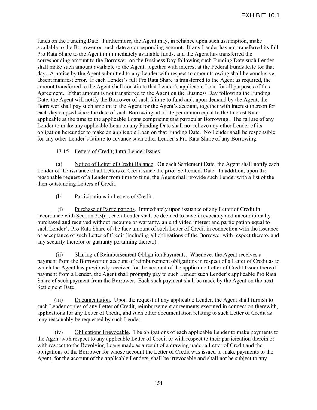 funds on the Funding Date. Furthermore, the Agent may, in reliance upon such assumption, make available to the Borrower on such date a corresponding amount. If any Lender has not transferred its full Pro Rata Share to the Agent in immediately available funds, and the Agent has transferred the corresponding amount to the Borrower, on the Business Day following such Funding Date such Lender shall make such amount available to the Agent, together with interest at the Federal Funds Rate for that day. A notice by the Agent submitted to any Lender with respect to amounts owing shall be conclusive, absent manifest error. If each Lender’s full Pro Rata Share is transferred to the Agent as required, the amount transferred to the Agent shall constitute that Lender’s applicable Loan for all purposes of this Agreement. If that amount is not transferred to the Agent on the Business Day following the Funding Date, the Agent will notify the Borrower of such failure to fund and, upon demand by the Agent, the Borrower shall pay such amount to the Agent for the Agent’s account, together with interest thereon for each day elapsed since the date of such Borrowing, at a rate per annum equal to the Interest Rate applicable at the time to the applicable Loans comprising that particular Borrowing. The failure of any Lender to make any applicable Loan on any Funding Date shall not relieve any other Lender of its obligation hereunder to make an applicable Loan on that Funding Date. No Lender shall be responsible for any other Lender’s failure to advance such other Lender’s Pro Rata Share of any Borrowing. 13.15 Letters of Credit; Intra-Lender Issues. (a) Notice of Letter of Credit Balance. On each Settlement Date, the Agent shall notify each Lender of the issuance of all Letters of Credit since the prior Settlement Date. In addition, upon the reasonable request of a Lender from time to time, the Agent shall provide such Lender with a list of the then-outstanding Letters of Credit. (b) Participations in Letters of Credit. (i) Purchase of Participations. Immediately upon issuance of any Letter of Credit in accordance with Section 2.3(d), each Lender shall be deemed to have irrevocably and unconditionally purchased and received without recourse or warranty, an undivided interest and participation equal to such Lender’s Pro Rata Share of the face amount of such Letter of Credit in connection with the issuance or acceptance of such Letter of Credit (including all obligations of the Borrower with respect thereto, and any security therefor or guaranty pertaining thereto). (ii) Sharing of Reimbursement Obligation Payments. Whenever the Agent receives a payment from the Borrower on account of reimbursement obligations in respect of a Letter of Credit as to which the Agent has previously received for the account of the applicable Letter of Credit Issuer thereof payment from a Lender, the Agent shall promptly pay to such Lender such Lender’s applicable Pro Rata Share of such payment from the Borrower. Each such payment shall be made by the Agent on the next Settlement Date. (iii) Documentation. Upon the request of any applicable Lender, the Agent shall furnish to such Lender copies of any Letter of Credit, reimbursement agreements executed in connection therewith, applications for any Letter of Credit, and such other documentation relating to such Letter of Credit as may reasonably be requested by such Lender. (iv) Obligations Irrevocable. The obligations of each applicable Lender to make payments to the Agent with respect to any applicable Letter of Credit or with respect to their participation therein or with respect to the Revolving Loans made as a result of a drawing under a Letter of Credit and the obligations of the Borrower for whose account the Letter of Credit was issued to make payments to the Agent, for the account of the applicable Lenders, shall be irrevocable and shall not be subject to any 154 EXHIBIT 10.1