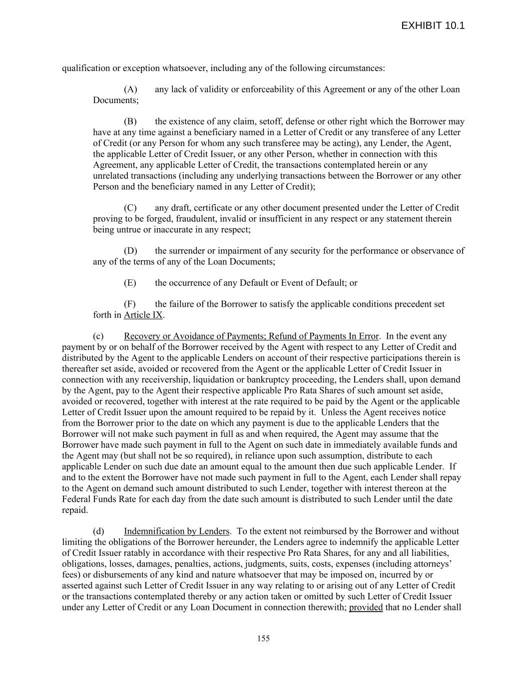 qualification or exception whatsoever, including any of the following circumstances: (A) any lack of validity or enforceability of this Agreement or any of the other Loan Documents; (B) the existence of any claim, setoff, defense or other right which the Borrower may have at any time against a beneficiary named in a Letter of Credit or any transferee of any Letter of Credit (or any Person for whom any such transferee may be acting), any Lender, the Agent, the applicable Letter of Credit Issuer, or any other Person, whether in connection with this Agreement, any applicable Letter of Credit, the transactions contemplated herein or any unrelated transactions (including any underlying transactions between the Borrower or any other Person and the beneficiary named in any Letter of Credit); (C) any draft, certificate or any other document presented under the Letter of Credit proving to be forged, fraudulent, invalid or insufficient in any respect or any statement therein being untrue or inaccurate in any respect; (D) the surrender or impairment of any security for the performance or observance of any of the terms of any of the Loan Documents; (E) the occurrence of any Default or Event of Default; or (F) the failure of the Borrower to satisfy the applicable conditions precedent set forth in Article IX. (c) Recovery or Avoidance of Payments; Refund of Payments In Error. In the event any payment by or on behalf of the Borrower received by the Agent with respect to any Letter of Credit and distributed by the Agent to the applicable Lenders on account of their respective participations therein is thereafter set aside, avoided or recovered from the Agent or the applicable Letter of Credit Issuer in connection with any receivership, liquidation or bankruptcy proceeding, the Lenders shall, upon demand by the Agent, pay to the Agent their respective applicable Pro Rata Shares of such amount set aside, avoided or recovered, together with interest at the rate required to be paid by the Agent or the applicable Letter of Credit Issuer upon the amount required to be repaid by it. Unless the Agent receives notice from the Borrower prior to the date on which any payment is due to the applicable Lenders that the Borrower will not make such payment in full as and when required, the Agent may assume that the Borrower have made such payment in full to the Agent on such date in immediately available funds and the Agent may (but shall not be so required), in reliance upon such assumption, distribute to each applicable Lender on such due date an amount equal to the amount then due such applicable Lender. If and to the extent the Borrower have not made such payment in full to the Agent, each Lender shall repay to the Agent on demand such amount distributed to such Lender, together with interest thereon at the Federal Funds Rate for each day from the date such amount is distributed to such Lender until the date repaid. (d) Indemnification by Lenders. To the extent not reimbursed by the Borrower and without limiting the obligations of the Borrower hereunder, the Lenders agree to indemnify the applicable Letter of Credit Issuer ratably in accordance with their respective Pro Rata Shares, for any and all liabilities, obligations, losses, damages, penalties, actions, judgments, suits, costs, expenses (including attorneys’ fees) or disbursements of any kind and nature whatsoever that may be imposed on, incurred by or asserted against such Letter of Credit Issuer in any way relating to or arising out of any Letter of Credit or the transactions contemplated thereby or any action taken or omitted by such Letter of Credit Issuer under any Letter of Credit or any Loan Document in connection therewith; provided that no Lender shall 155 EXHIBIT 10.1