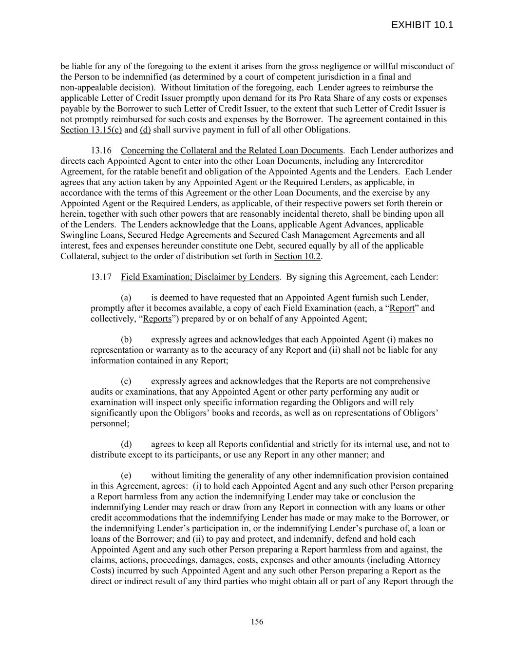 be liable for any of the foregoing to the extent it arises from the gross negligence or willful misconduct of the Person to be indemnified (as determined by a court of competent jurisdiction in a final and non-appealable decision). Without limitation of the foregoing, each Lender agrees to reimburse the applicable Letter of Credit Issuer promptly upon demand for its Pro Rata Share of any costs or expenses payable by the Borrower to such Letter of Credit Issuer, to the extent that such Letter of Credit Issuer is not promptly reimbursed for such costs and expenses by the Borrower. The agreement contained in this Section 13.15(c) and (d) shall survive payment in full of all other Obligations. 13.16 Concerning the Collateral and the Related Loan Documents. Each Lender authorizes and directs each Appointed Agent to enter into the other Loan Documents, including any Intercreditor Agreement, for the ratable benefit and obligation of the Appointed Agents and the Lenders. Each Lender agrees that any action taken by any Appointed Agent or the Required Lenders, as applicable, in accordance with the terms of this Agreement or the other Loan Documents, and the exercise by any Appointed Agent or the Required Lenders, as applicable, of their respective powers set forth therein or herein, together with such other powers that are reasonably incidental thereto, shall be binding upon all of the Lenders. The Lenders acknowledge that the Loans, applicable Agent Advances, applicable Swingline Loans, Secured Hedge Agreements and Secured Cash Management Agreements and all interest, fees and expenses hereunder constitute one Debt, secured equally by all of the applicable Collateral, subject to the order of distribution set forth in Section 10.2. 13.17 Field Examination; Disclaimer by Lenders. By signing this Agreement, each Lender: (a) is deemed to have requested that an Appointed Agent furnish such Lender, promptly after it becomes available, a copy of each Field Examination (each, a “Report” and collectively, “Reports”) prepared by or on behalf of any Appointed Agent; (b) expressly agrees and acknowledges that each Appointed Agent (i) makes no representation or warranty as to the accuracy of any Report and (ii) shall not be liable for any information contained in any Report; (c) expressly agrees and acknowledges that the Reports are not comprehensive audits or examinations, that any Appointed Agent or other party performing any audit or examination will inspect only specific information regarding the Obligors and will rely significantly upon the Obligors’ books and records, as well as on representations of Obligors’ personnel; (d) agrees to keep all Reports confidential and strictly for its internal use, and not to distribute except to its participants, or use any Report in any other manner; and (e) without limiting the generality of any other indemnification provision contained in this Agreement, agrees: (i) to hold each Appointed Agent and any such other Person preparing a Report harmless from any action the indemnifying Lender may take or conclusion the indemnifying Lender may reach or draw from any Report in connection with any loans or other credit accommodations that the indemnifying Lender has made or may make to the Borrower, or the indemnifying Lender’s participation in, or the indemnifying Lender’s purchase of, a loan or loans of the Borrower; and (ii) to pay and protect, and indemnify, defend and hold each Appointed Agent and any such other Person preparing a Report harmless from and against, the claims, actions, proceedings, damages, costs, expenses and other amounts (including Attorney Costs) incurred by such Appointed Agent and any such other Person preparing a Report as the direct or indirect result of any third parties who might obtain all or part of any Report through the 156 EXHIBIT 10.1