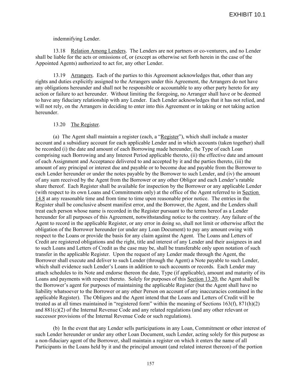 indemnifying Lender. 13.18 Relation Among Lenders. The Lenders are not partners or co-venturers, and no Lender shall be liable for the acts or omissions of, or (except as otherwise set forth herein in the case of the Appointed Agents) authorized to act for, any other Lender. 13.19 Arrangers. Each of the parties to this Agreement acknowledges that, other than any rights and duties explicitly assigned to the Arrangers under this Agreement, the Arrangers do not have any obligations hereunder and shall not be responsible or accountable to any other party hereto for any action or failure to act hereunder. Without limiting the foregoing, no Arranger shall have or be deemed to have any fiduciary relationship with any Lender. Each Lender acknowledges that it has not relied, and will not rely, on the Arrangers in deciding to enter into this Agreement or in taking or not taking action hereunder. 13.20 The Register. (a) The Agent shall maintain a register (each, a “Register”), which shall include a master account and a subsidiary account for each applicable Lender and in which accounts (taken together) shall be recorded (i) the date and amount of each Borrowing made hereunder, the Type of each Loan comprising such Borrowing and any Interest Period applicable thereto, (ii) the effective date and amount of each Assignment and Acceptance delivered to and accepted by it and the parties thereto, (iii) the amount of any principal or interest due and payable or to become due and payable from the Borrower to each Lender hereunder or under the notes payable by the Borrower to such Lender, and (iv) the amount of any sum received by the Agent from the Borrower or any other Obligor and each Lender’s ratable share thereof. Each Register shall be available for inspection by the Borrower or any applicable Lender (with respect to its own Loans and Commitments only) at the office of the Agent referred to in Section 14.8 at any reasonable time and from time to time upon reasonable prior notice. The entries in the Register shall be conclusive absent manifest error, and the Borrower, the Agent, and the Lenders shall treat each person whose name is recorded in the Register pursuant to the terms hereof as a Lender hereunder for all purposes of this Agreement, notwithstanding notice to the contrary. Any failure of the Agent to record in the applicable Register, or any error in doing so, shall not limit or otherwise affect the obligation of the Borrower hereunder (or under any Loan Document) to pay any amount owing with respect to the Loans or provide the basis for any claim against the Agent. The Loans and Letters of Credit are registered obligations and the right, title and interest of any Lender and their assignees in and to such Loans and Letters of Credit as the case may be, shall be transferable only upon notation of such transfer in the applicable Register. Upon the request of any Lender made through the Agent, the Borrower shall execute and deliver to such Lender (through the Agent) a Note payable to such Lender, which shall evidence such Lender’s Loans in addition to such accounts or records. Each Lender may attach schedules to its Note and endorse thereon the date, Type (if applicable), amount and maturity of its Loans and payments with respect thereto. Solely for purposes of this Section 13.20, the Agent shall be the Borrower’s agent for purposes of maintaining the applicable Register (but the Agent shall have no liability whatsoever to the Borrower or any other Person on account of any inaccuracies contained in the applicable Register). The Obligors and the Agent intend that the Loans and Letters of Credit will be treated as at all times maintained in “registered form” within the meaning of Sections 163(f), 871(h)(2) and 881(c)(2) of the Internal Revenue Code and any related regulations (and any other relevant or successor provisions of the Internal Revenue Code or such regulations). (b) In the event that any Lender sells participations in any Loan, Commitment or other interest of such Lender hereunder or under any other Loan Document, such Lender, acting solely for this purpose as a non-fiduciary agent of the Borrower, shall maintain a register on which it enters the name of all Participants in the Loans held by it and the principal amount (and related interest thereon) of the portion 157 EXHIBIT 10.1